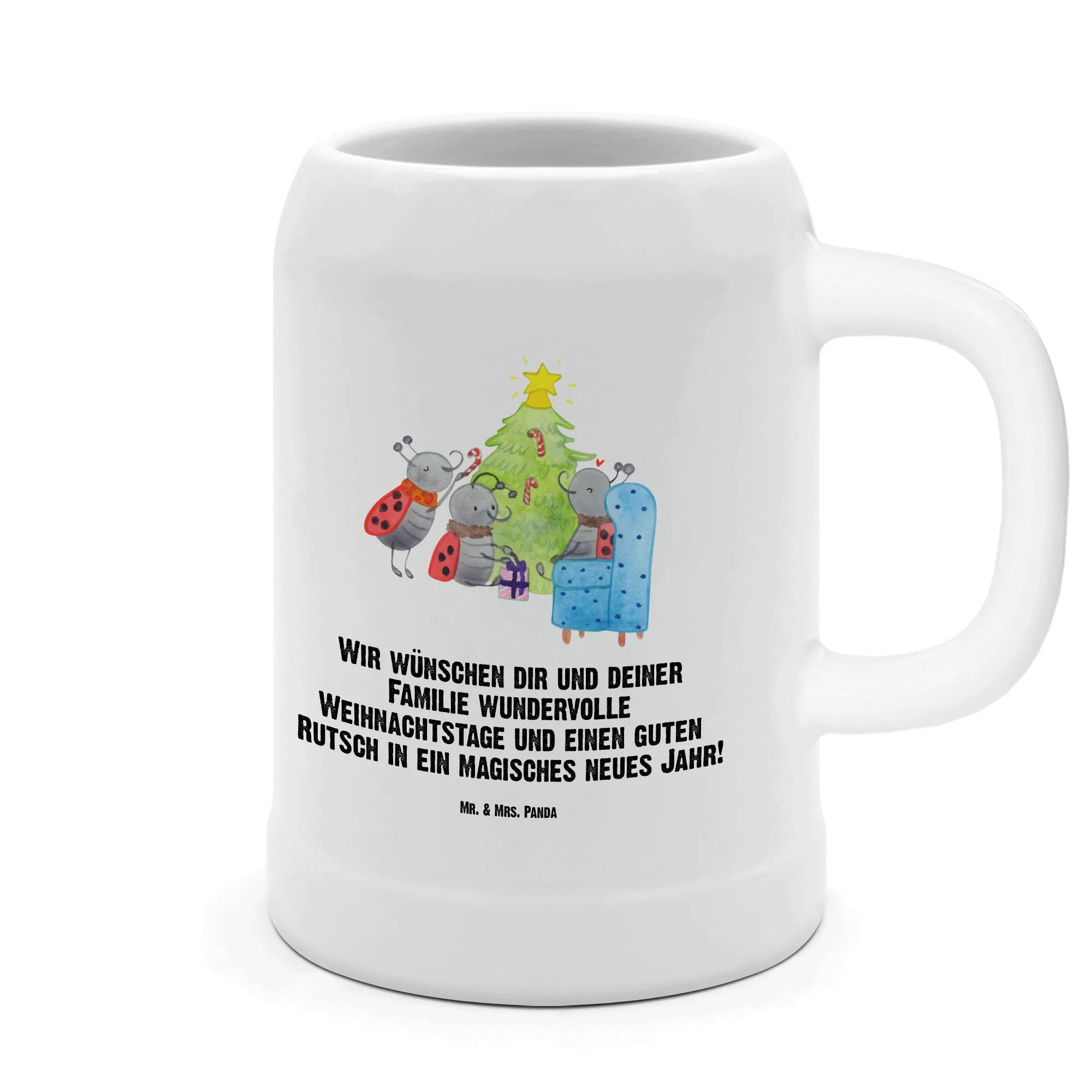 Entdecke den perfekten Bierkrug für die besinnliche Winterzeit - unseren bezaubernden Bierkrug mit dem Weihnachtsmotiv "Weihnachten Smörle" aus der Winter Kollektion von Mr. & Mrs. Panda. Dieser robusten Steingutkrug mit einer attraktiven Füllmenge von 500 ml ist nicht nur ein stilvolles Accessoire für gemütliche Bierabende, sondern bringt auch eine festliche Note in dein Zuhause. Das liebevoll handgezeichnete Motiv zeigt drei entzückende Marienkäfer, die um einen dekorierten Weihnachtsbaum herum geschäftig Geschenke auspacken und fröhlich ihren Baum mit Pfefferminzstangen schmücken. Perfekt für alle, die Weihnachten lieben und gerne ein kühles Bier genießen!