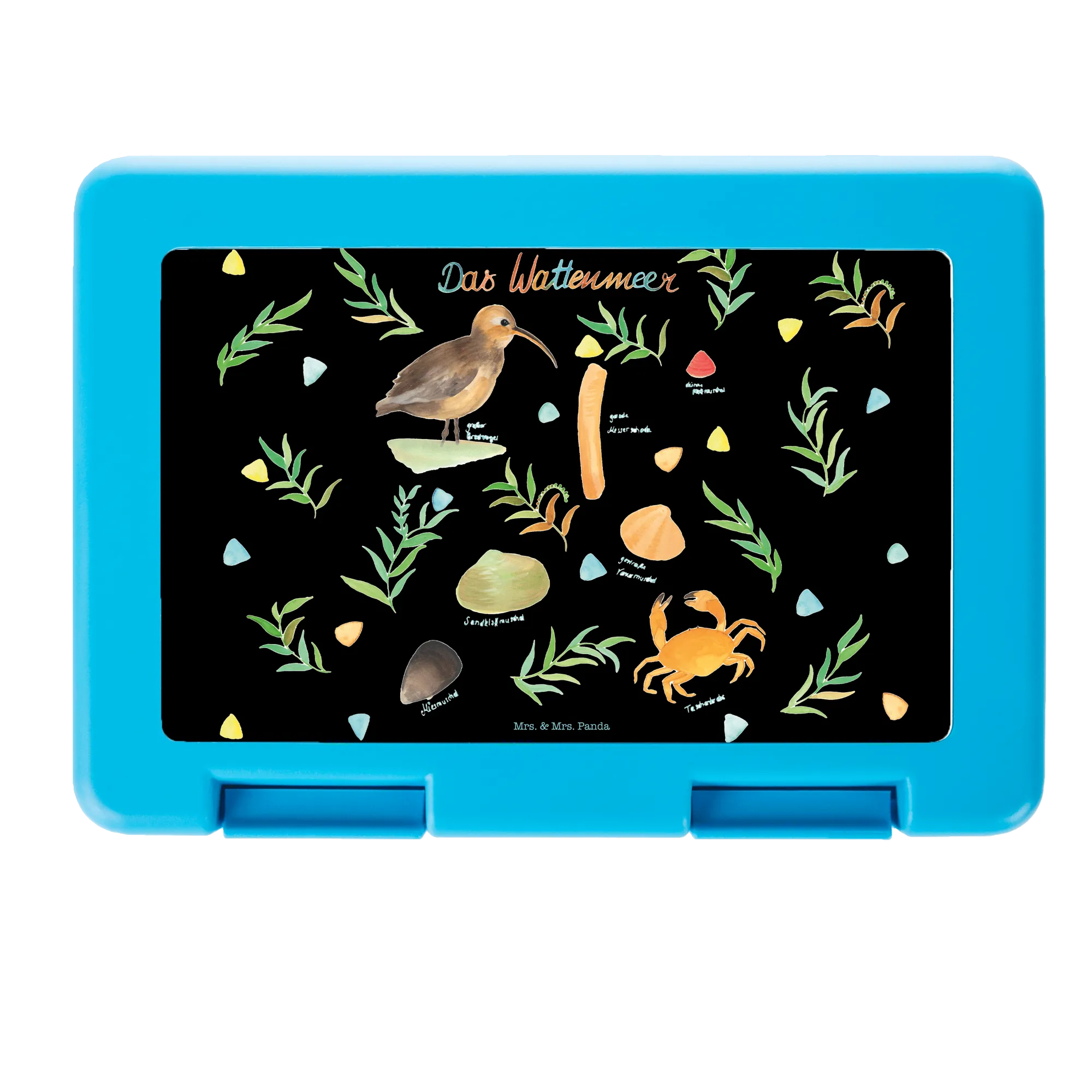 Das Motiv der Brotdose ist eine liebevolle Aquarellzeichnung, die verschiedene Tiere und Pflanzen des Wattenmeers darstellt, darunter den Großen Brachvogel, Seenebelwurm und Taschenkrebs sowie Muscheln und grünes Seegras. Der Slogan auf der Dose inspiriert dazu, sich für den Schutz des Wattenmeers einzusetzen und die Schönheit der Natur zu schätzen.