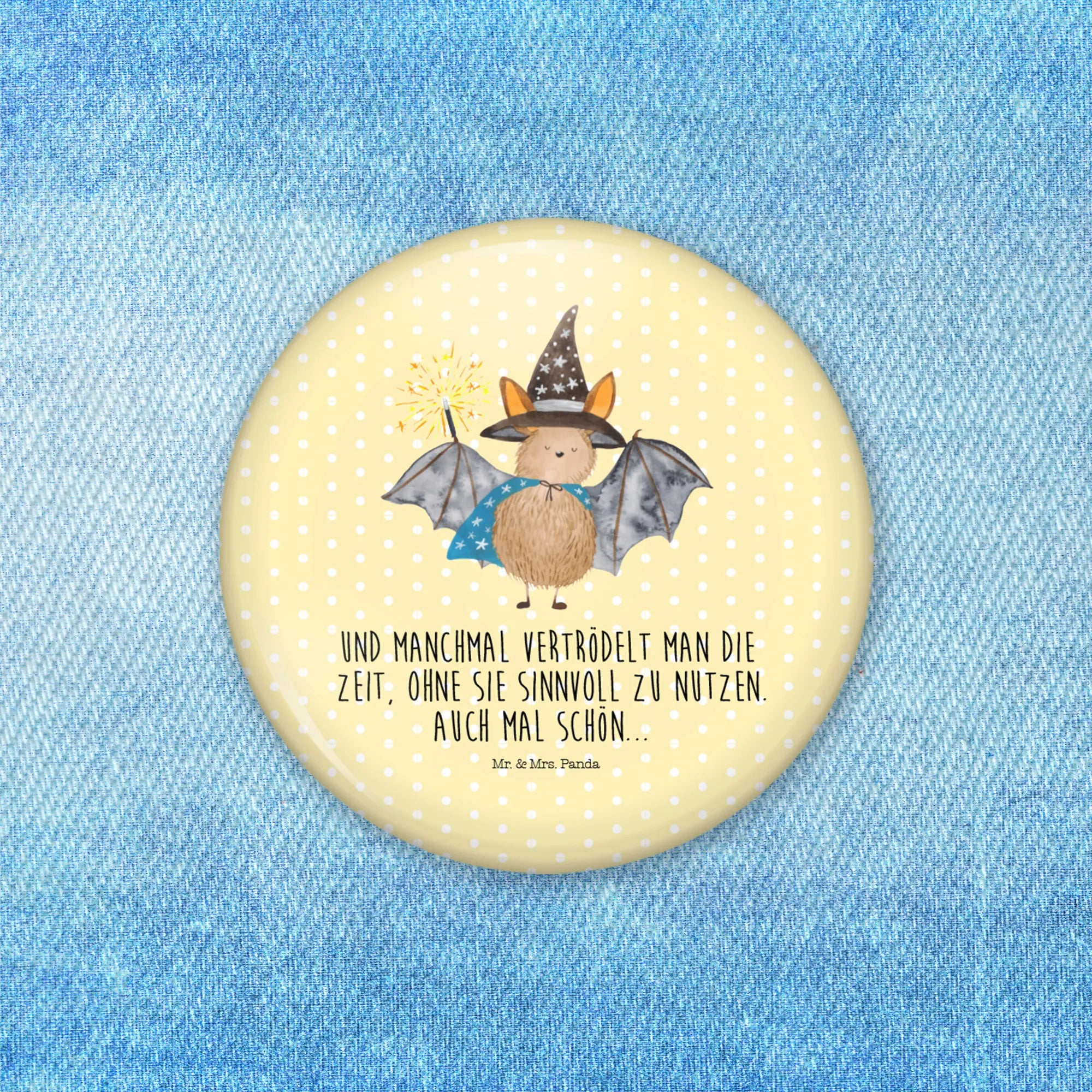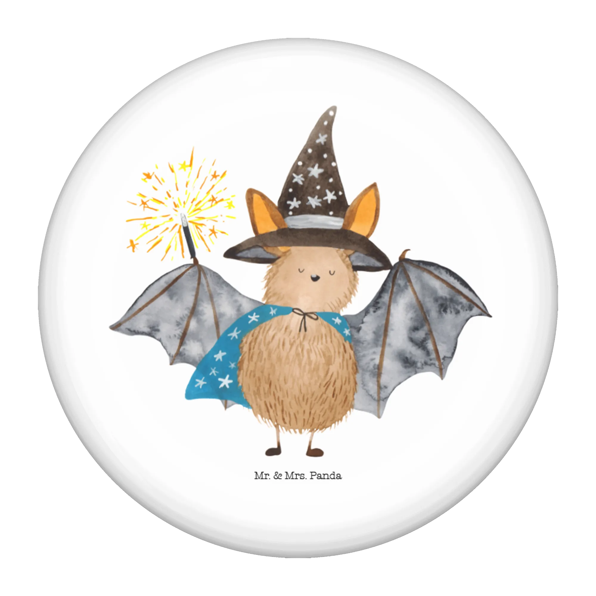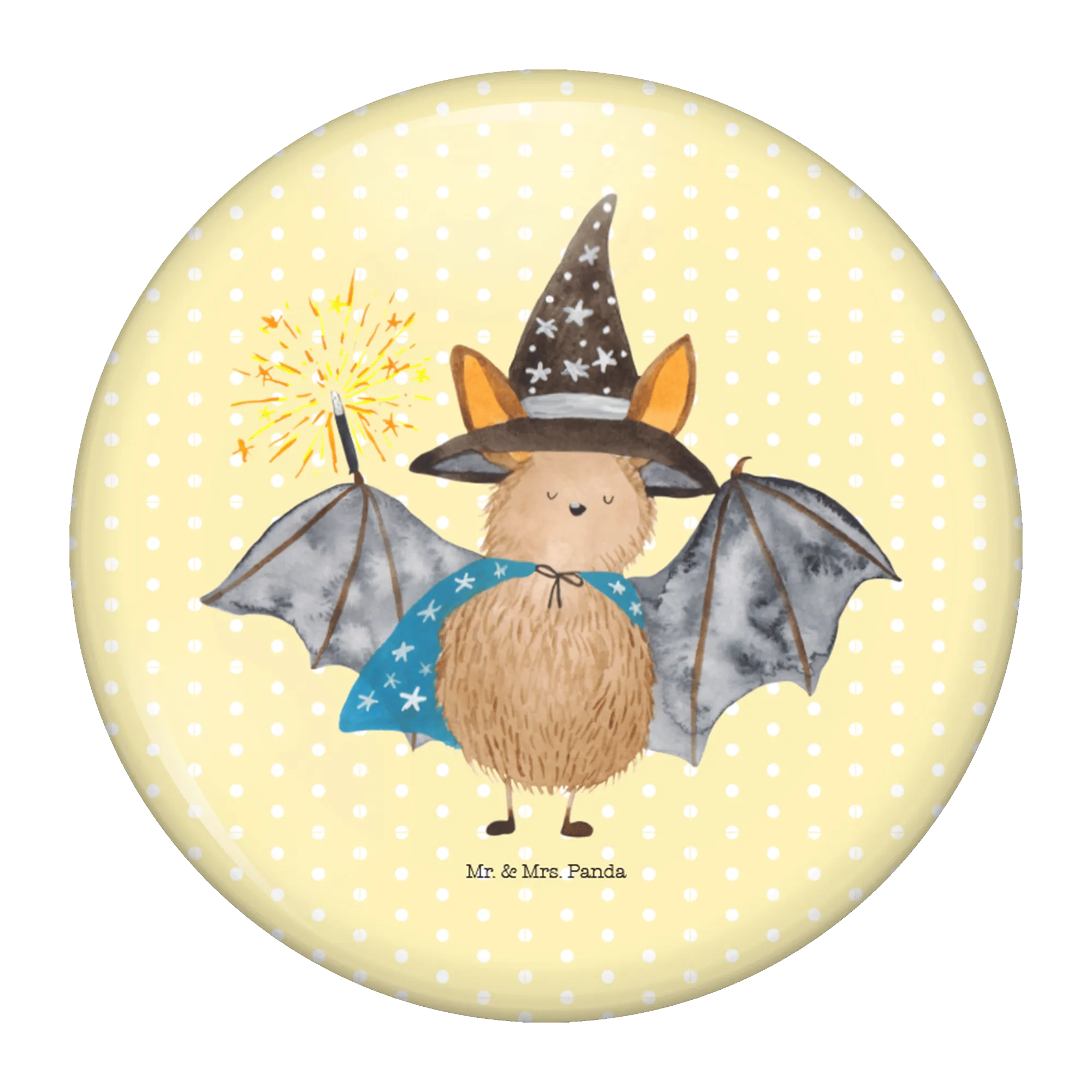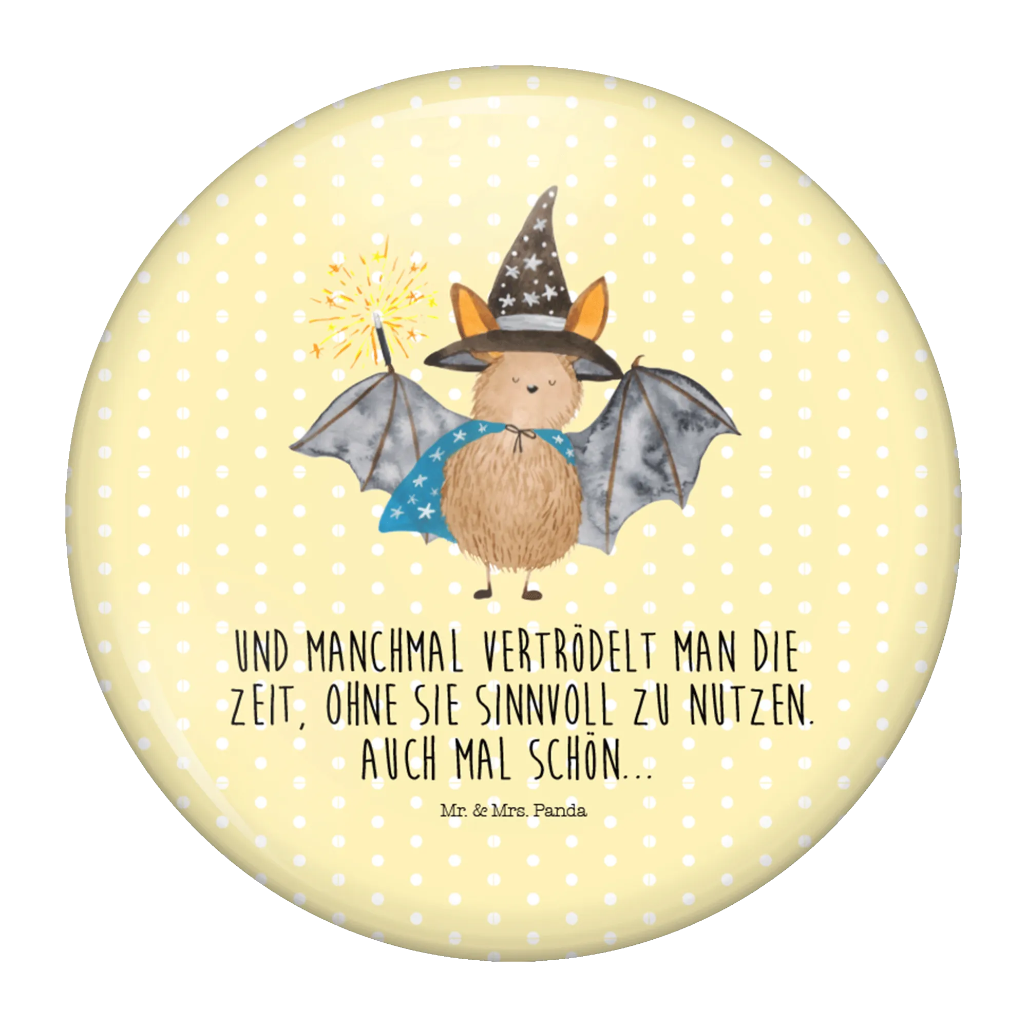 Du bist auf der Suche nach einem zauberhaften Geschenk für eine ganz besondere Person? Dann ist der 50mm Button mit dem Motiv "Fledermaus Zauberer" aus der geheimnisvollen Small World Kollektion von Mr. & Mrs. Panda genau das Richtige für dich!