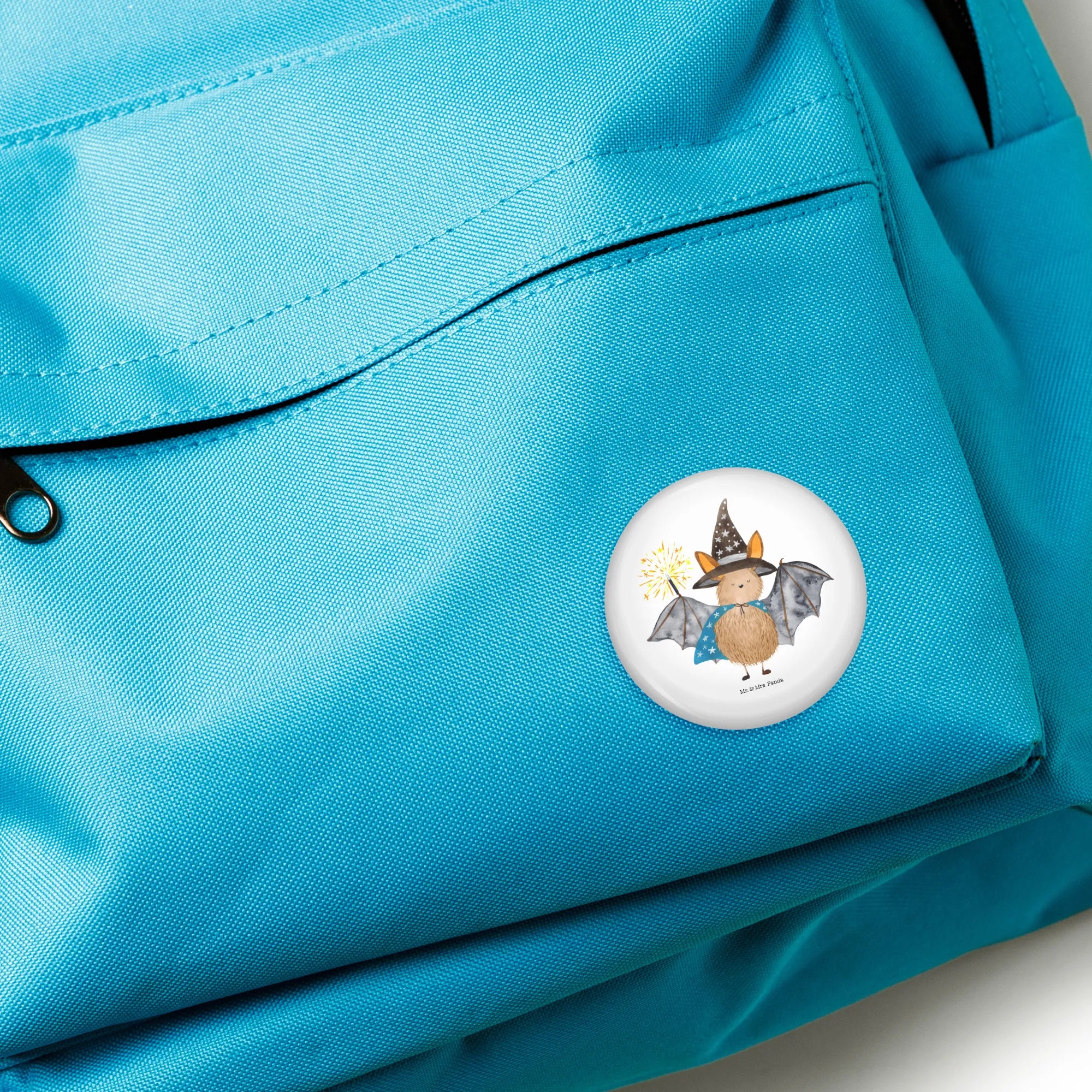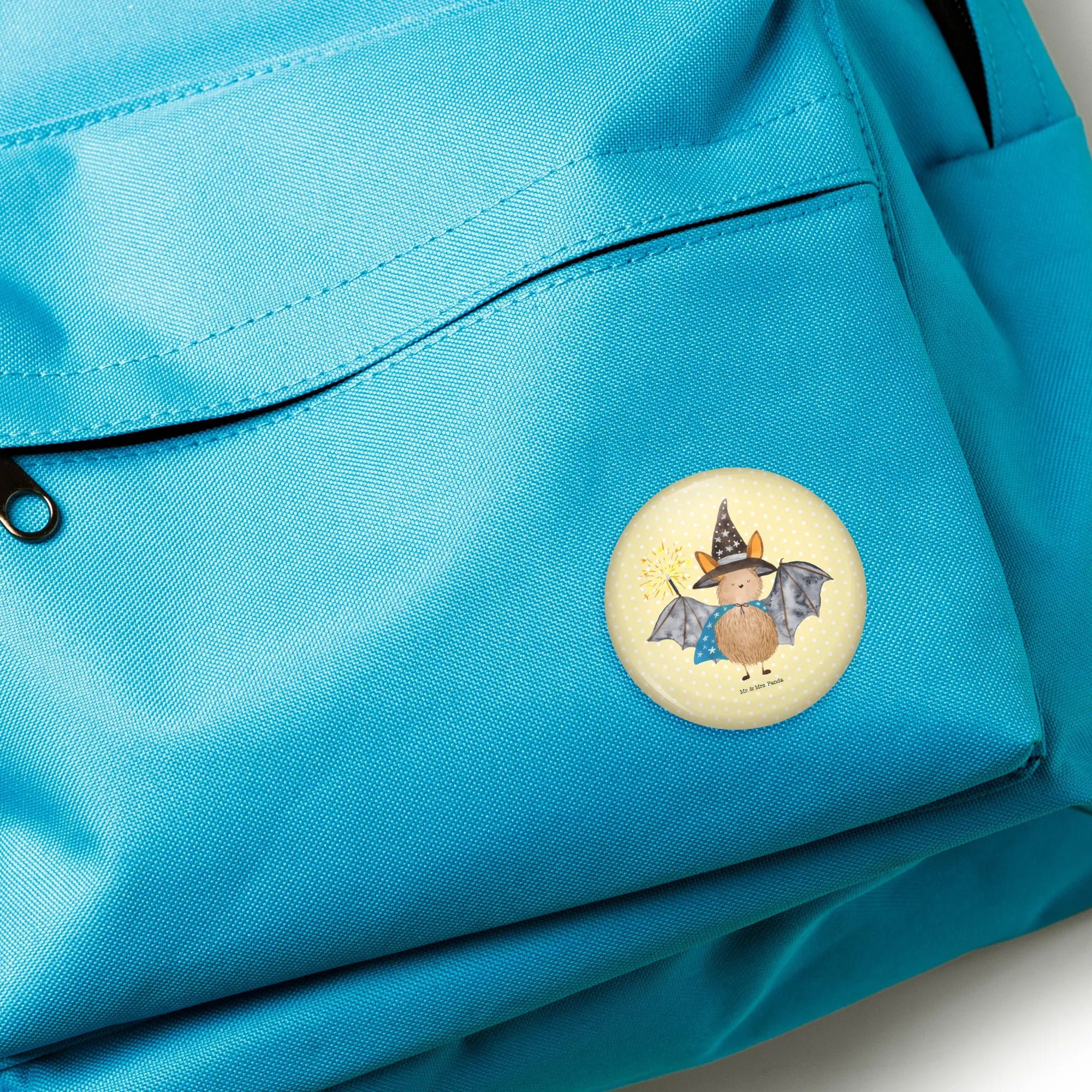 Der 50mm Button eignet sich perfekt zum Anstecken an Jacken, Rucksäcken oder Taschen und kann so ein ganz persönliches Statement abgeben. Die Farben der Fledermaus sind leuchtend und die Zeichnung ist liebevoll und detailreich – einfach typisch für Mr. & Mrs. Panda!