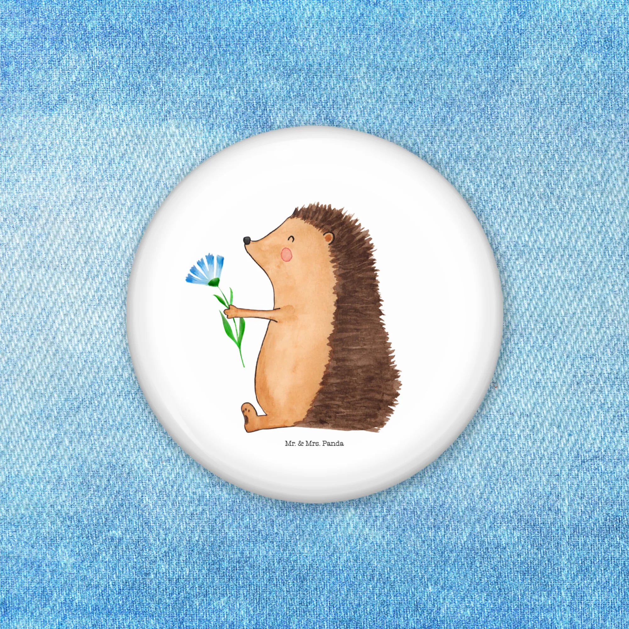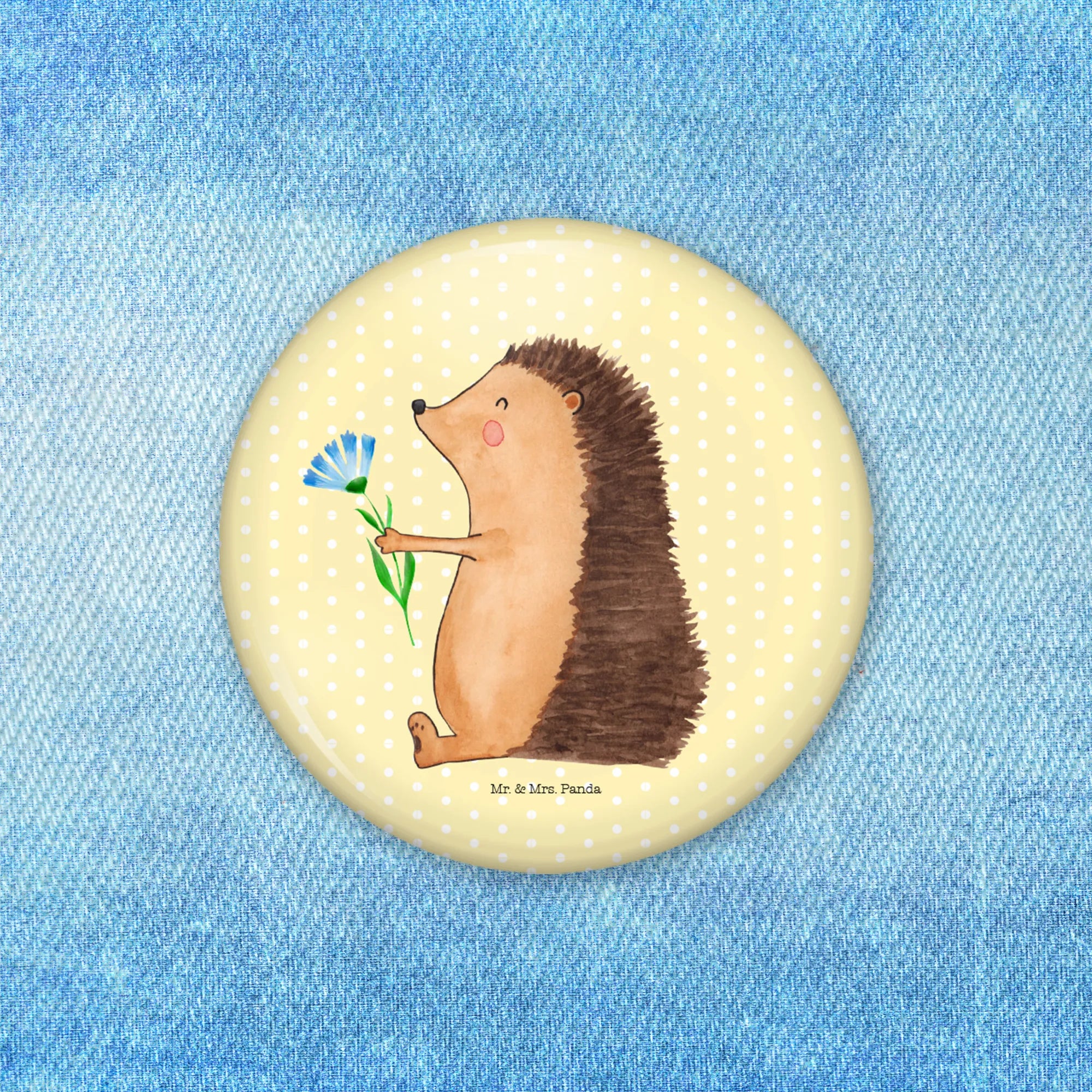 Der süße Igel, der eine bunte Blume in seinen kleinen Stacheln hält, symbolisiert Hoffnung und die Freude am Leben. Mit einem Durchmesser von 50mm passt er perfekt an Jacken, Taschen oder Hüten und lässt sich ganz einfach anbringen. Auch als Geschenk für Freunde, Familie oder Kollegen ist dieser Button ideal geeignet.