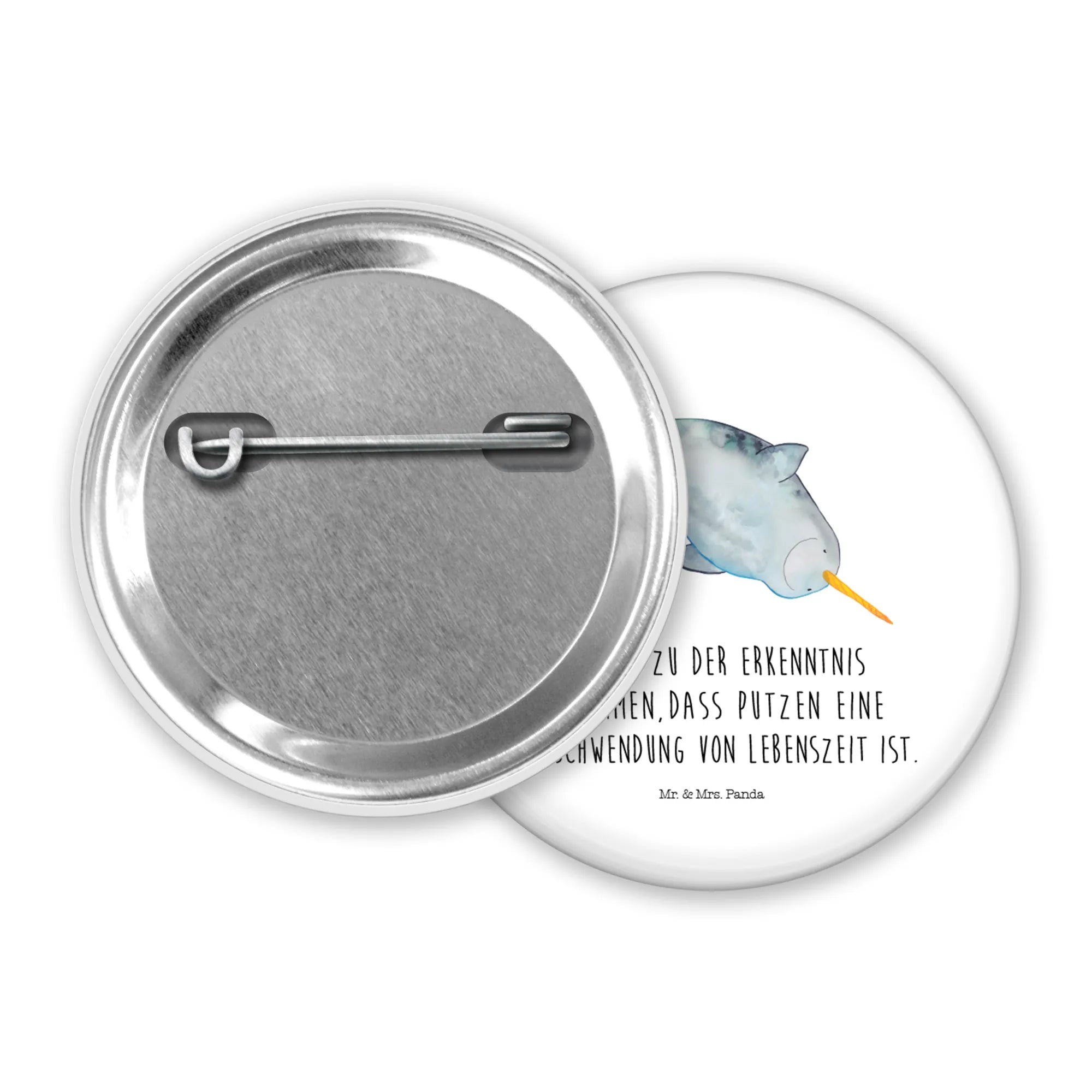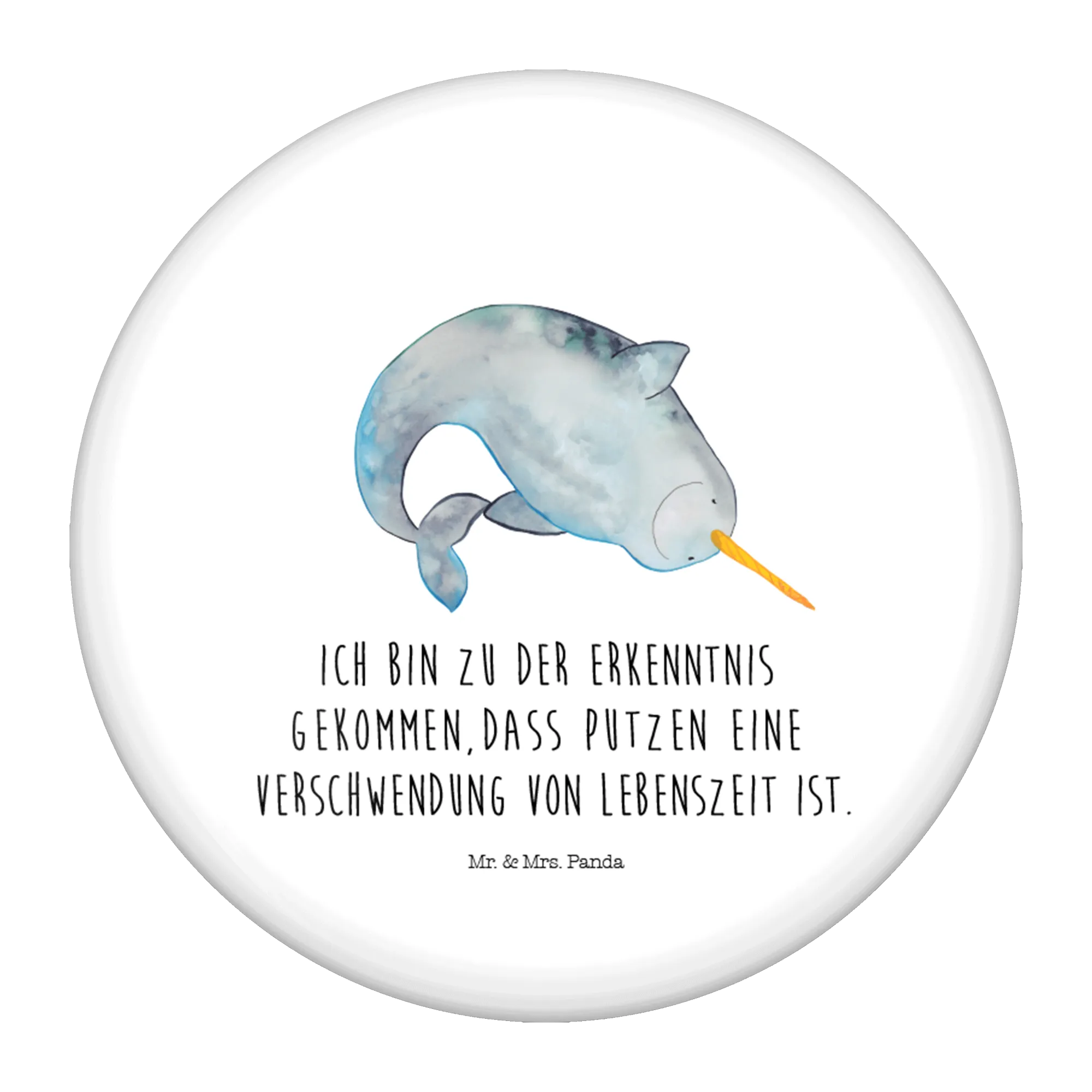 Auf dem Button strahlt der süße Narwal in sanften Blau- und Grautönen und erinnert uns an den Zauber des Meeres. Sein langer, gelb-orangefarbener Stoßzahn verleiht ihm eine verspielte Note. Perfekt für alle Hausfrauen und Junggesellinnen, die mit einem Augenzwinkern den Alltag meistern und das Putzen gerne als eine „Verschwendung von Lebenszeit“ betrachten.
