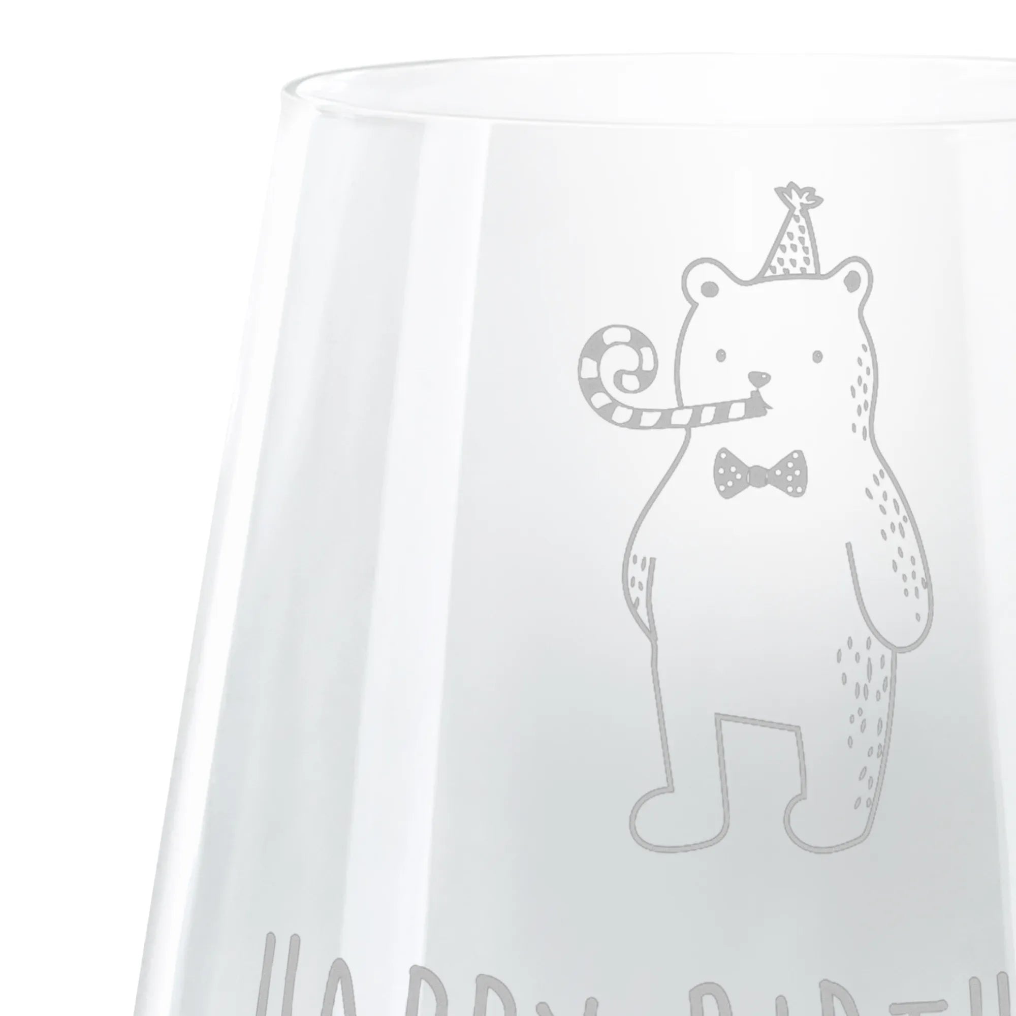Dieses stilvolle Cocktail Glas begeistert nicht nur durch seine hochwertige Lasergravur, sondern auch durch sein süßes Design. Der festlich gekleidete Bär, der mit bunten Luftballons umgeben ist, trägt die Botschaft "Happy Birthday" und zaubert jedem ein Lächeln ins Gesicht!