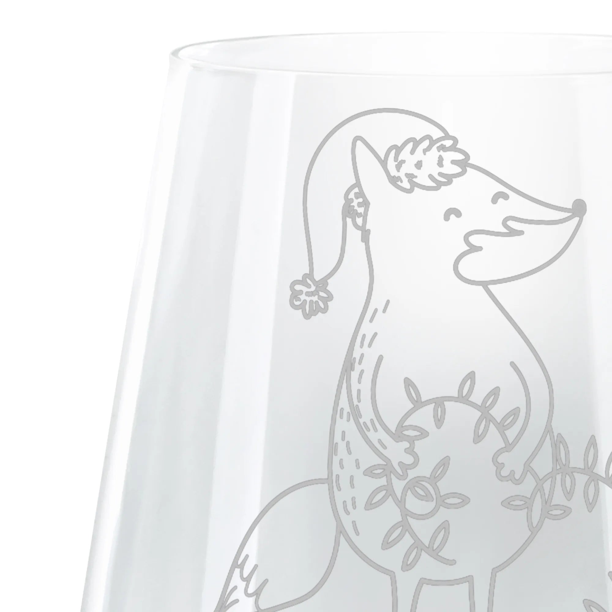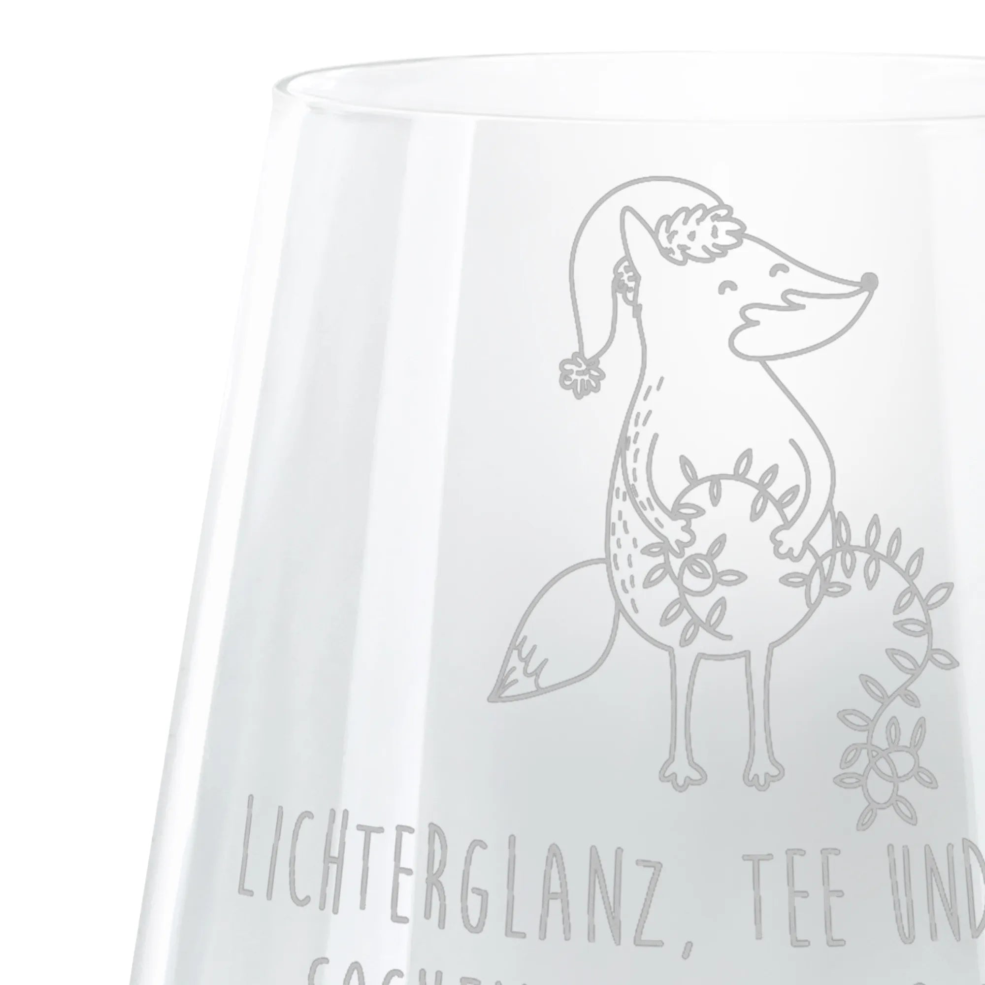 Mit einer robusten Glasqualität und einer Höhe von 103 mm sowie einem Durchmesser von 88 mm bietet das Glas genug Platz für 400 ml Deiner köstlichen Getränke. Die hochwertige Lasergravur verleiht dem Glas einen eleganten Matteffekt, der den verspielten Fuchs in seiner festlichen Aufforderung, mit einer Lichterkette zu spielen, wunderbar zur Geltung bringt. Der Fuchs ist in warmen Orangetönen gehalten und geschmückt mit zarten Verzierungen in Form von grünen Blättern und roten Beeren – inspiriert von weihnachtlichen Girlanden.