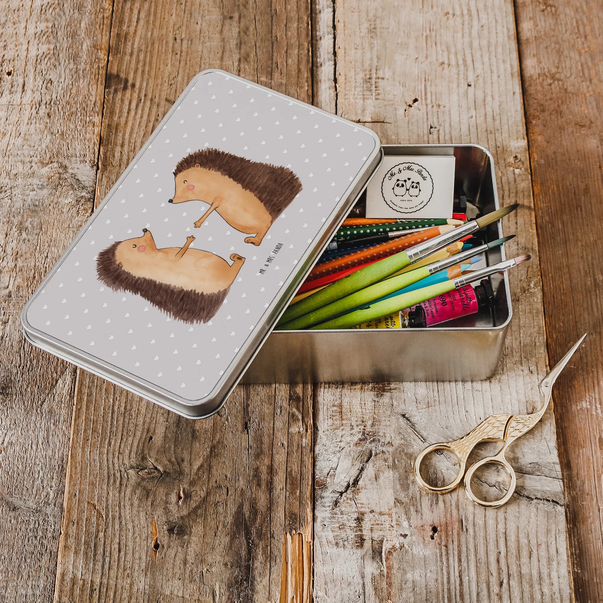 Die wunderschöne Metalldose rechteckig mit dem herzigen Igel-Motiv aus der Liebe Kollektion von Mr. & Mrs. Panda ist eine perfekte Geschenkidee für all jene, die ihre Liebe auf besondere Art und Weise zeigen möchten.