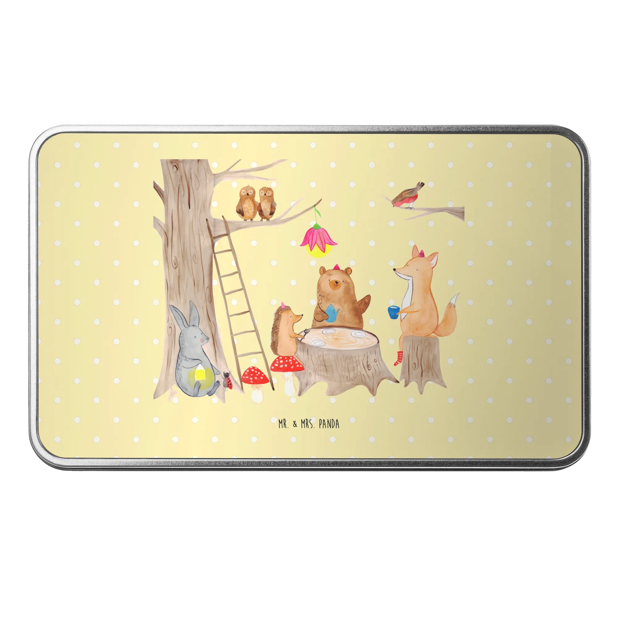 Unsere kleine Blechdose bringt dir ein Stück Wald direkt nach Hause: niedliche Füchse, Hasen und Eichhörnchen feiern ein fröhliches Picknick auf pastellgelbem Grund. Das von Mrs. Panda liebevoll aquarellgezeichnete Motiv zaubert dir ein Lächeln ins Gesicht und eignet sich perfekt als dekorative Aufbewahrungsdose oder Geschenkbox. 🐿️🦊🍪
