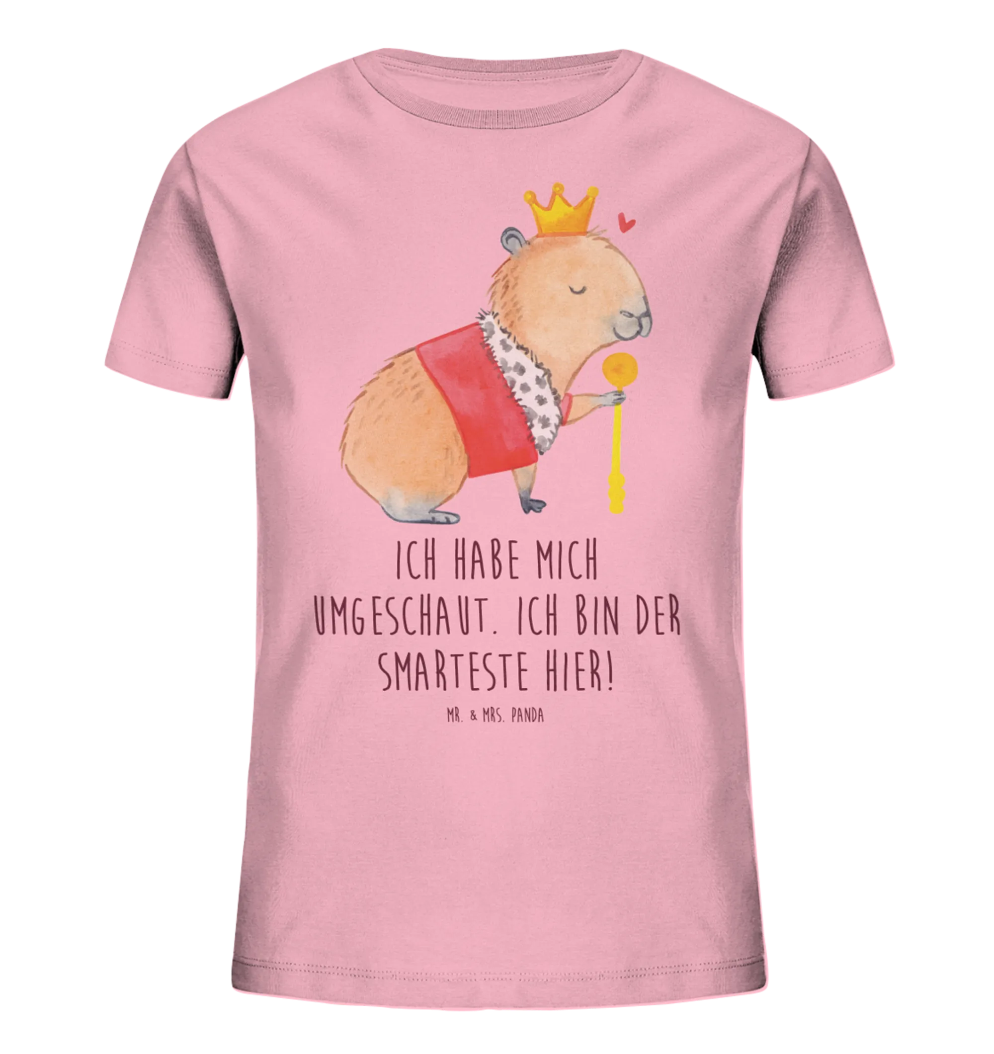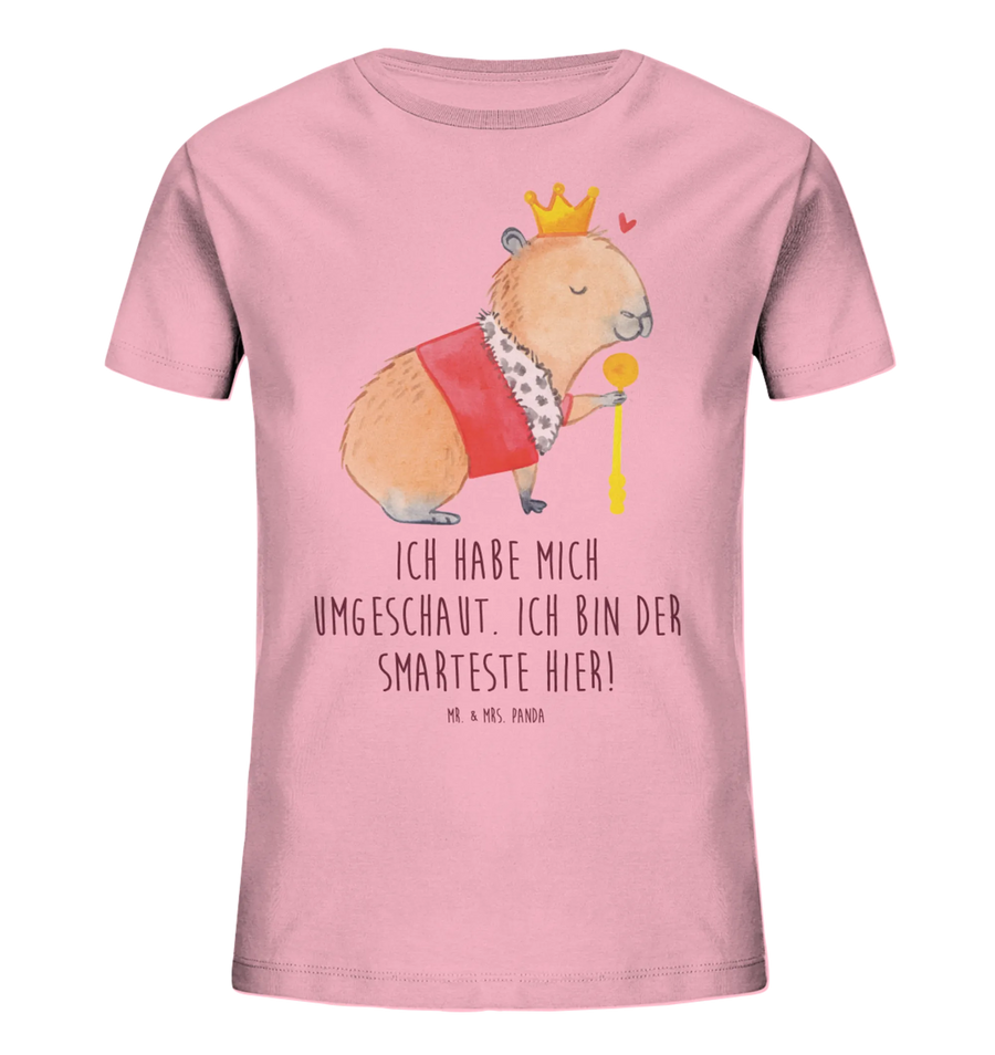 Das T-Shirt präsentiert ein handgezeichnetes Motiv eines Capybaras, das herrlich gekrönt und mit Zepter ausgestattet ist. Mit einem charmanten Lächeln und einem kleinen Herzchen über seinem Kopf bringt dieser kleine König nicht nur gute Laune, sondern auch einen Hauch von Abenteuer in den Alltag. Der Spruch "Ich habe mich umgeschaut. Ich bin der Smarteste hier!" sorgt für Lacher und ist eine perfekte Motto für jedes Kind, das mehr über die Welt lernen und sich ausprobieren möchte.