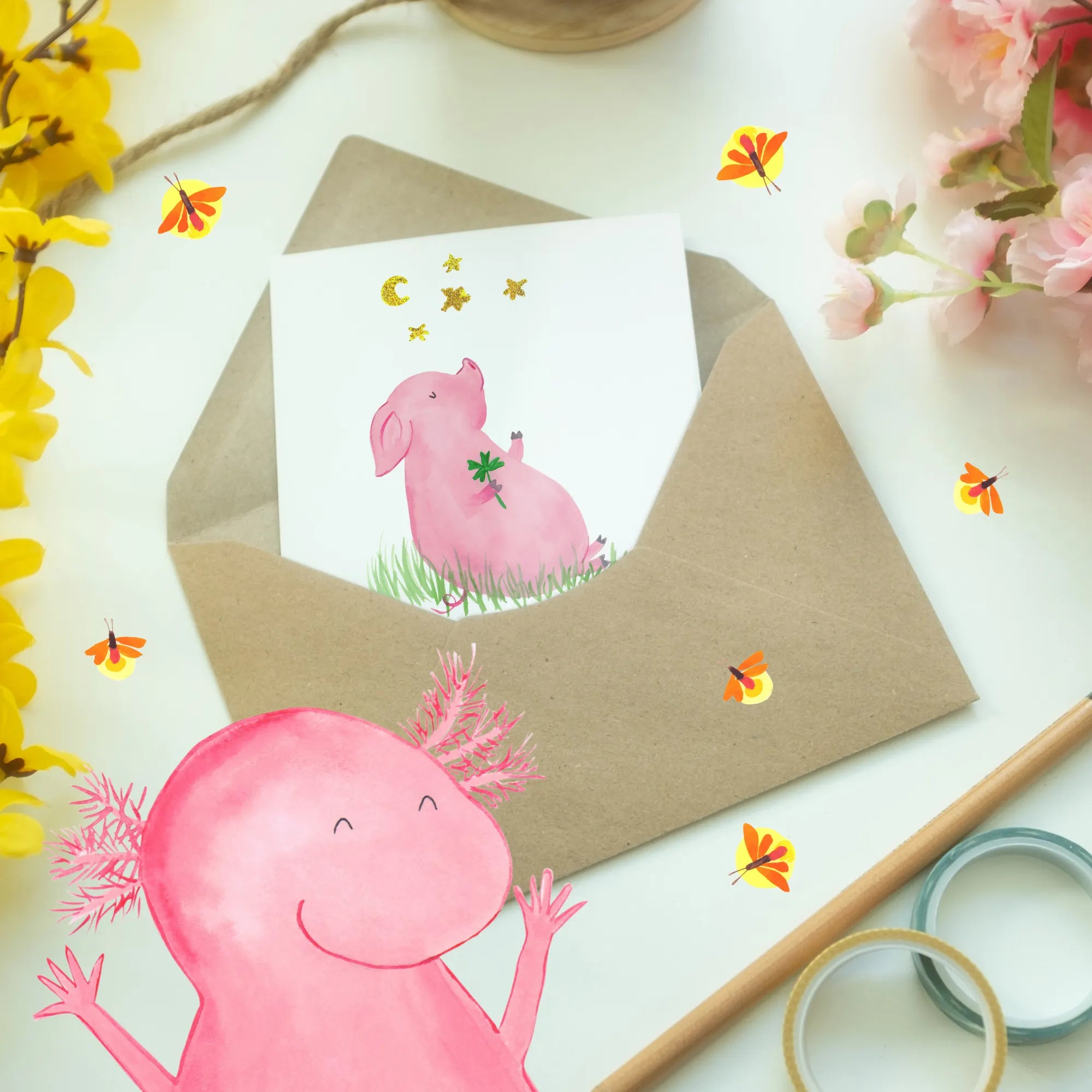 Die personalisierte Grußkarte "Glücksschwein" aus der zauberhaften Small World Kollektion von Mr. & Mrs. Panda ist das perfekte Geschenk für jeden Anlass, ob Geburtstag, Hochzeit oder einfach als kleine Aufmunterung für die Liebsten.