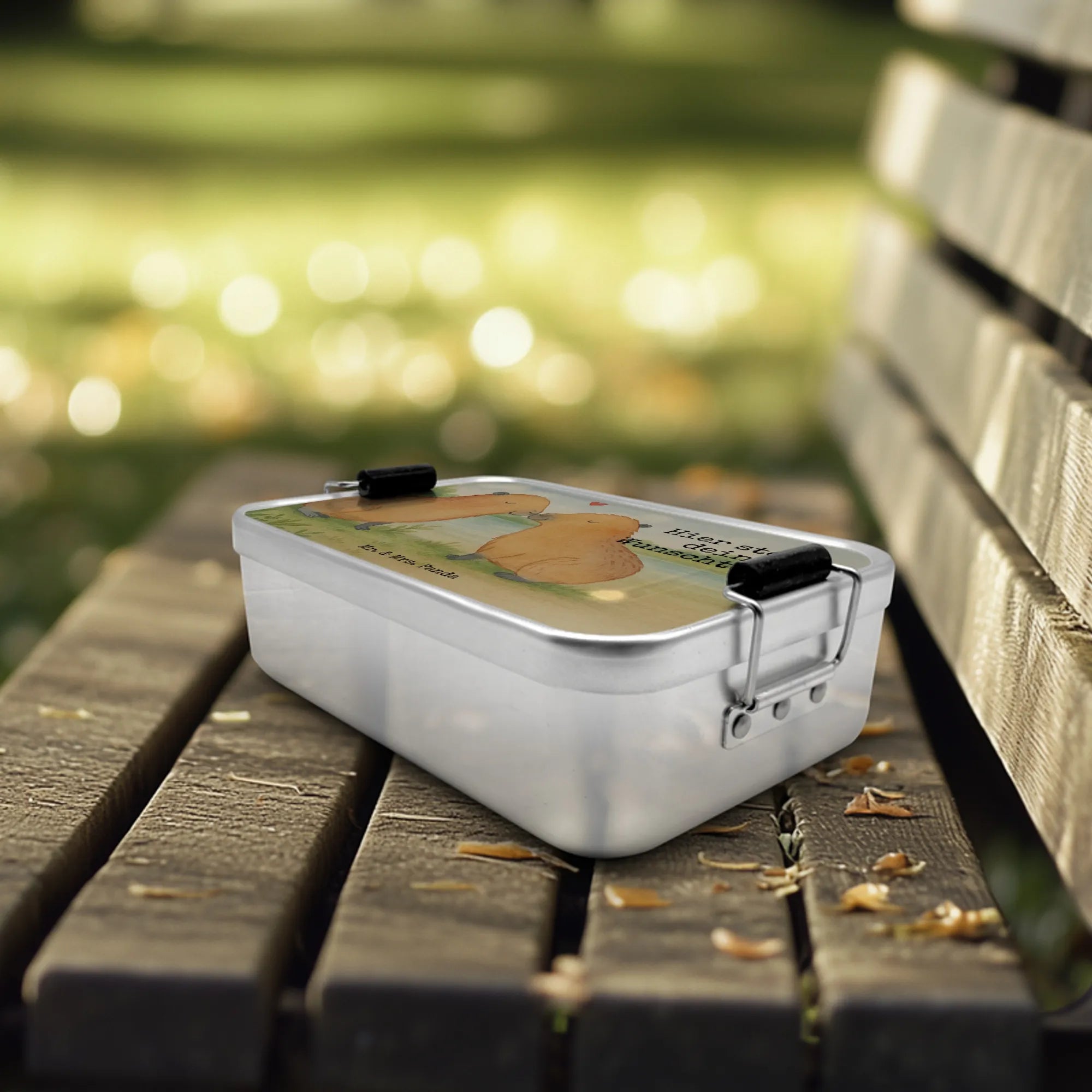 Mach deine Mittagspause zu etwas ganz Besonderem mit der personalisierten Metall Brotdose von Mr. & Mrs. Panda! Diese charmante Brotdose ist für all deine Snacks und Pausenbrote gemacht und präsentiert sich in den perfekten Maßen von 173 mm x 118 mm x 55 mm. Jedes Stück dieser Brotdose wird mit den fröhlichen Motiven von Mr. & Mrs. Panda bedruckt und kann mit deinem ganz persönlichen Text oder Namen individualisiert werden. Hergestellt aus robustem, langlebigem Aluminium bietet sie nicht nur viel Platz für ein komplettes Mittagessen, sondern ist auch äußert stabil. Ihr nostalgischer Retrolook bringt eine besondere Note in deine Schul- oder Büropausen. Der Doppelverschluss durch Klemmbügel sorgt dafür, dass alles frisch und sicher bleibt. Und das Beste ist, die Brotdose ist auf Lebensmittelechtheit geprüft! Einfach mit der Hand reinigen und schon ist sie bereit für dein nächstes Abenteuer. Hol dir die Brotdose und genieße jede Leckerei in stilvollem Design!
