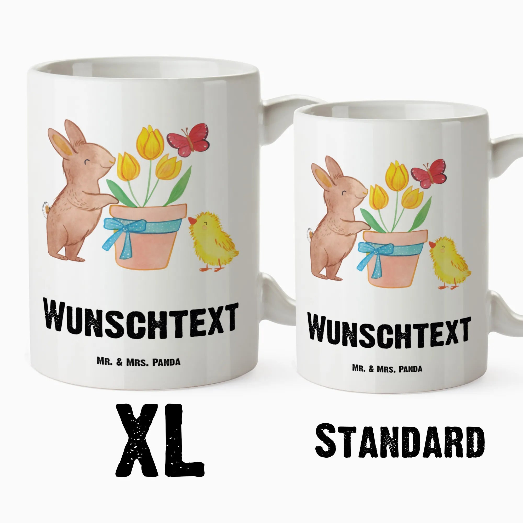 Die personalisierte XL Tasse Hase Küken aus der Ostern - Kollektion von Mr. & Mrs. Panda ist das perfekte Ostergeschenk für Groß und Klein. Mit einem großzügigen Füllvolumen von 500 ml bietet diese Tasse genug Platz für deinen Lieblingskaffee, Tee oder Kakao. Egal ob zum Frühstück oder beim Nachmittagstee, diese Tasse ist nicht nur praktisch, sondern zaubert auch ein Lächeln ins Gesicht. Das liebevoll gestaltete Motiv zeigt einen fröhlichen Hasen, der eine Vase mit bunten Tulpen umarmt, während ein kleines gelbes Küken das Geschehen interessiert beobachtet. Der Slogan "Das Schönste an Ostern ist: die bunten Blumen überall, Sonnenschein im Herzen und Frühlingsgefühle im Bauch!" bringt die fröhliche Osterstimmung perfekt zum Ausdruck.