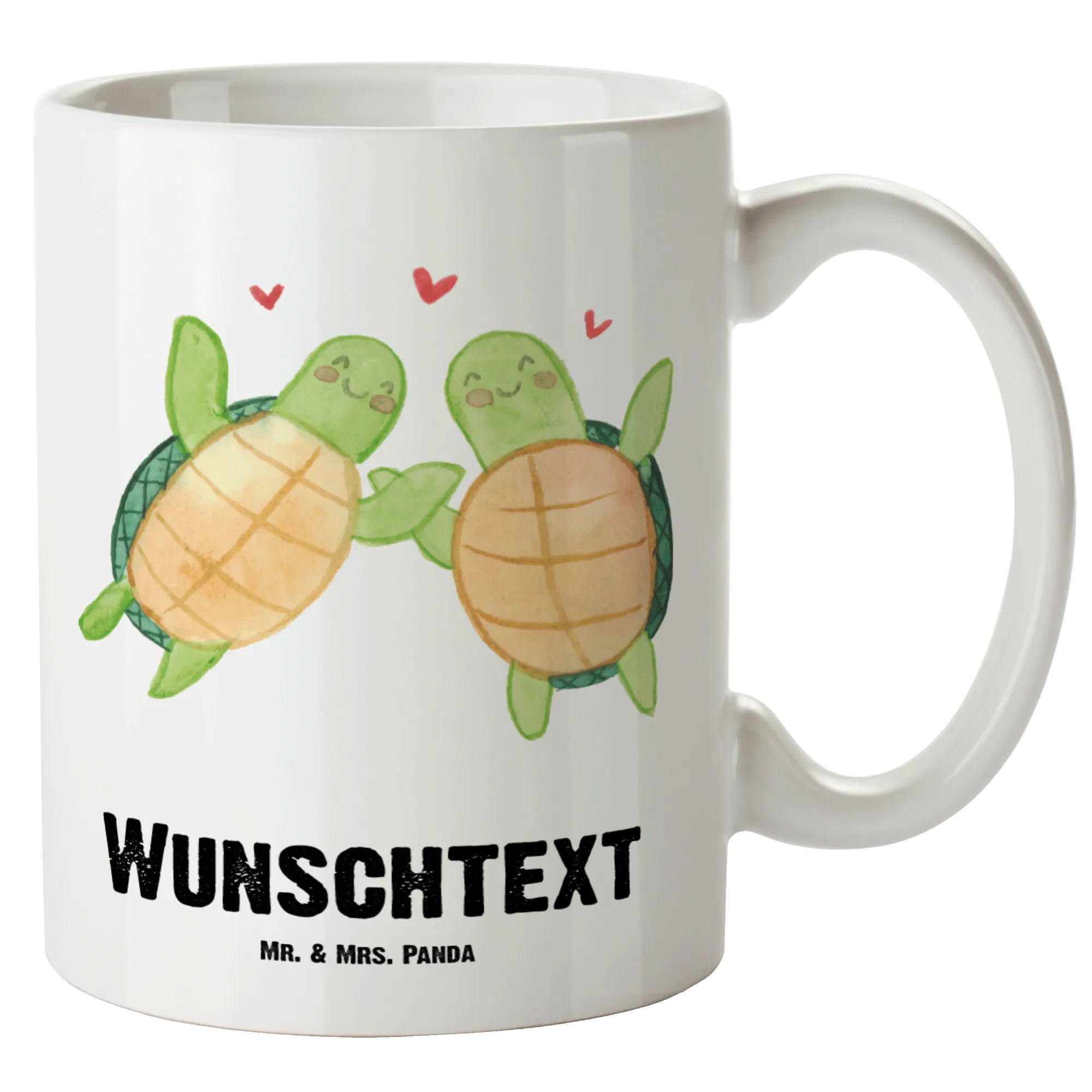 Die beiden Schildkröten, die sich zueinander neigen und mit glücklichen Augen strahlen, bringen eine liebevolle Atmosphäre in jeden Raum. Zwischen ihnen schweben rote Herzen, die die Zuneigung und Verbundenheit symbolisieren. Du kannst diese Jumbo Tasse ganz individuell mit einem Namen oder Wunschtext personalisieren, was sie zu einem ganz besonderen Mitbringsel für Geburtstage, Valentinstag, Jahrestage oder einfach nur als kleines Zeichen der Liebe macht.