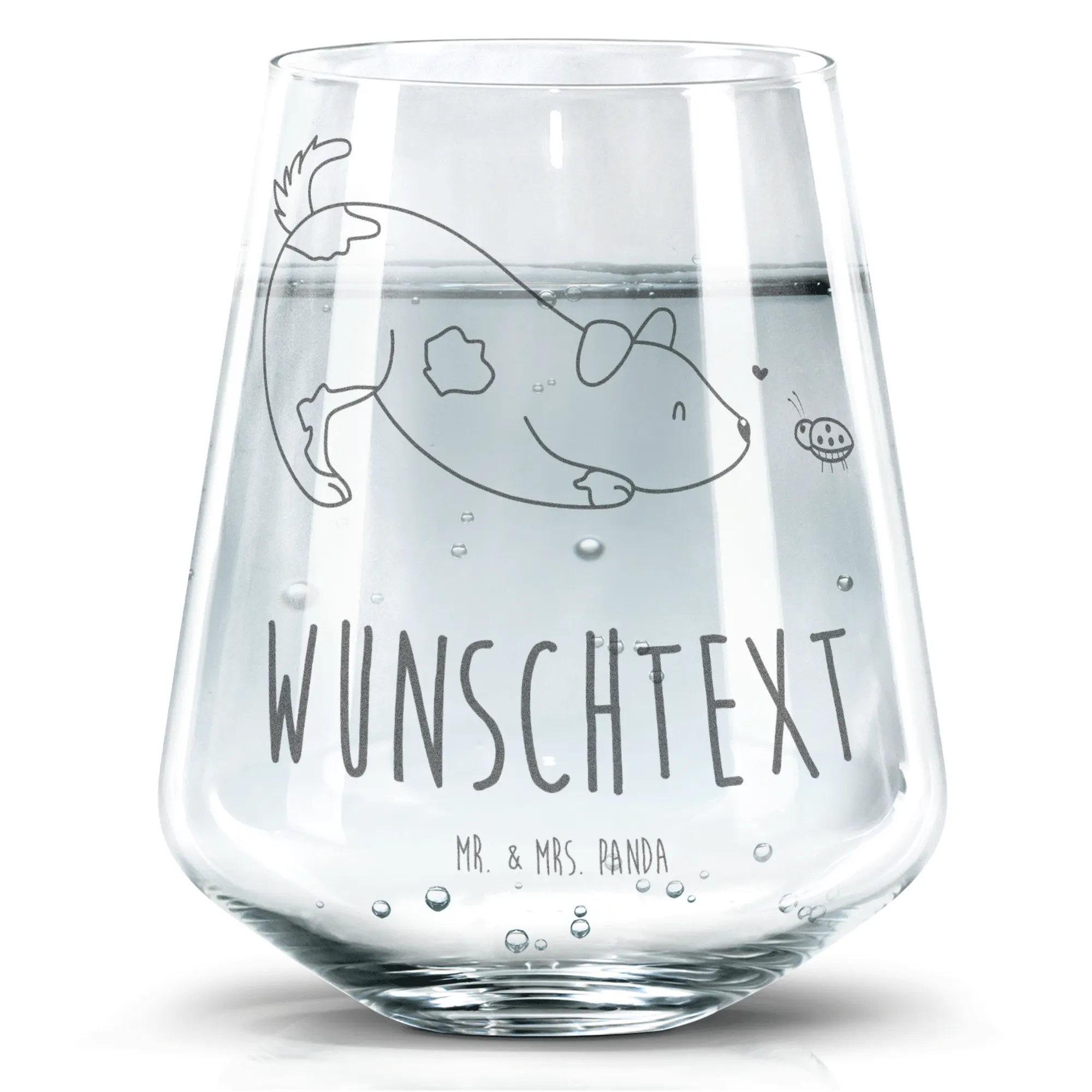 Entdecke das perfekte Trinkglas für alle Tierliebhaber und Hundebesitzer – unser personalisiertes Trinkglas mit dem niedlichen Hund Marienkäfer Motiv aus der Hunde Kollektion von Mr. & Mrs. Panda.