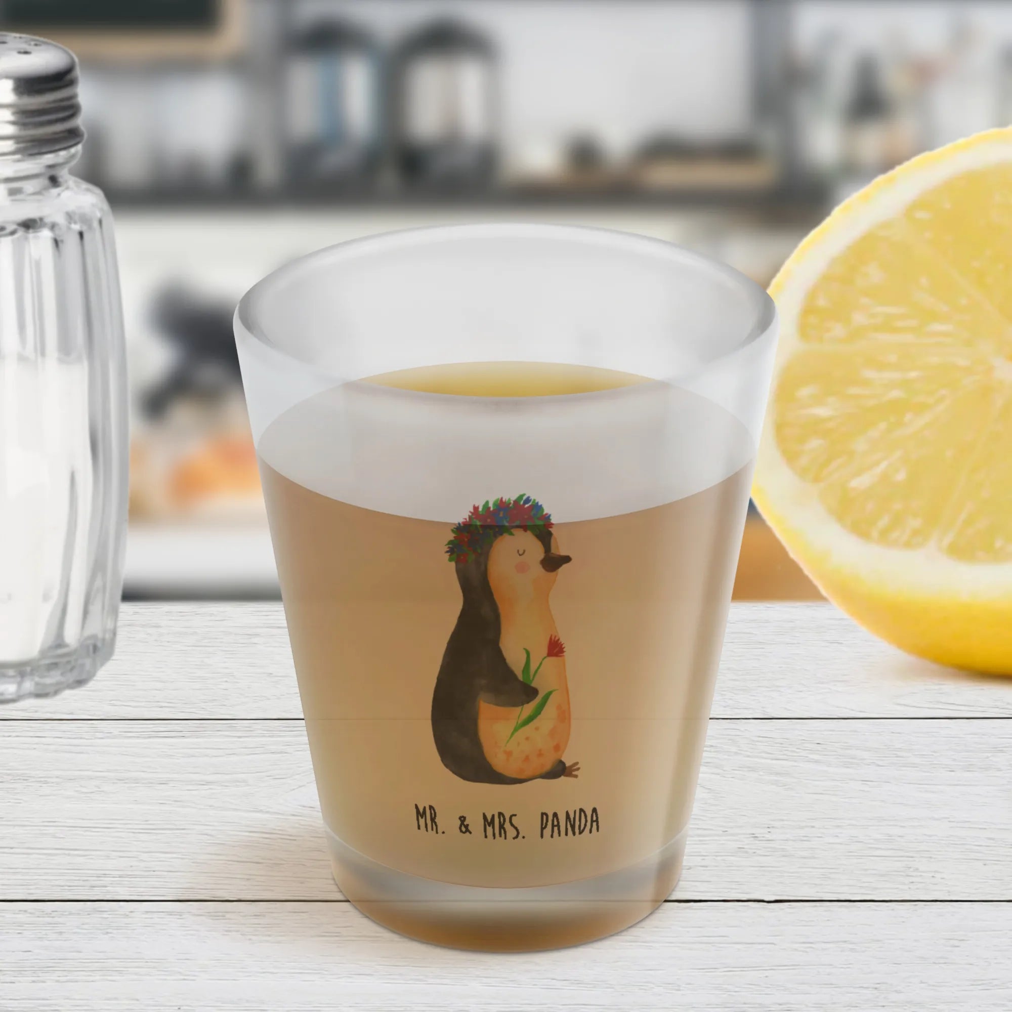 Mr. & Mrs. Panda Schnapsglas „Pinguin Blumenkranz“