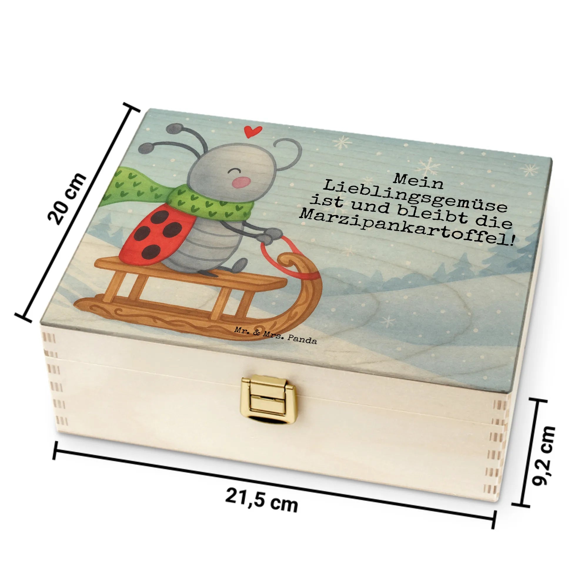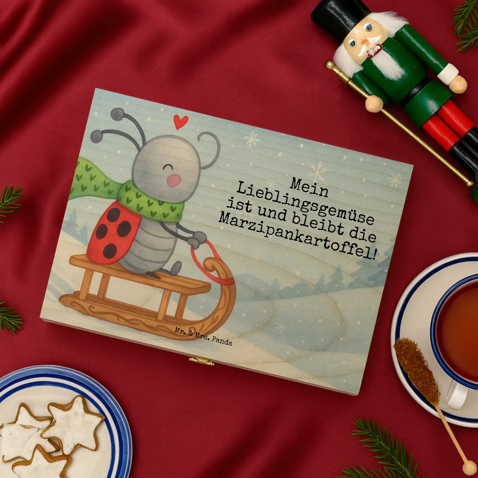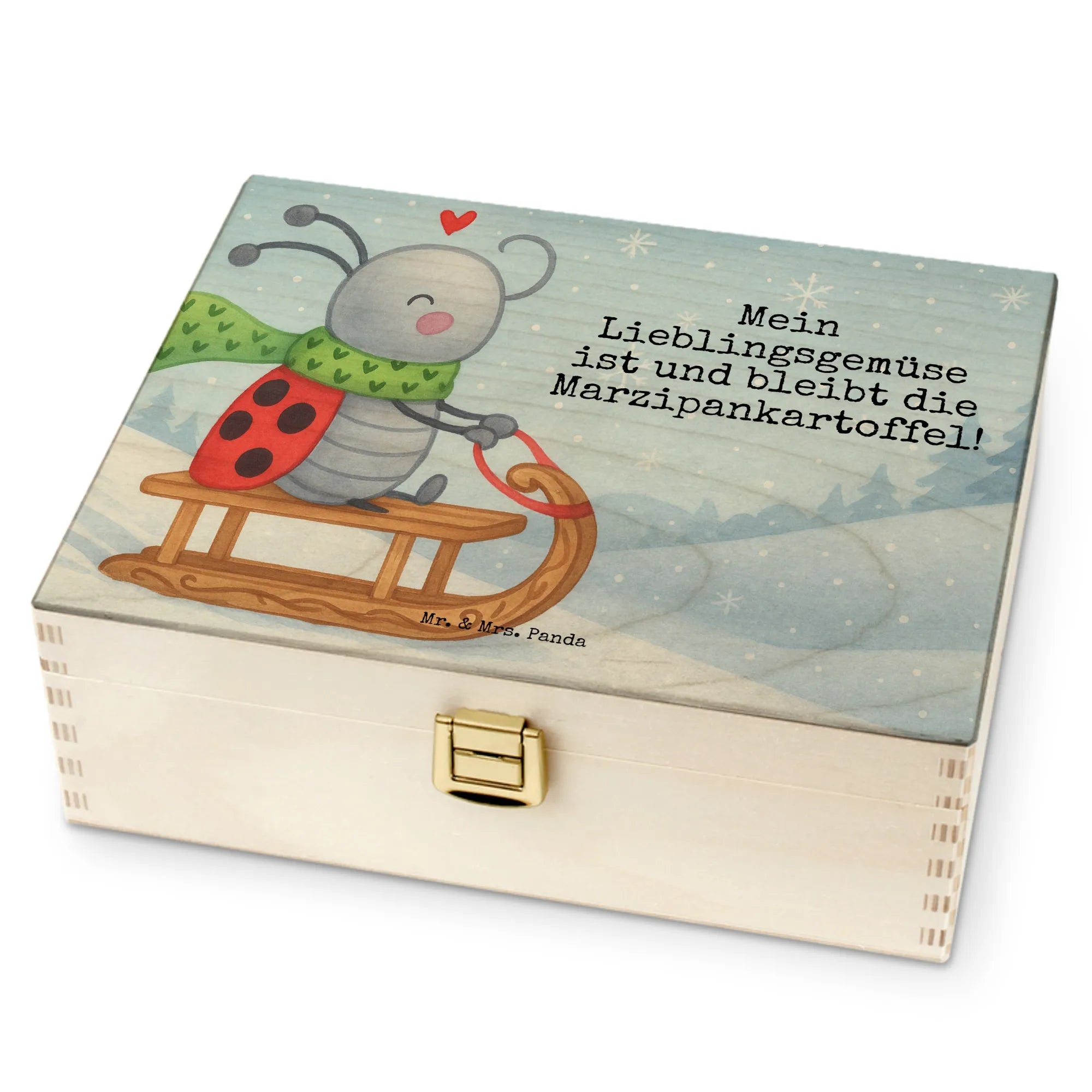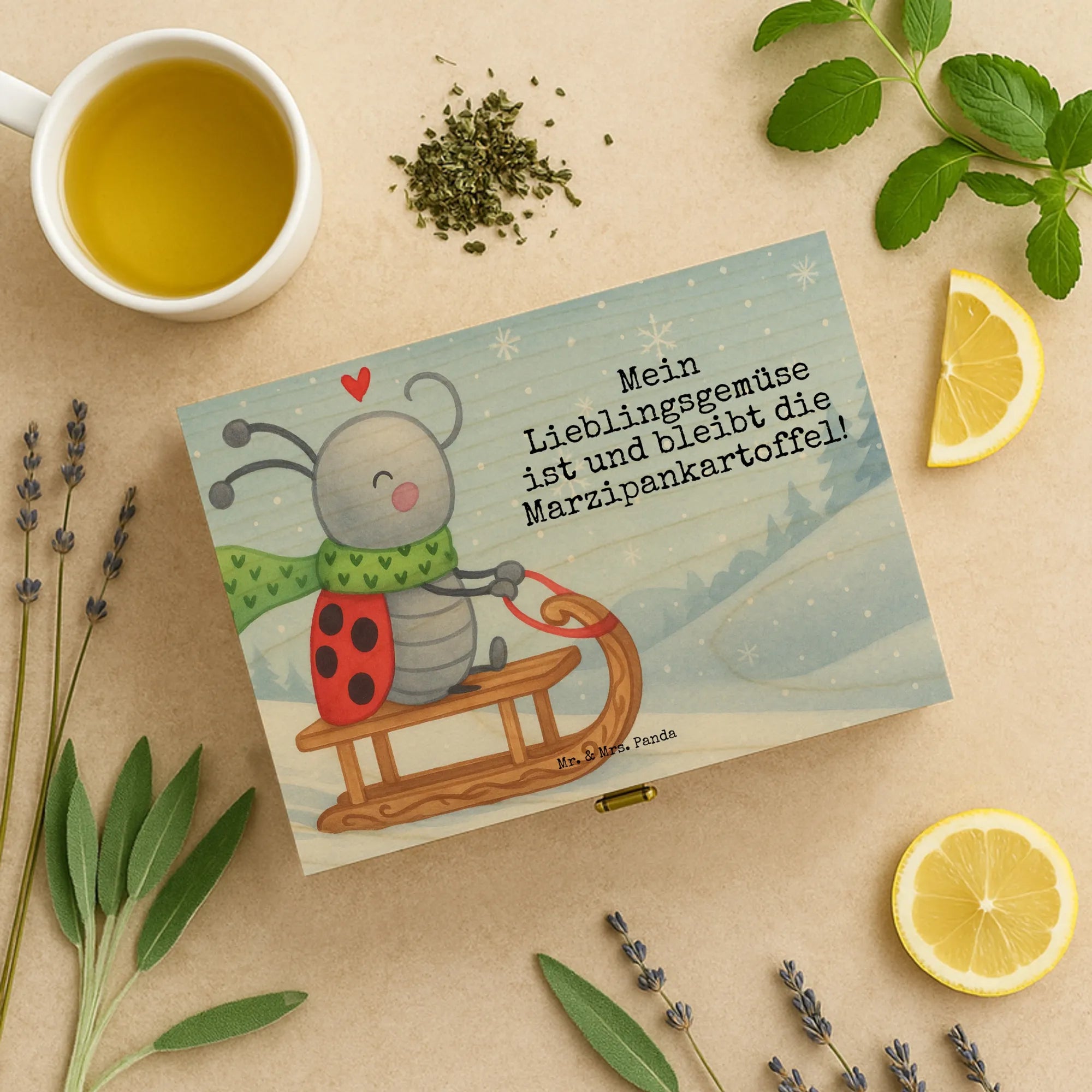 Der Motif "Smörle Rodeln" verbreitet Lebensfreude und winterliche Gemütlichkeit! Hier sitzt unser fröhlicher Marienkäfer Smörle auf seinem bunten Schlitten, bereit für ein unvergessliches Abenteuer im Schnee. Mit seinem grünen Schal, auf dem kleine Herzchen prangen, zeigt er, dass Rodeln die beste Art ist, den Winter zu genießen. Über ihm schwebt ein rotes Herz, das seine Freude unterstreicht. Das zaubert nicht nur ein Lächeln ins Gesicht, sondern erfüllt auch die Herzen mit Wärme. "Mein Lieblingsgemüse ist und bleibt die Marzipankartoffel!" steckt voller Spaß und Verspieltheit, passend zu diesem beaufschlagenden Wintermotiv.