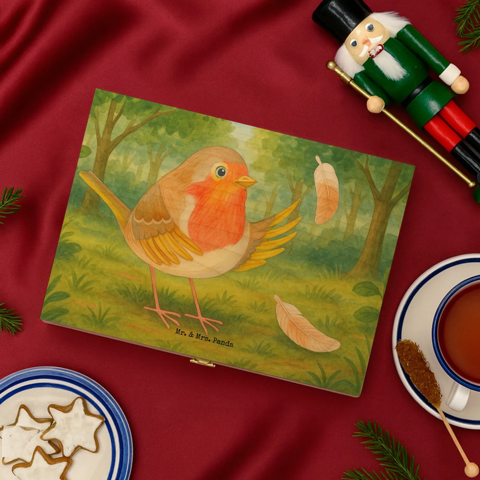Teebeutel Aufbewahrung Rotkehlchen Federn Design - mit Spruch