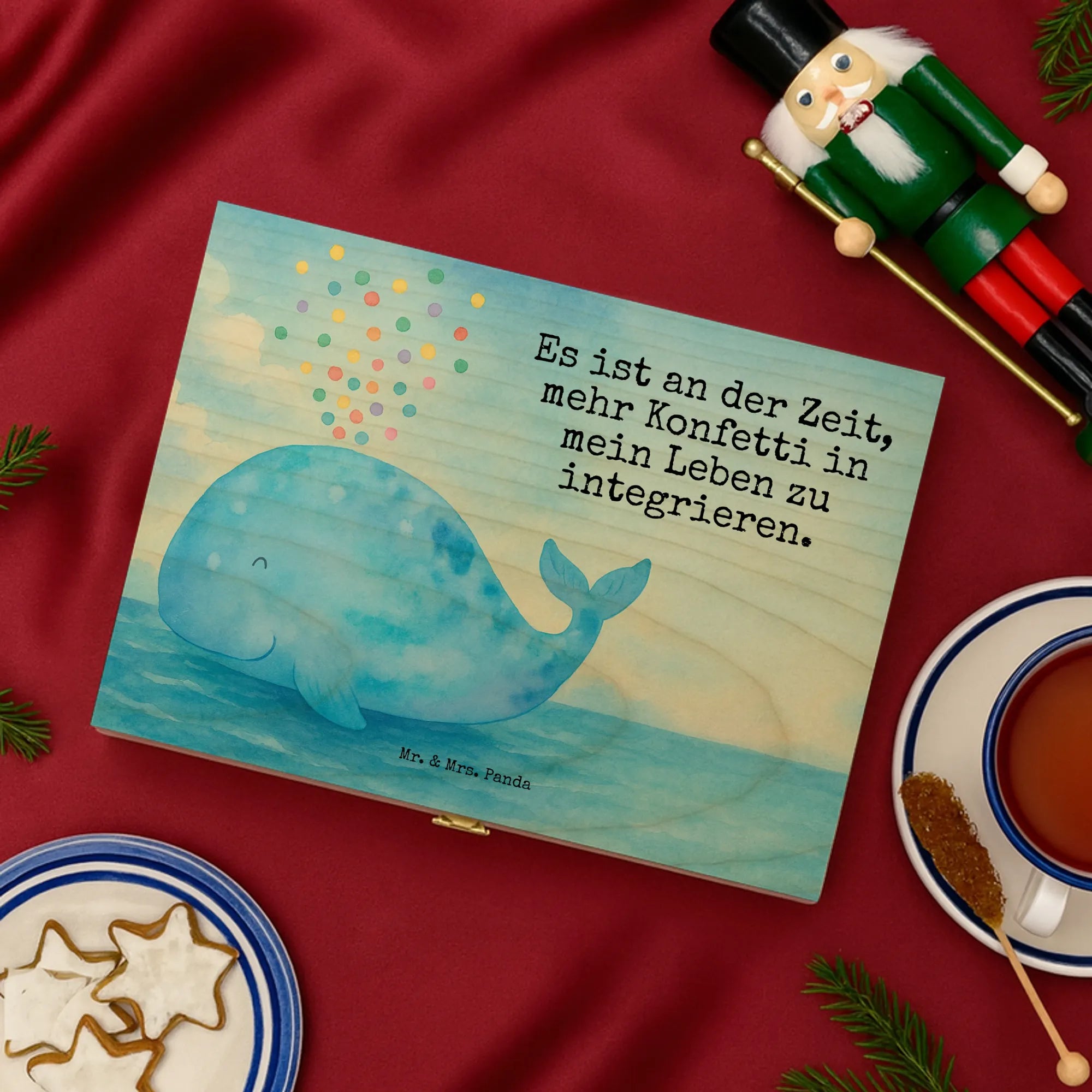 Diese Holzteebox fügt sich durch ihr natürliches Design harmonisch in jede Einrichtung ein. Sie ist ein praktischer Tee Beutel Halter und gleichzeitig ein dekoratives Highlight. Die umweltfreundliche Tinte garantiert, dass die Farben des Wals und des Konfettis lange strahlen. Gönn deiner Teesammlung ein neues Zuhause in dieser exklusiven Teebox von Mr. & Mrs. Panda!