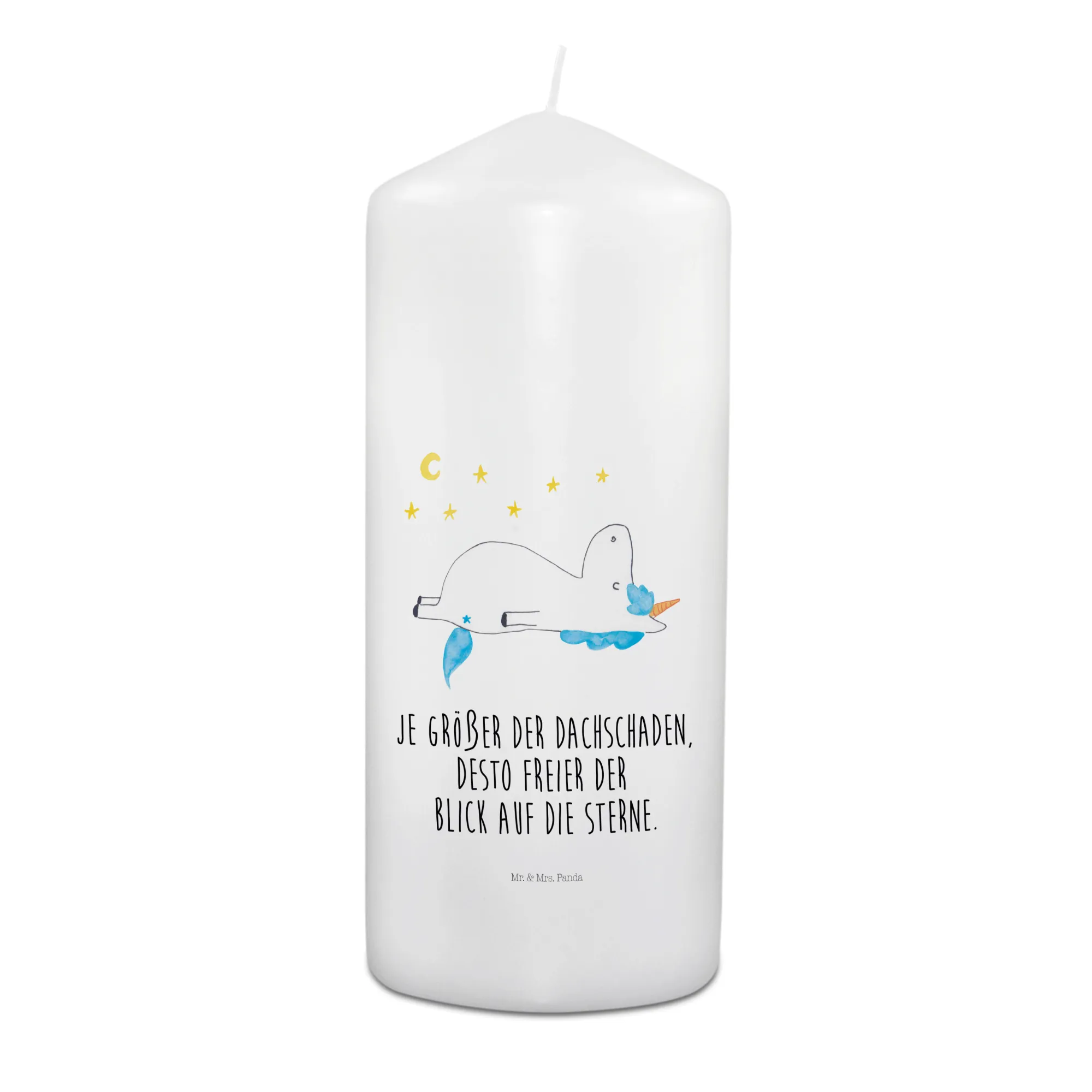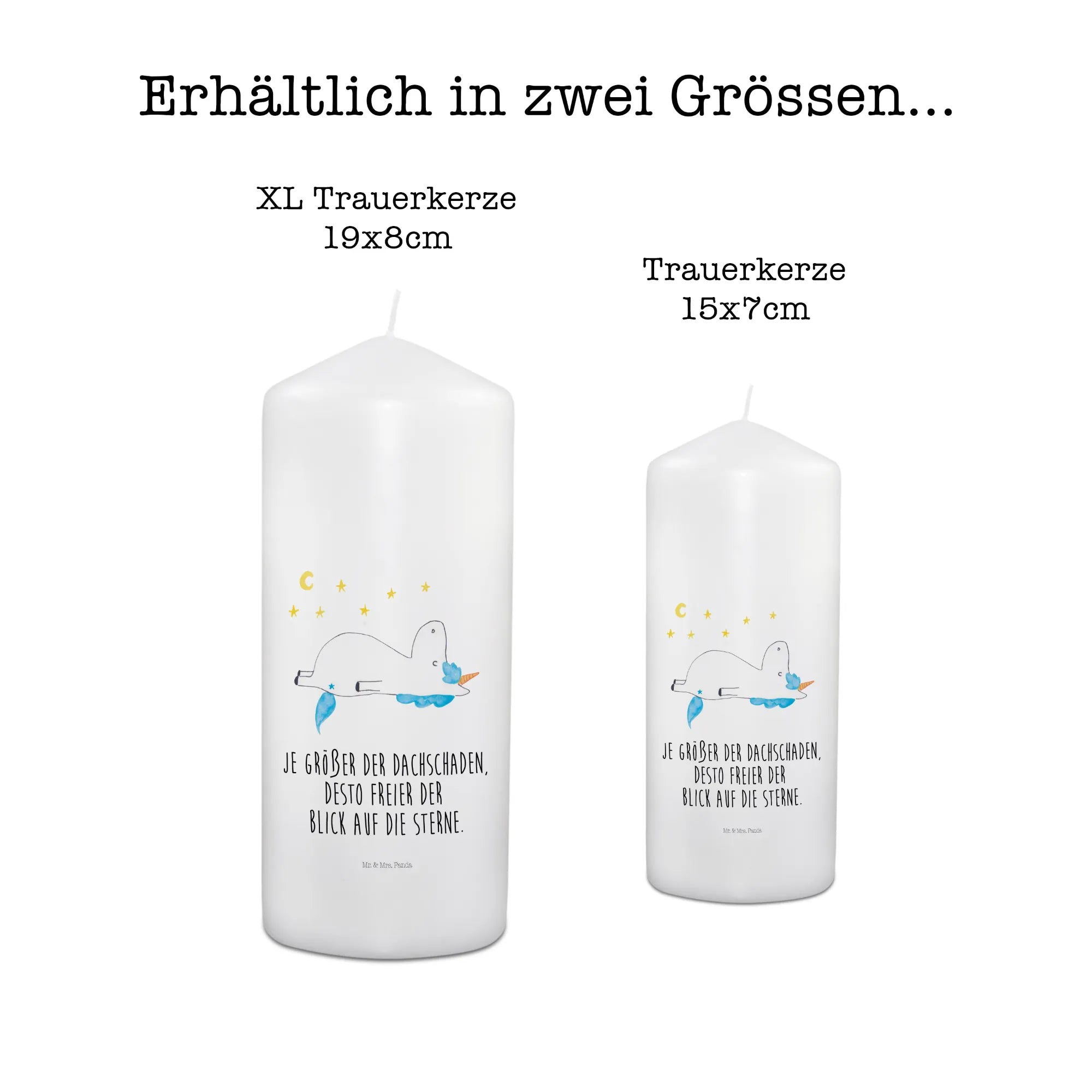 Mit dem Motiv des Einhorns, das verträumt in den Sternenhimmel blickt, bietet sie Trost und Hoffnung. Der Spruch "Je größer der Dachschaden, desto freier der Blick auf die Sterne" spricht diejenigen an, die das Ungewöhnliche und Verrückte schätzen. Diese Kerze ist mehr als nur ein einfaches Grablicht; sie ist ein Symbol für die Liebe und die Erinnerungen, die bleiben.