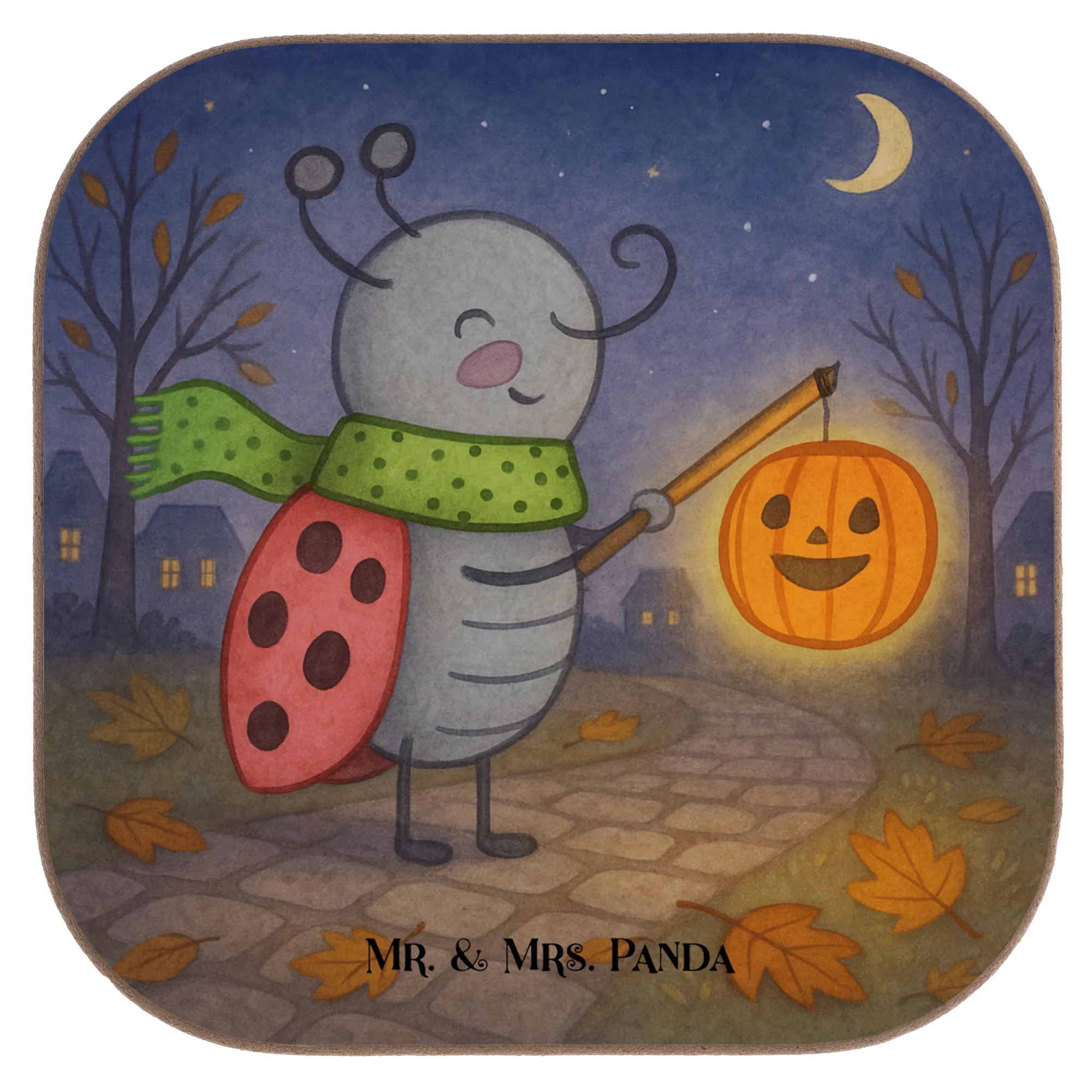 Smörle Laterne – liebevoller Marienkäfer mit Herz, grünem Schal und Kürbis-Laterne, gemütliches Herbstmotiv für Geschenk und Wohnaccessoires