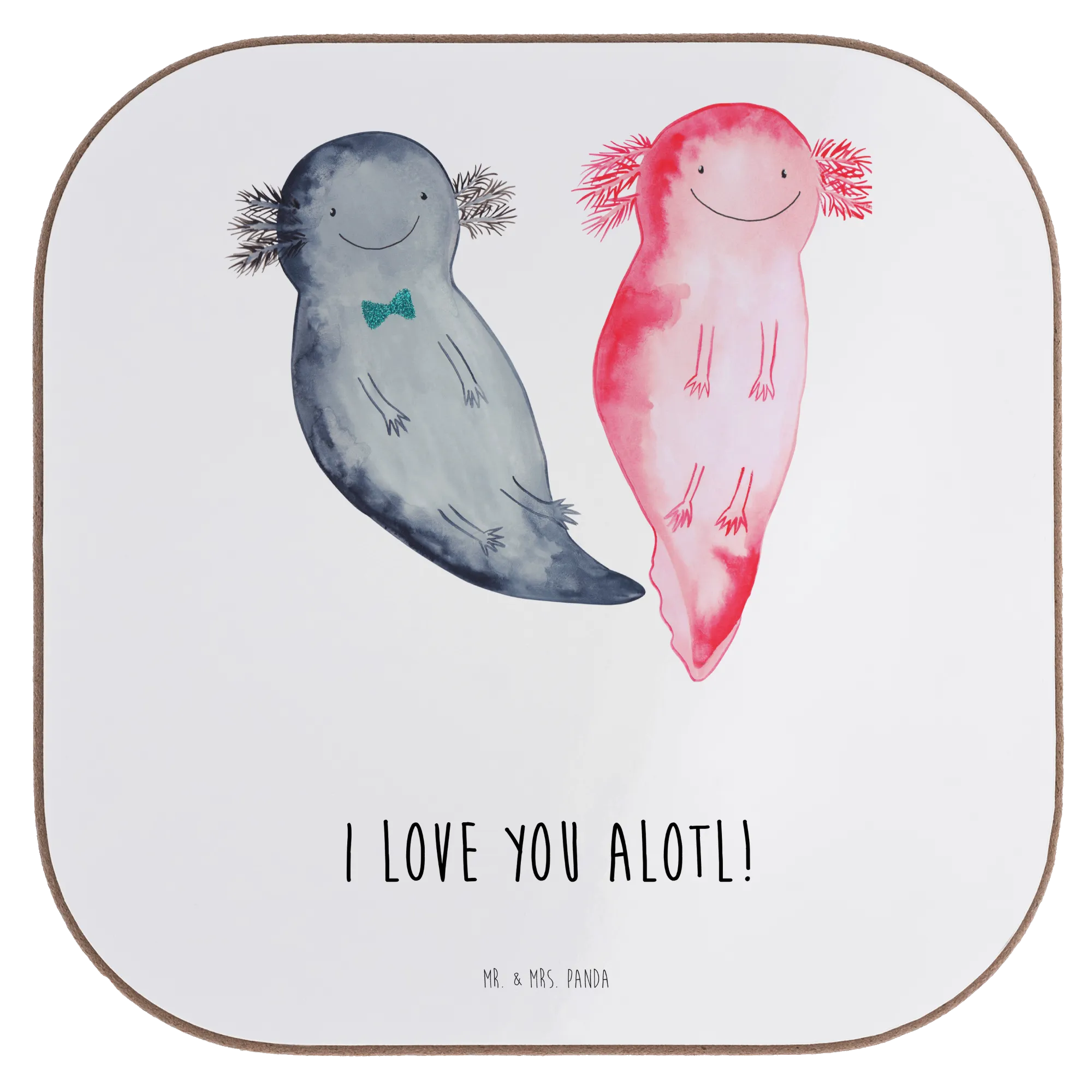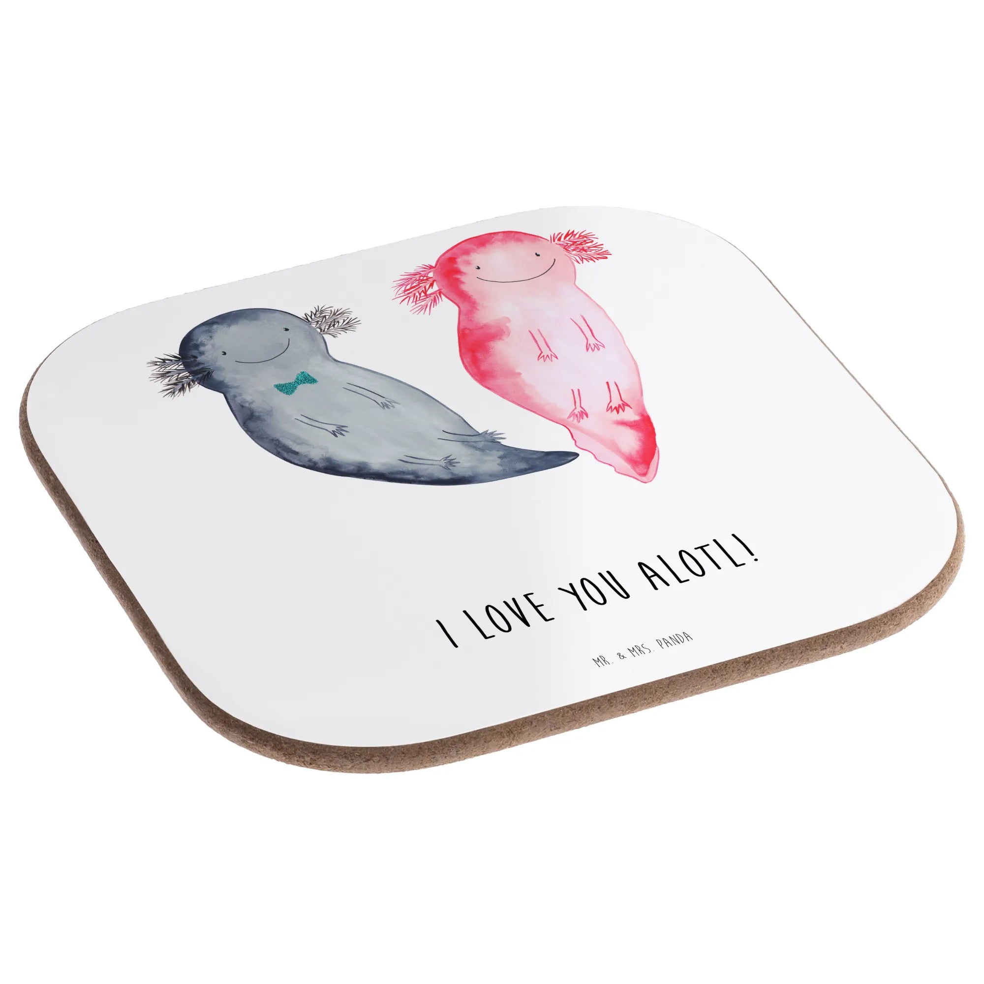 Der Untersetzer schützt deinen Tisch vor Abdrücken, Kratzern und extremen Temperaturen und bringt gleichzeitig einen Hauch von Niedlichkeit in deine Wohnung. Das Motiv zeigt zwei bezaubernde Axolotl, die lächeln und sich liebevoll anblicken. Diese kleinen Wesen symbolisieren Verbundenheit und Glückseligkeit – genau das, was jedem Paar am Herzen liegt! Die Fröhlichkeit des Designs zusammen mit dem Spruch 'I love you alotl!' sorgt für tägliche Schmetterlinge im Bauch. Jeder Untersetzer ist aus hochwertigem Hartfaser-Material gefertigt und hat eine glänzende, pflegeleichte Oberfläche, die sich im Handumdrehen mit einem feuchten Tuch reinigen lässt.