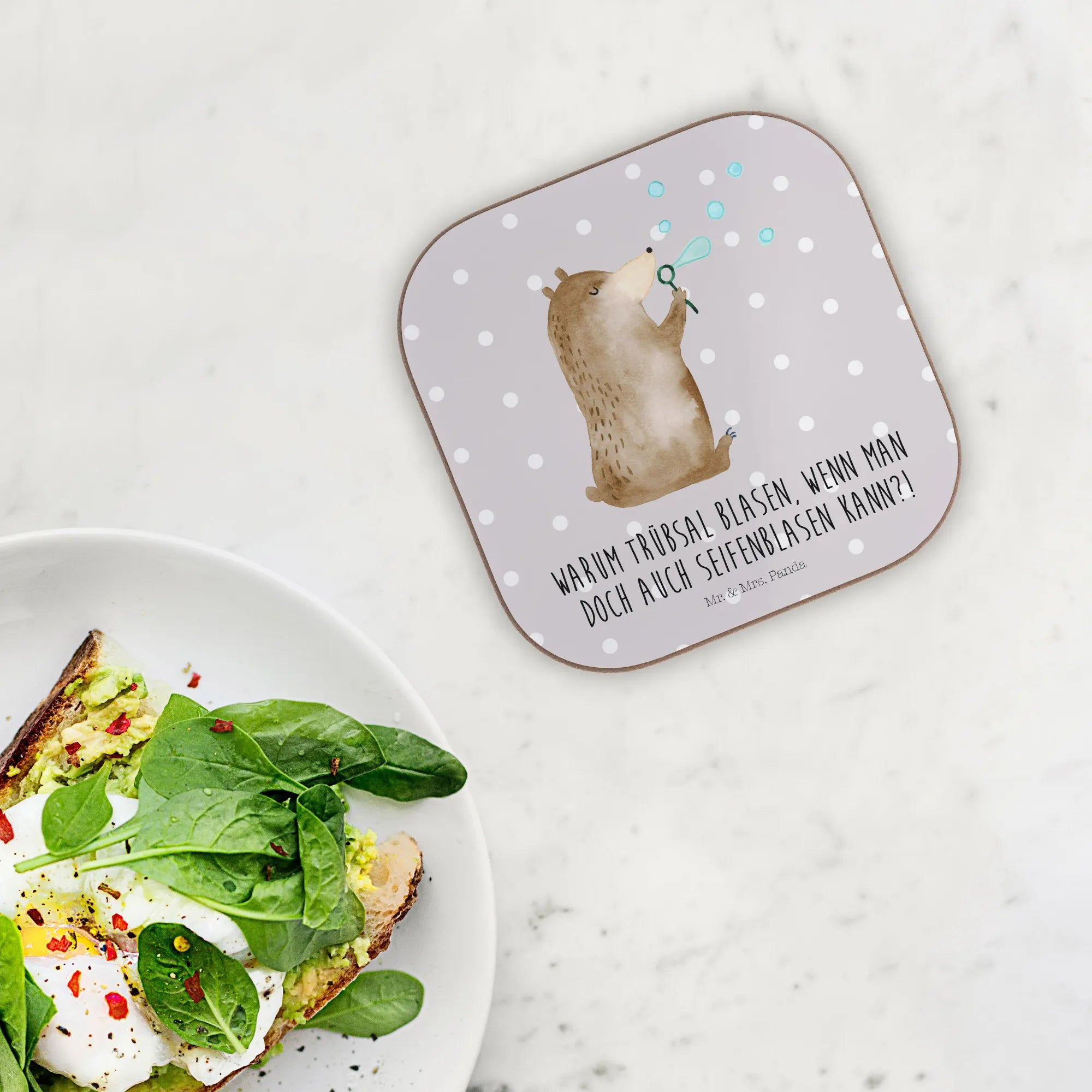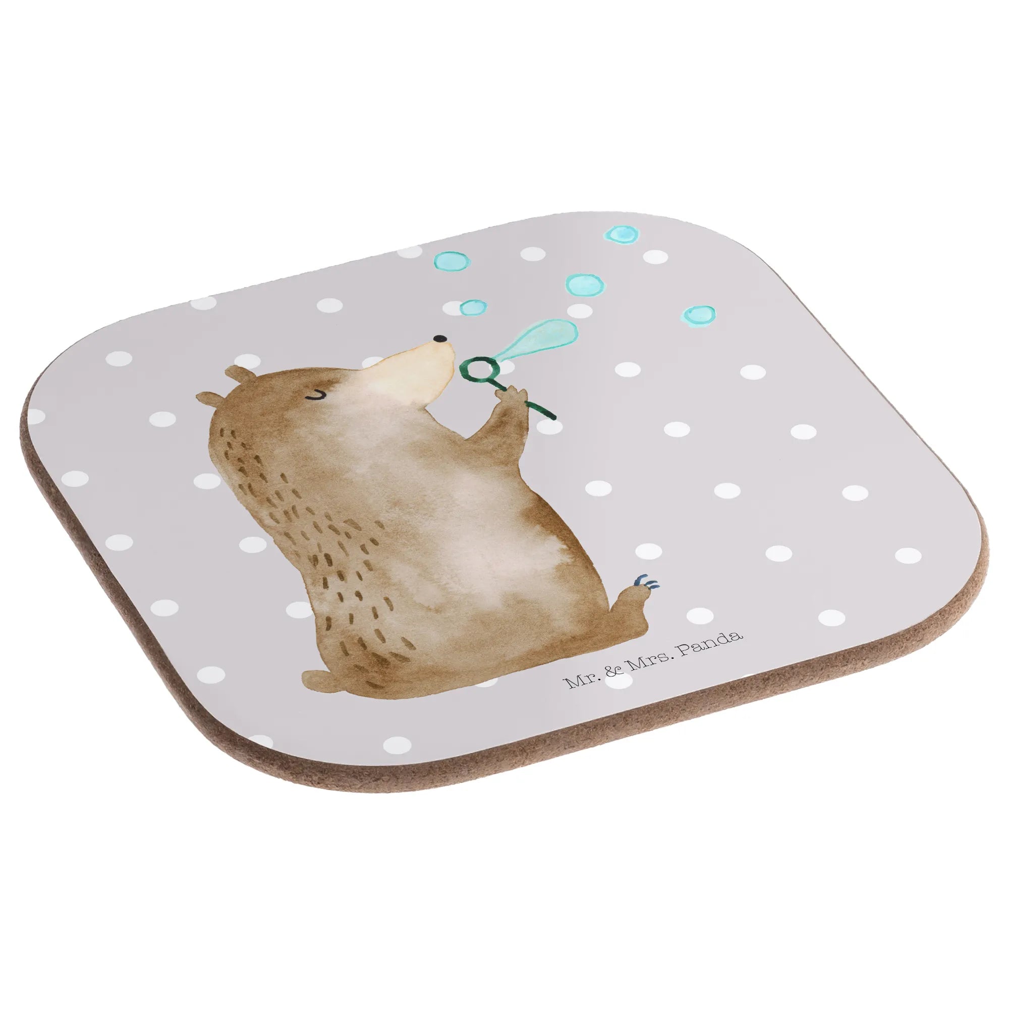 Ein wunderschöner quadratischer Untersetzer von Mr. & Mrs. Panda, bedruckt mit dem niedlichen Motiv "Bär Seifenblasen". Dieser einzigartige Untersetzer ist nicht nur ein praktisches Zubehör, um deinen Tisch vor Abdrücken, Kratzern und extremen Temperaturen zu schützen, sondern auch ein echter Blickfänger für deine Gäste.
