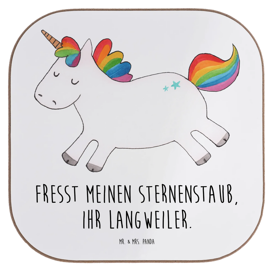 Entdecke den perfekten Untersetzer für alle Einhorn-Liebhaber und Spaßvögel! Mit dem "Einhorn Happy" Untersetzer von Mr. & Mrs. Panda bringst du Farbe und Lebensfreude in jedes Zuhause. Dieser einzigartige, quadratische Untersetzer (100 mm x 100 mm) begeistert nicht nur durch sein zauberhaftes Design mit dem fröhlichen Einhorn und der Botschaft "Fresst meinen Sternenstaub, ihr Langweiler", sondern schützt auch deinen Tisch vor unschönen Abdrücken, Kratzern und extremen Temperaturen.