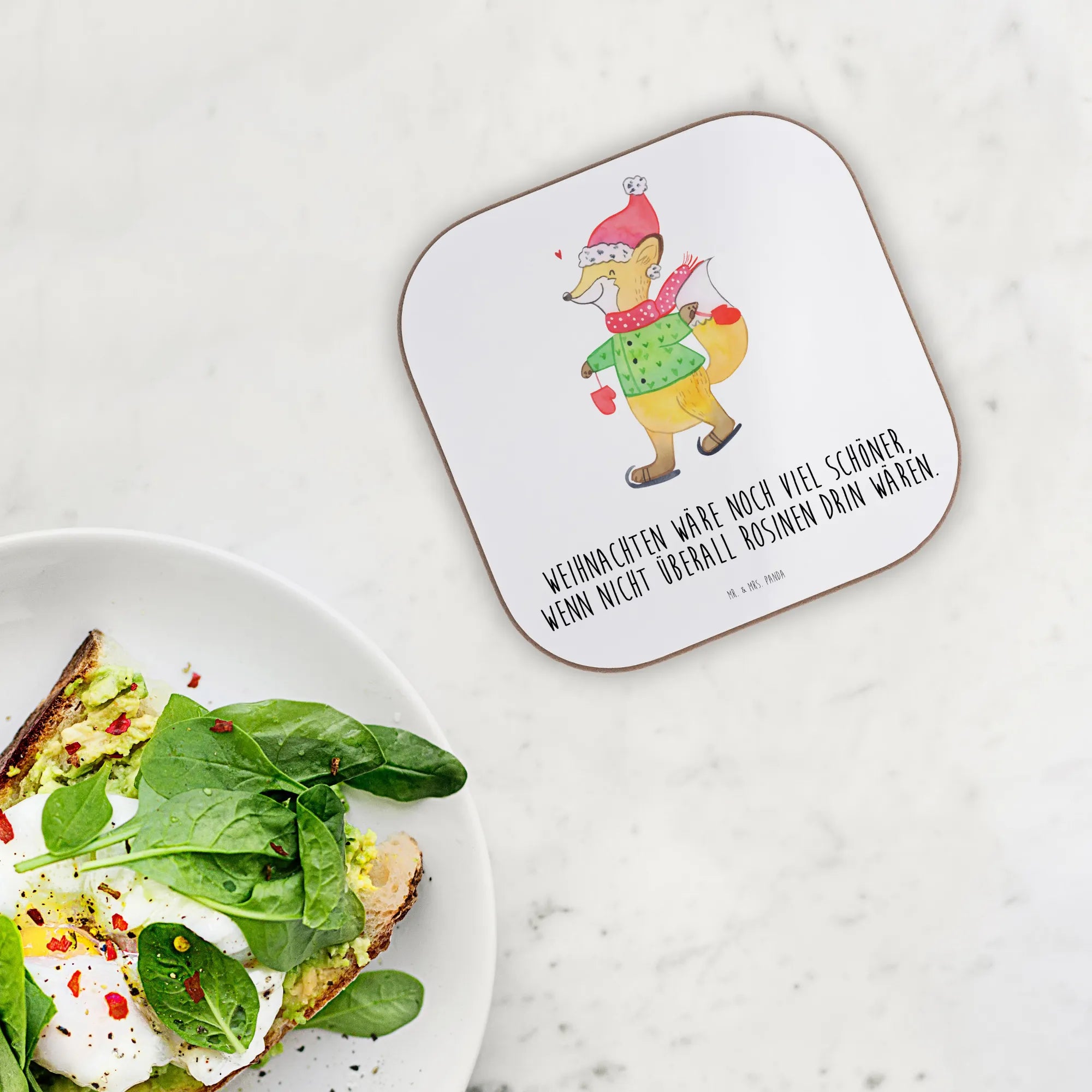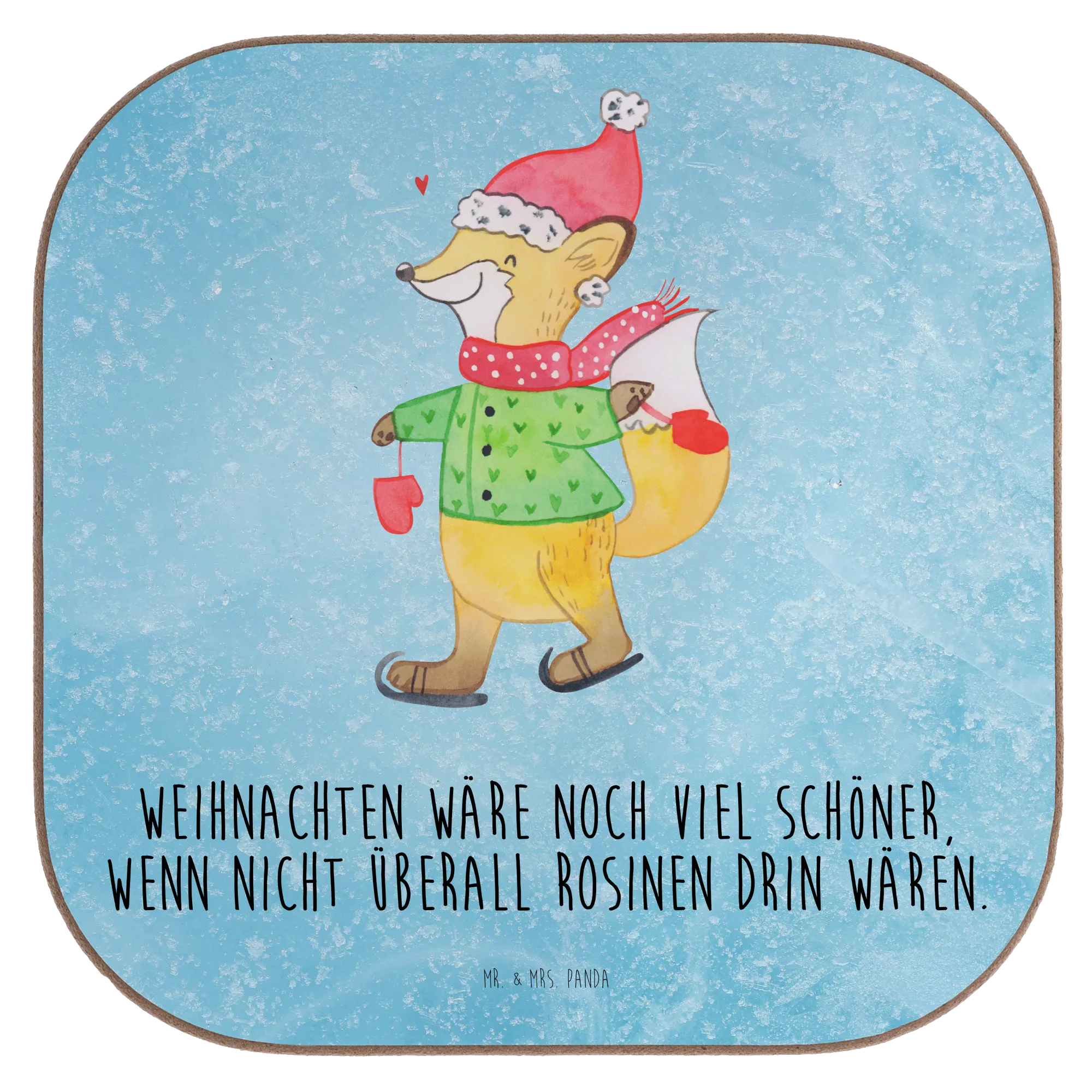 Juhu, die schönste Zeit des Jahres beginnt! Unser quadratischer Untersetzer „Fuchs Schlittschuhe" aus der Winter Kollektion von Mr. & Mrs. Panda bringt weihnachtliche Stimmung direkt auf deinen Tisch. Das liebevoll handgezeichnete Motiv zeigt einen fröhlichen Fuchs in grünem Mantel, rotem Schal und Weihnachtsmütze – und dazu der charmante Spruch: „Weihnachten wäre noch viel schöner, wenn nicht überall Rosinen drin wären."