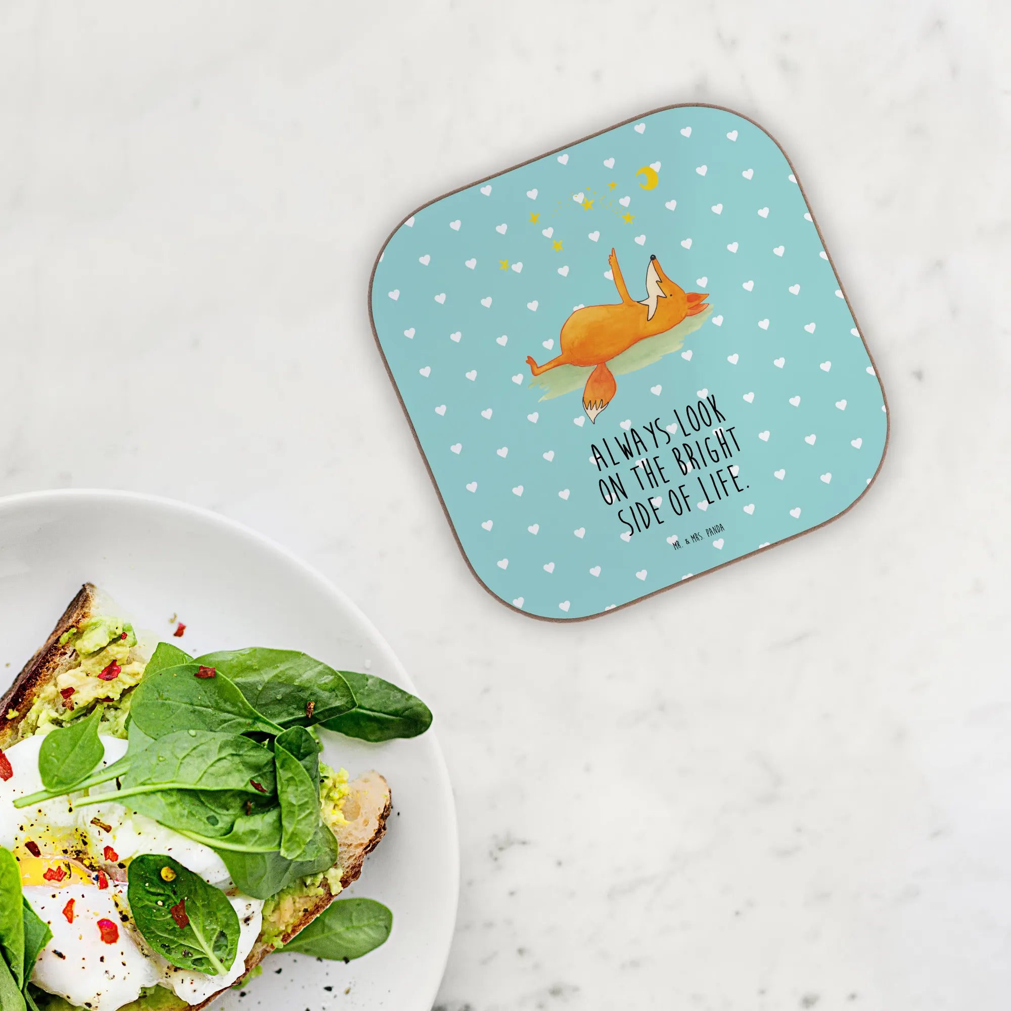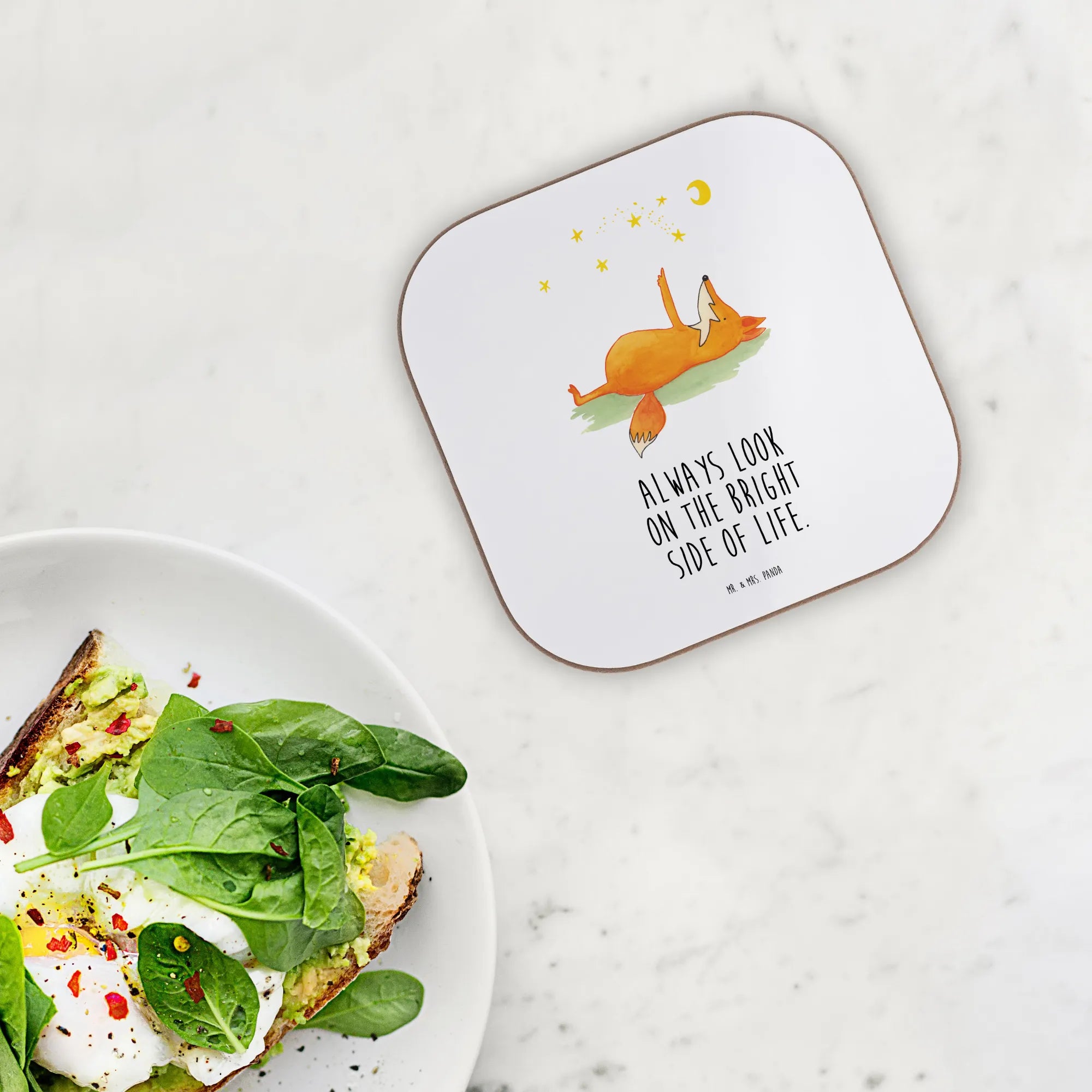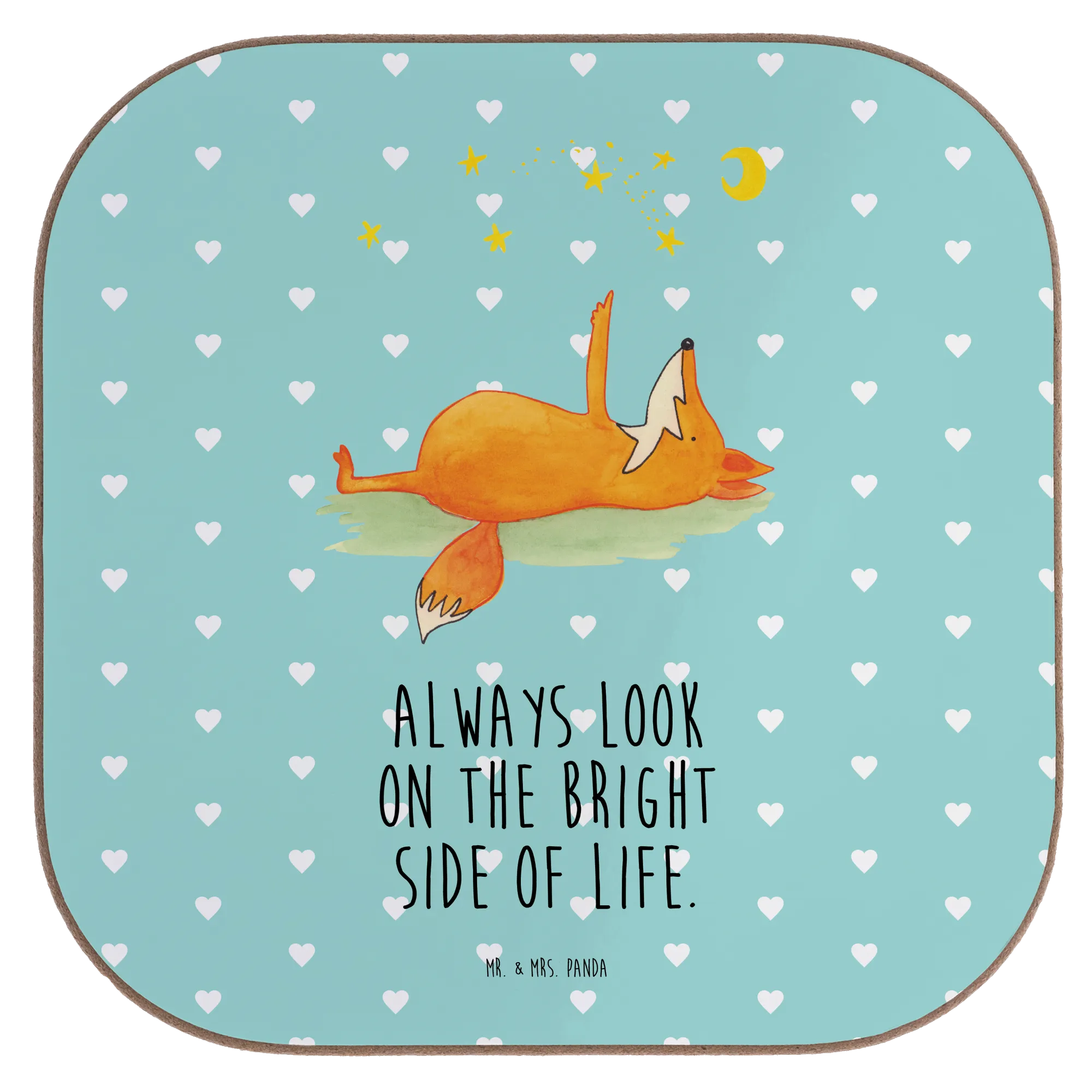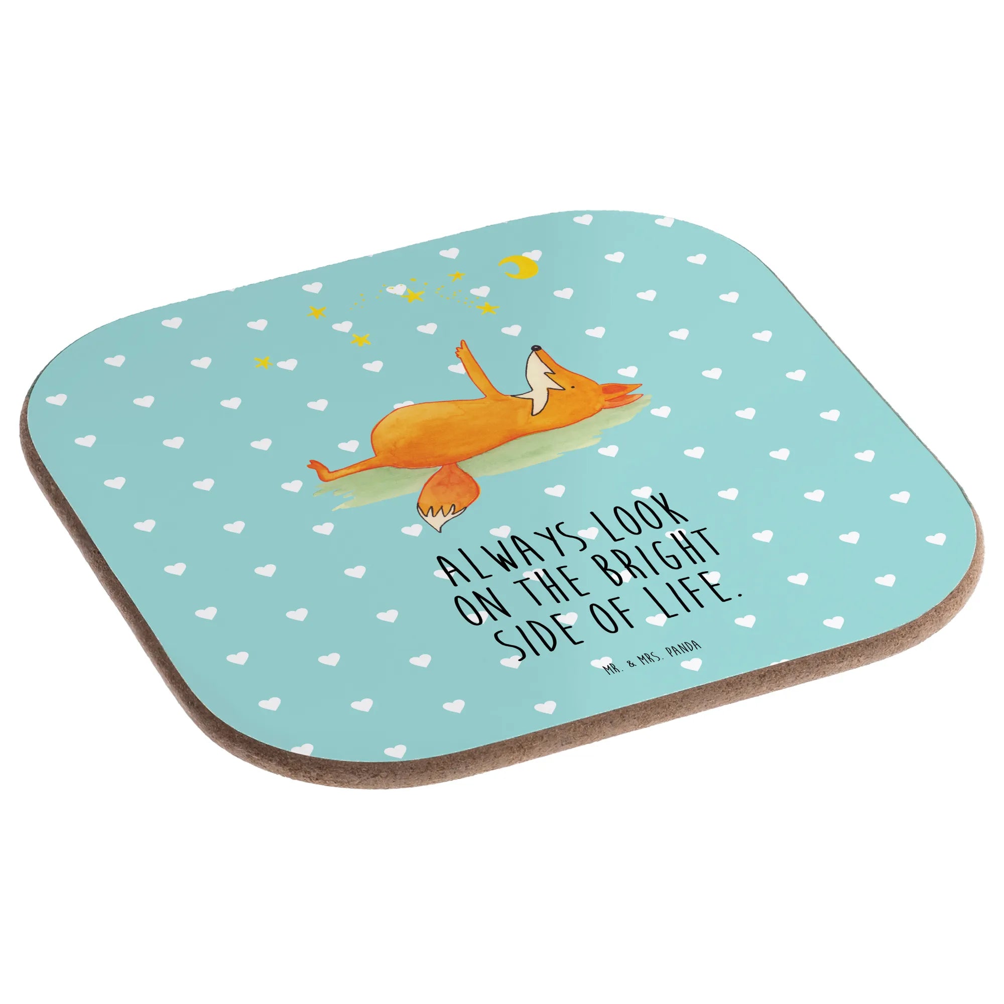 Entdecke die perfekte Geschenkidee mit unserem wunderschönen quadratischen Untersetzer "Fuchs Sterne" von Mr. & Mrs. Panda! Dieser Untersetzer ist nicht einfach nur ein praktisches Accessoire – er bringt auch eine Portion Lebensfreude und einen Hauch von Romantik in dein Zuhause. Mit einem süßen Fuchs, der gemütlich auf dem Rücken liegt und dem leuchtenden Sternenhimmel zuschaut, wird jeder Schluck aus deinem Glas zu einem kleinen besonderen Moment. Verziert mit dem mutmachenden Spruch "Always look on the bright side of life" erinnert dich dieser Untersetzer daran, das Positive im Leben zu sehen. Ist das nicht wunderschön?
