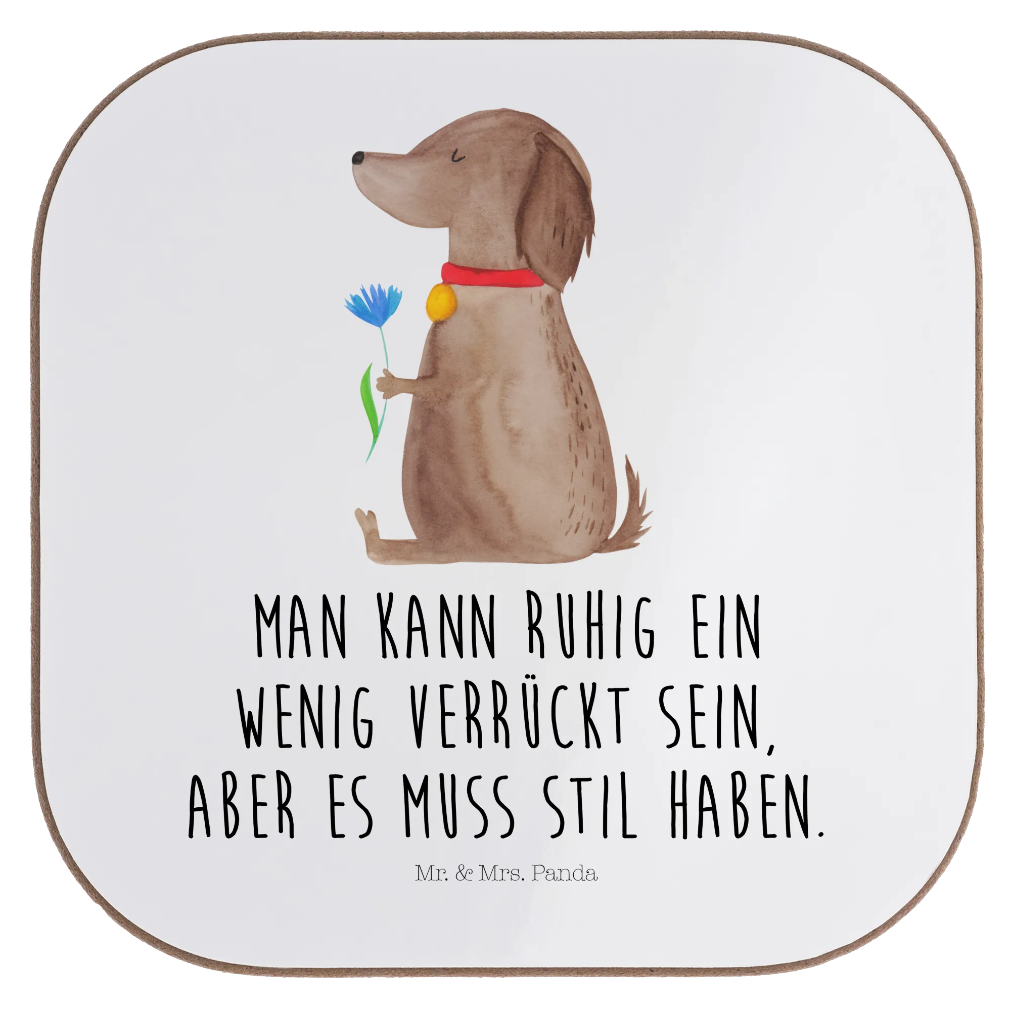 Der Spruch 'Man kann ruhig ein wenig verrückt sein, aber es muss Stil haben.' unterstreicht perfekt das Lebensgefühl von uns Hundebesitzern. Wir wissen alle, dass das Leben mit einem Hund manchmal ein bisschen chaotisch sein kann, aber mit diesem edlen Accessoire auf deinem Tisch zeigst du, dass du dabei niemals deinen Sinn für Stil verlierst. Das Motiv wurde von Mrs. Panda liebevoll mit Aquarell handgezeichnet und macht diesen Glasuntersetzer zu einem echten Kunstwerk.