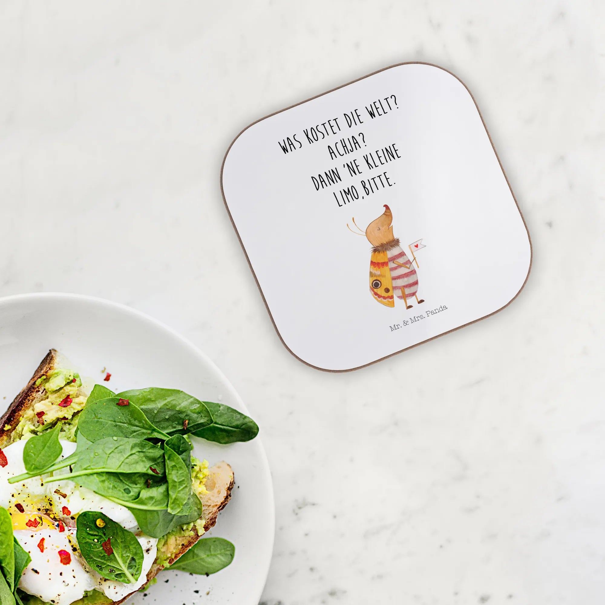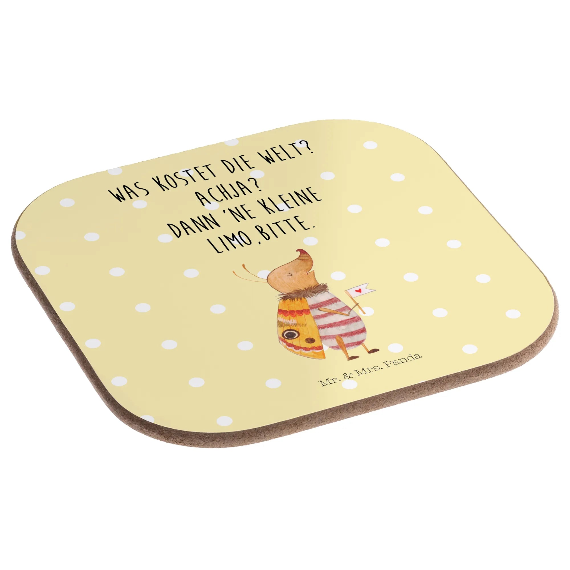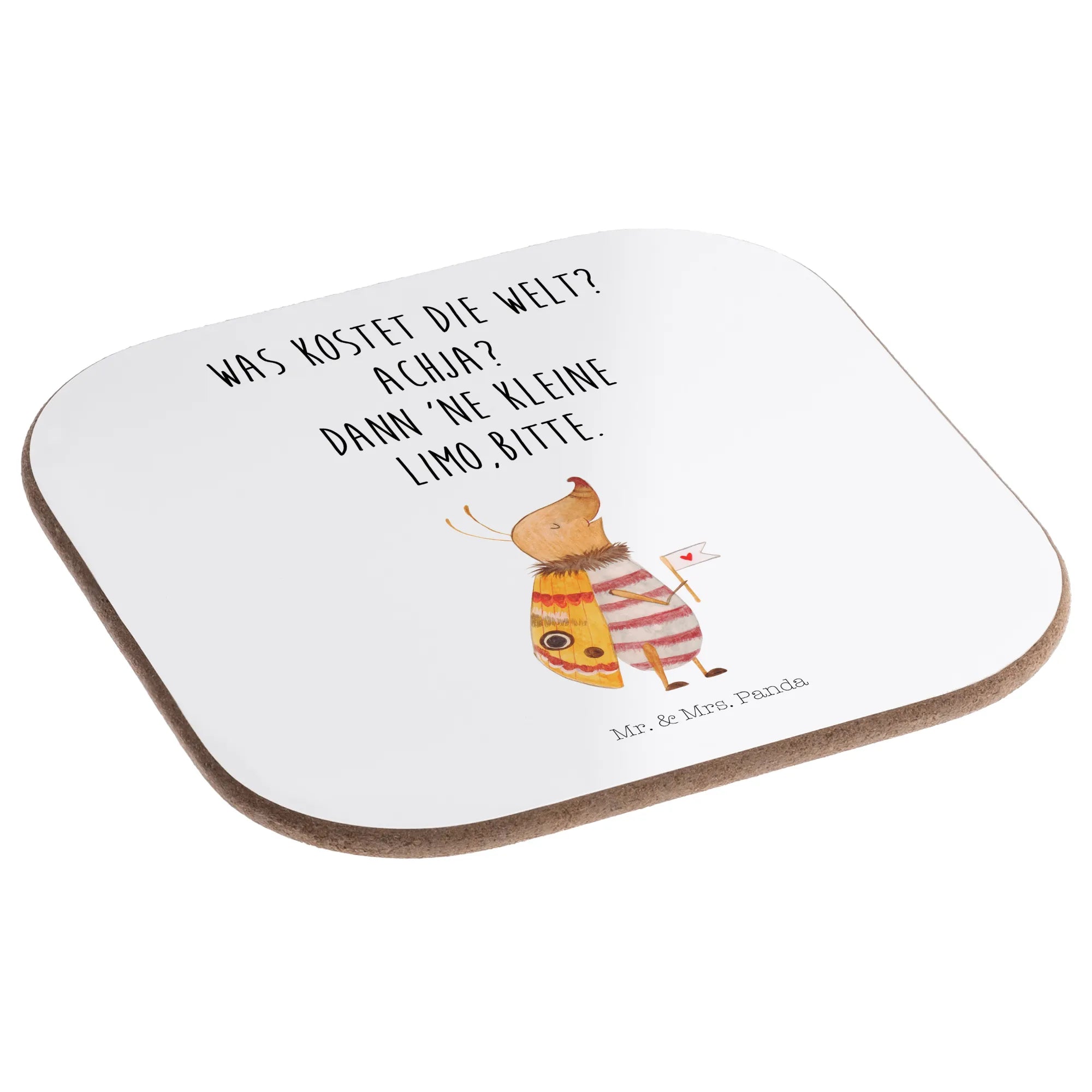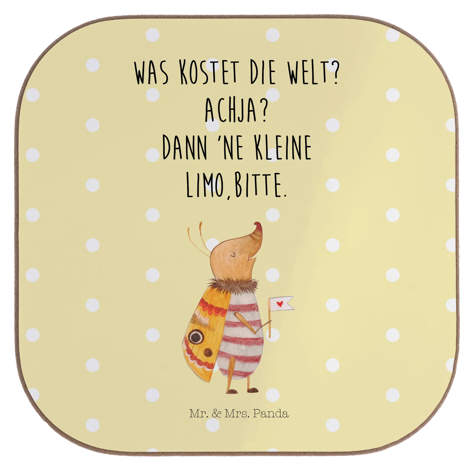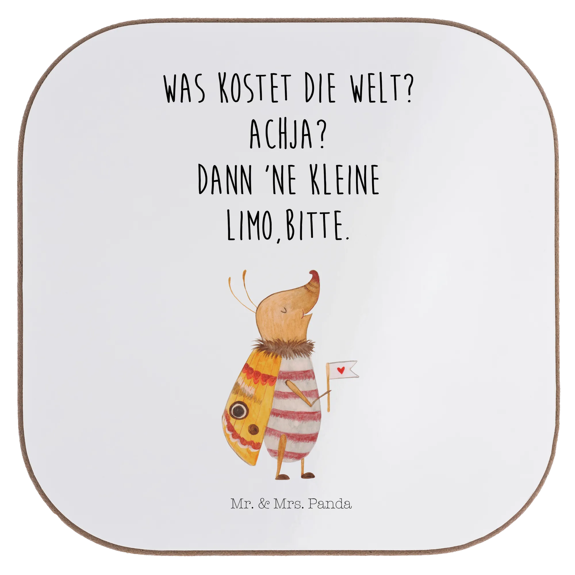 Komm mit auf eine kleine, zauberhafte Reise! Unser quadratischer Untersetzer „Nachtfalter mit Fähnchen“ aus der Small World Kollektion von Mr. & Mrs. Panda ist mehr als nur ein Glasuntersetzer – er ist ein kleines Kunstwerk für deinen Tisch. Der niedliche Nachtfalter mit herzförmigem Fähnchen lächelt dich an, während der freche Spruch „Was kostet die Welt? Achja? Dann ne kleine Limo, bitte.“ für Schmunzler bei jedem Getränk sorgt. 🍋