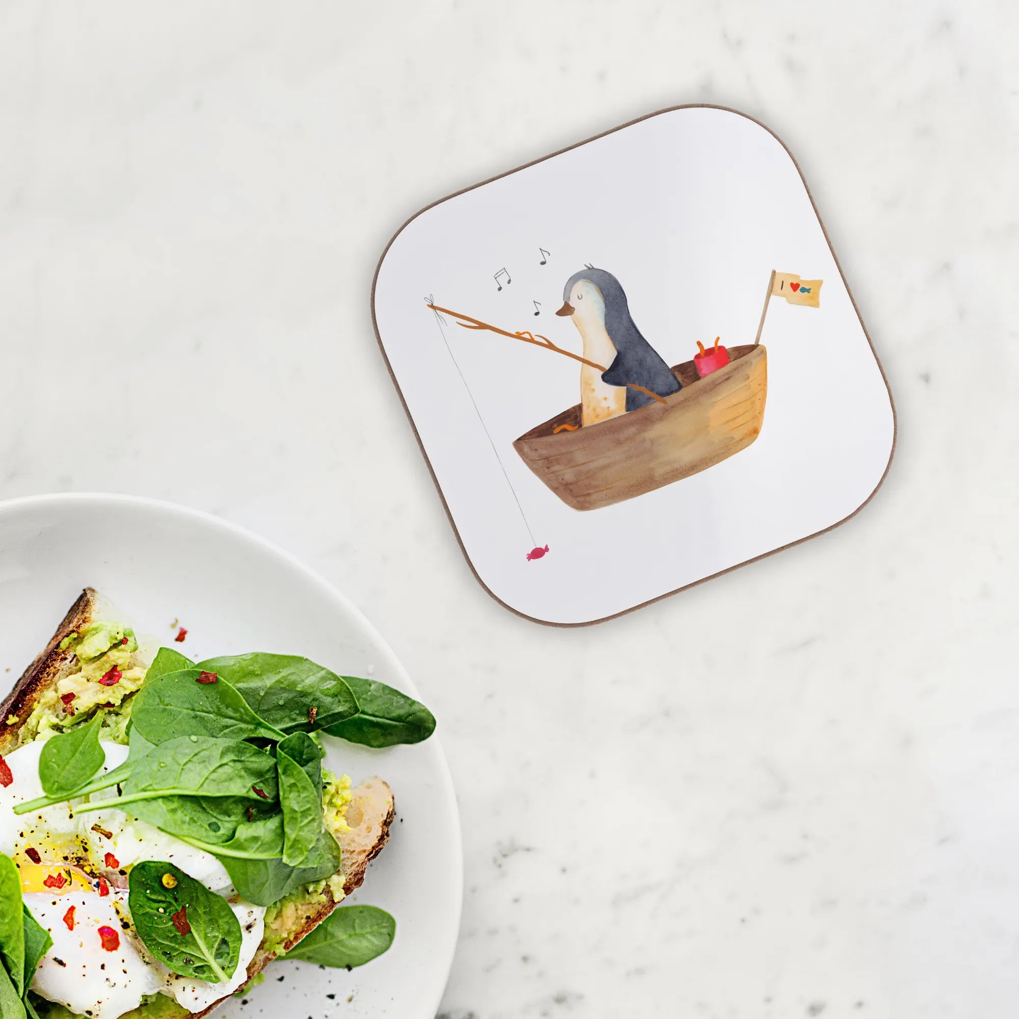 Mit einem süßen Pinguin, der fröhlich in einem kleinen Angelboot sitzt und mit Bonbons angelt, zaubert er garantiert jedem ein Lächeln ins Gesicht. Dieser Untersetzer ist aus hochwertigem Hartfaser gefertigt und schützt deinen Tisch vor Abdrücken, Kratzern und extremen Temperaturen. Bei einem Maß von 100 mm x 100 mm und einer Dicke von 5 mm bietet er genügend Platz für deine Tassen und Gläser. Pflegeleicht kannst du ihn einfach mit einem feuchten Tuch abwischen.