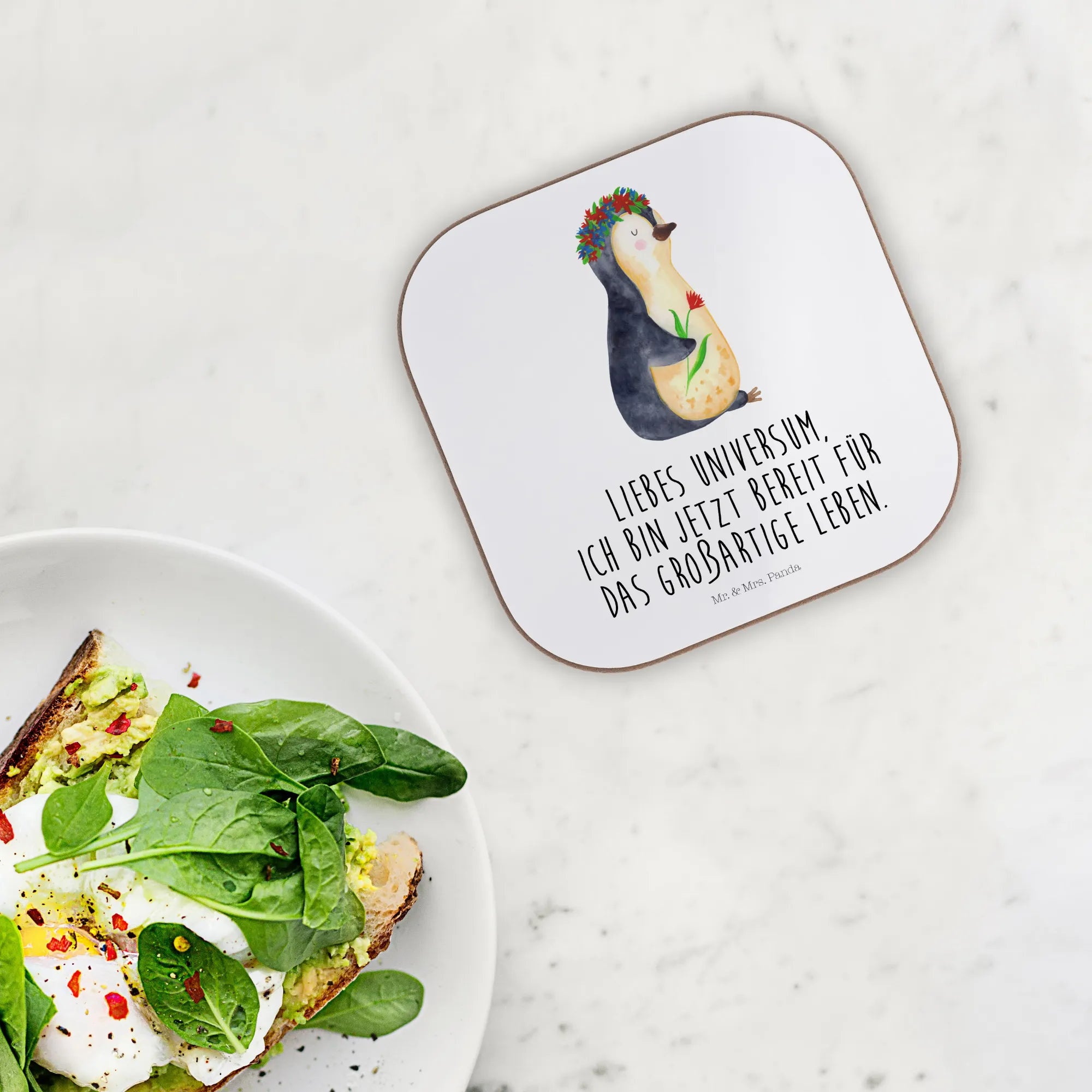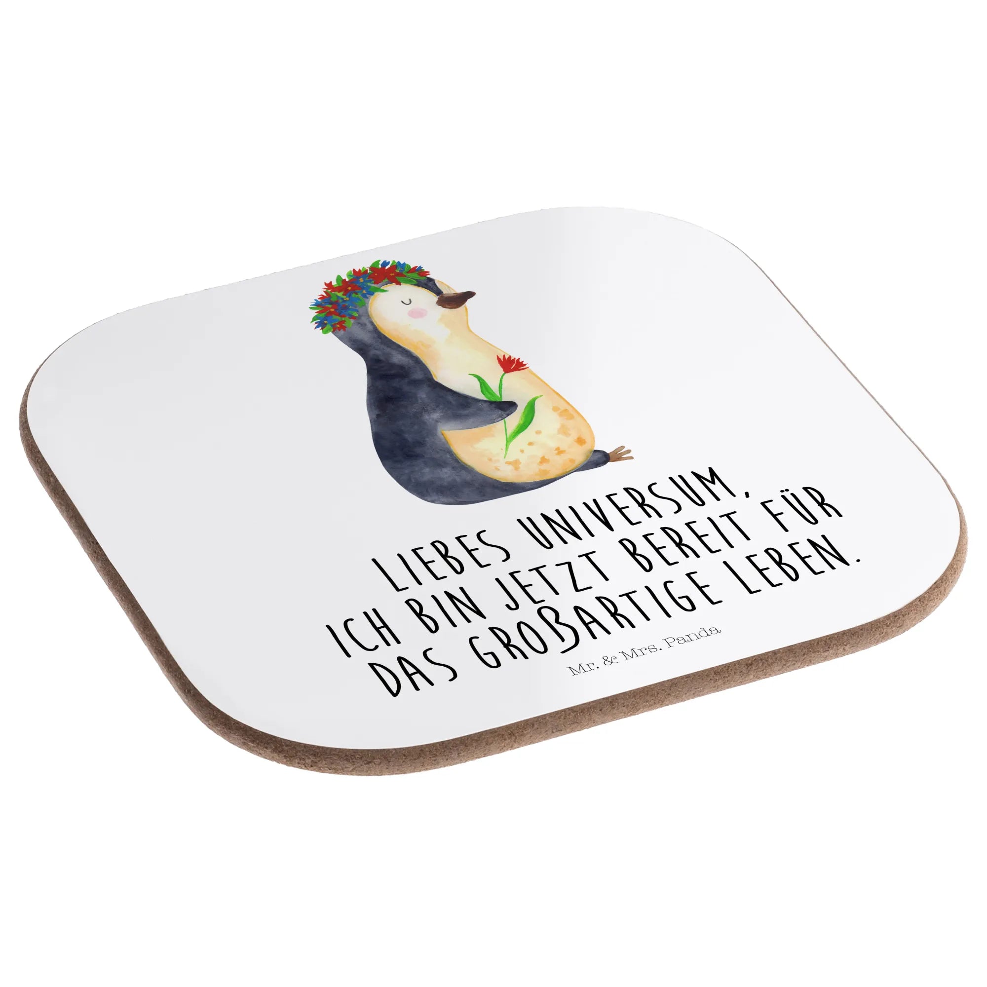 Suchst du nach einem bezaubernden Geschenk für einen Pinguin-Liebhaber oder einfach nur einen coolen Einrichtungsgegenstand für dein Zuhause? Unser wunderschöner quadratischer Untersetzer mit dem süßen Pinguin Blumenkranz Motiv aus der Pinguin-Kollektion von Mr. & Mrs. Panda ist die perfekte Wahl! Mit dem Slogan 'Liebes Universum, ich bin jetzt bereit für das großartige Leben.' inspiriert dieser Untersetzer nicht nur, sondern schützt auch deinen Tisch vor unschönen Abdrücken und Kratzern.