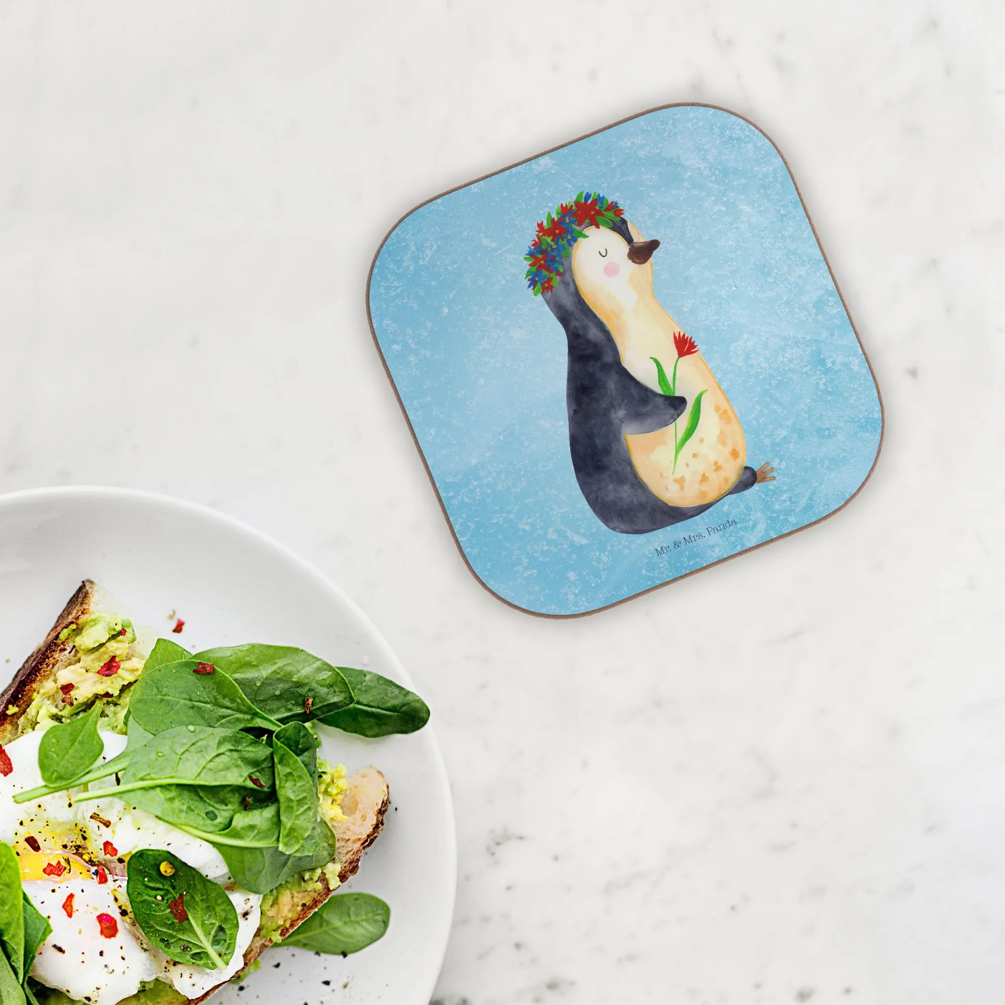 Tischuntersetzer Pinguin Blumen - ohne Spruch - Eisblau
