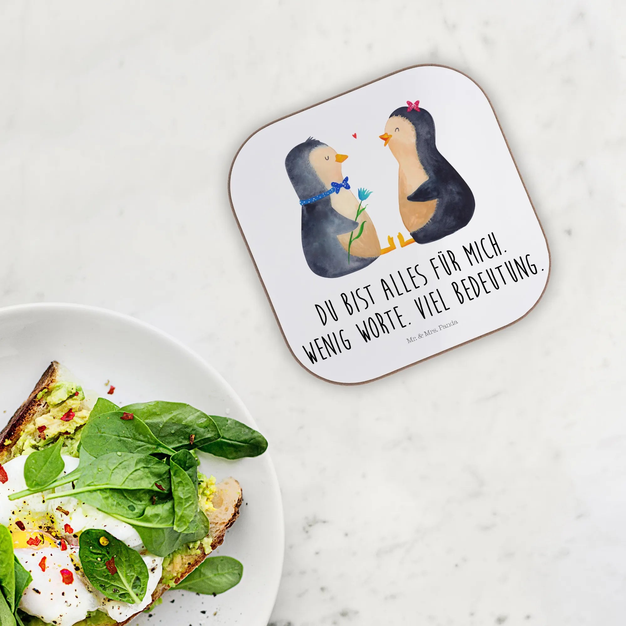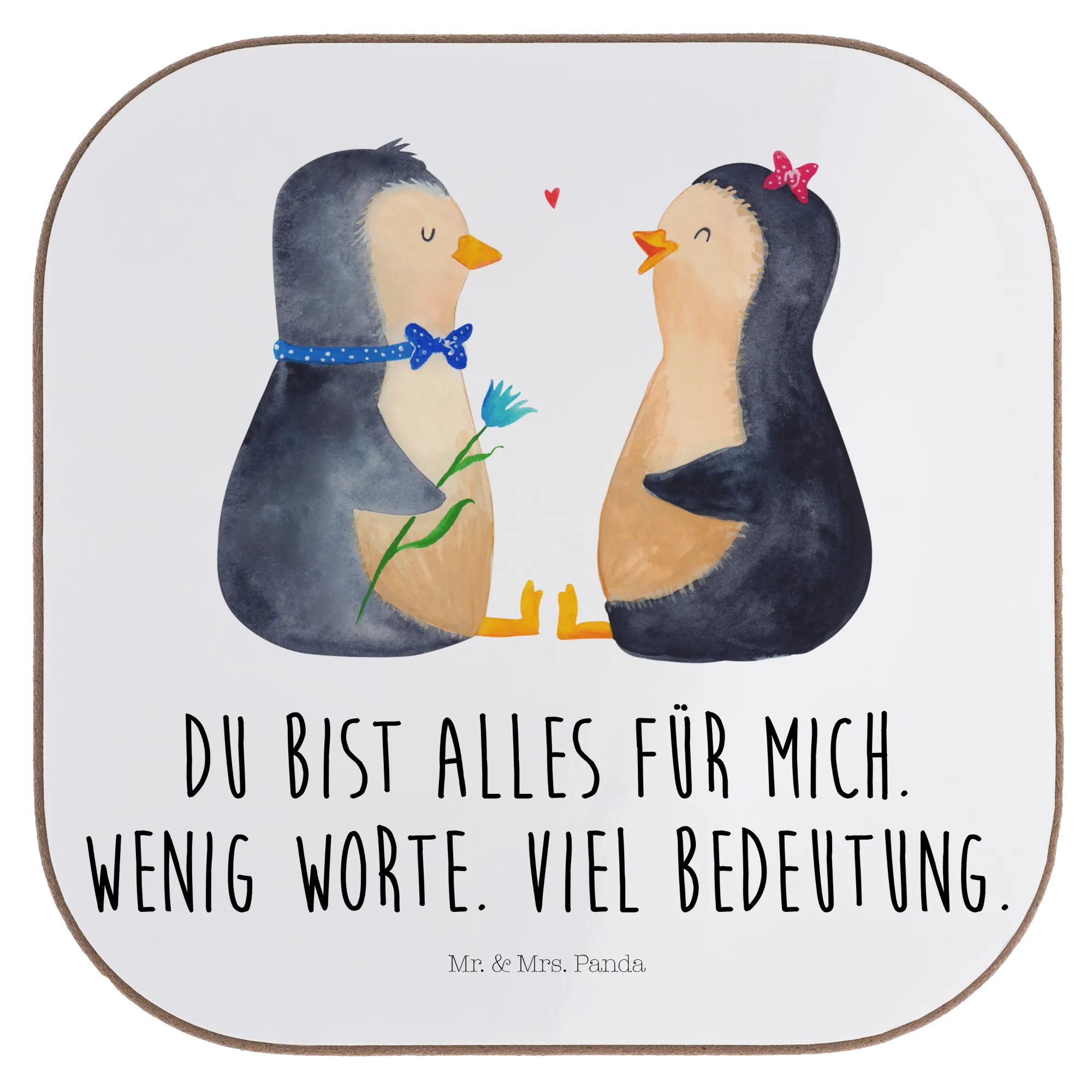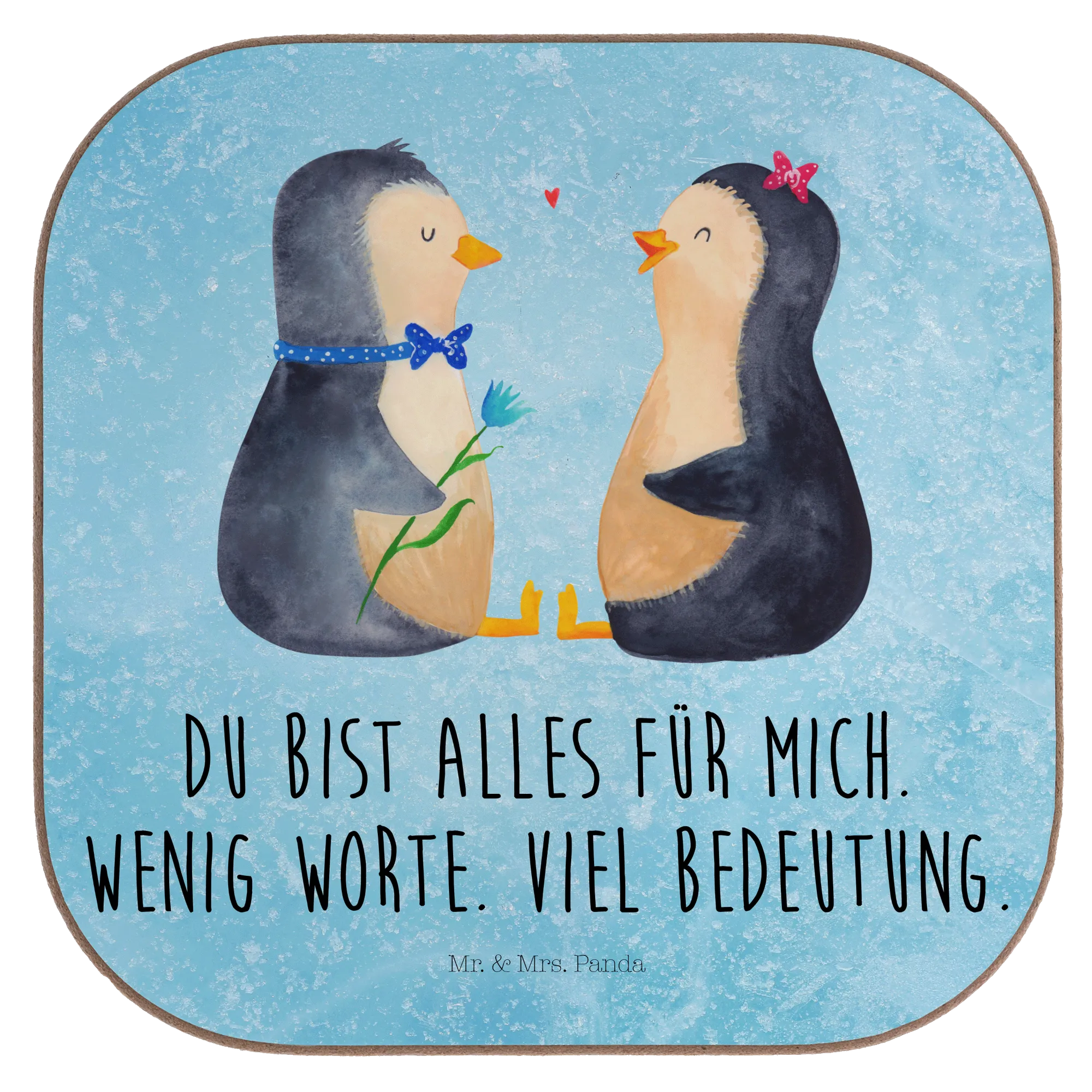Dieser zauberhafte Untersetzer zeigt zwei liebevoll handgezeichnete Pinguine, die sich voller Zärtlichkeit anschauen. Das Motiv aus der Pinguin - Kollektion ist perfekt für alle, die kleine Liebesbotschaften groß schreiben: mit dem Spruch „Du bist alles für mich. Wenig Worte. Viel Bedeutung.“ wird der Untersetzer zum emotionalen Liebesgeschenk für Verlobung, Jahrestag oder Hochzeit.