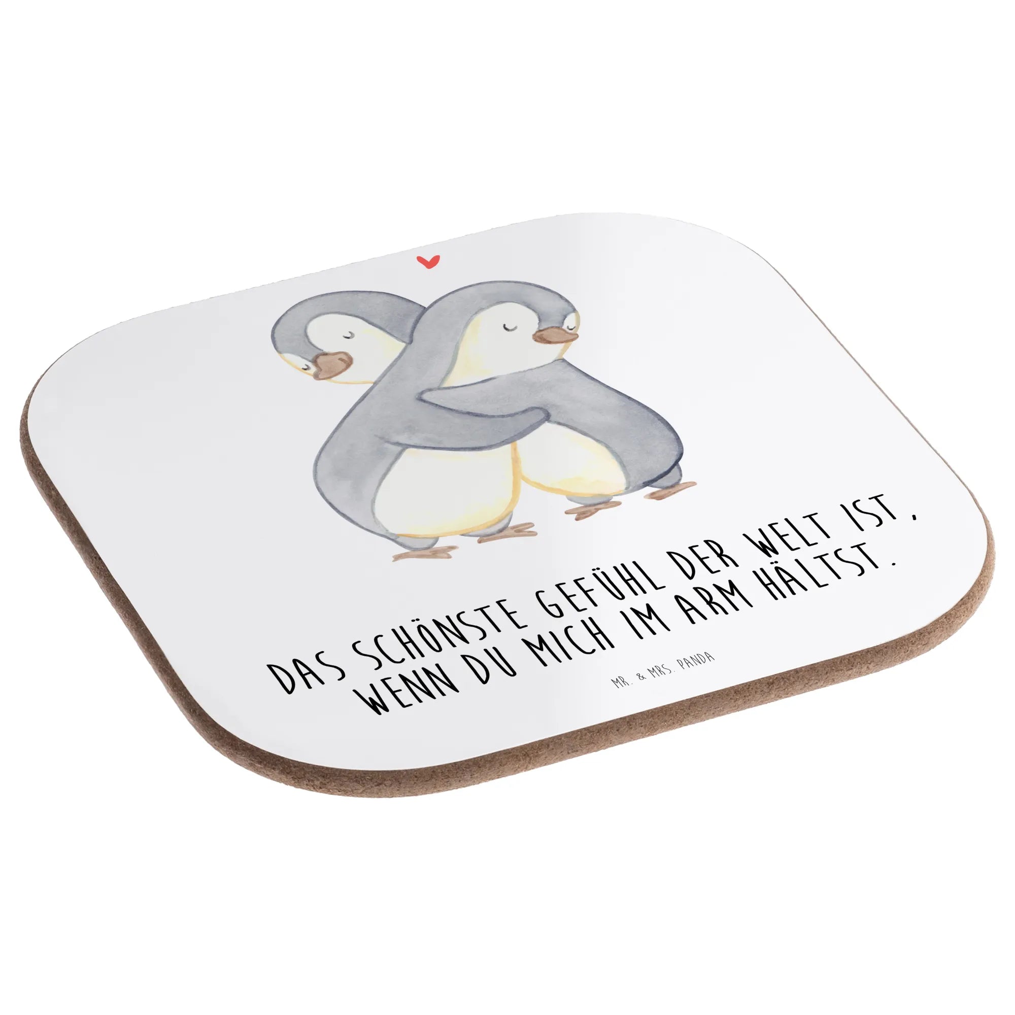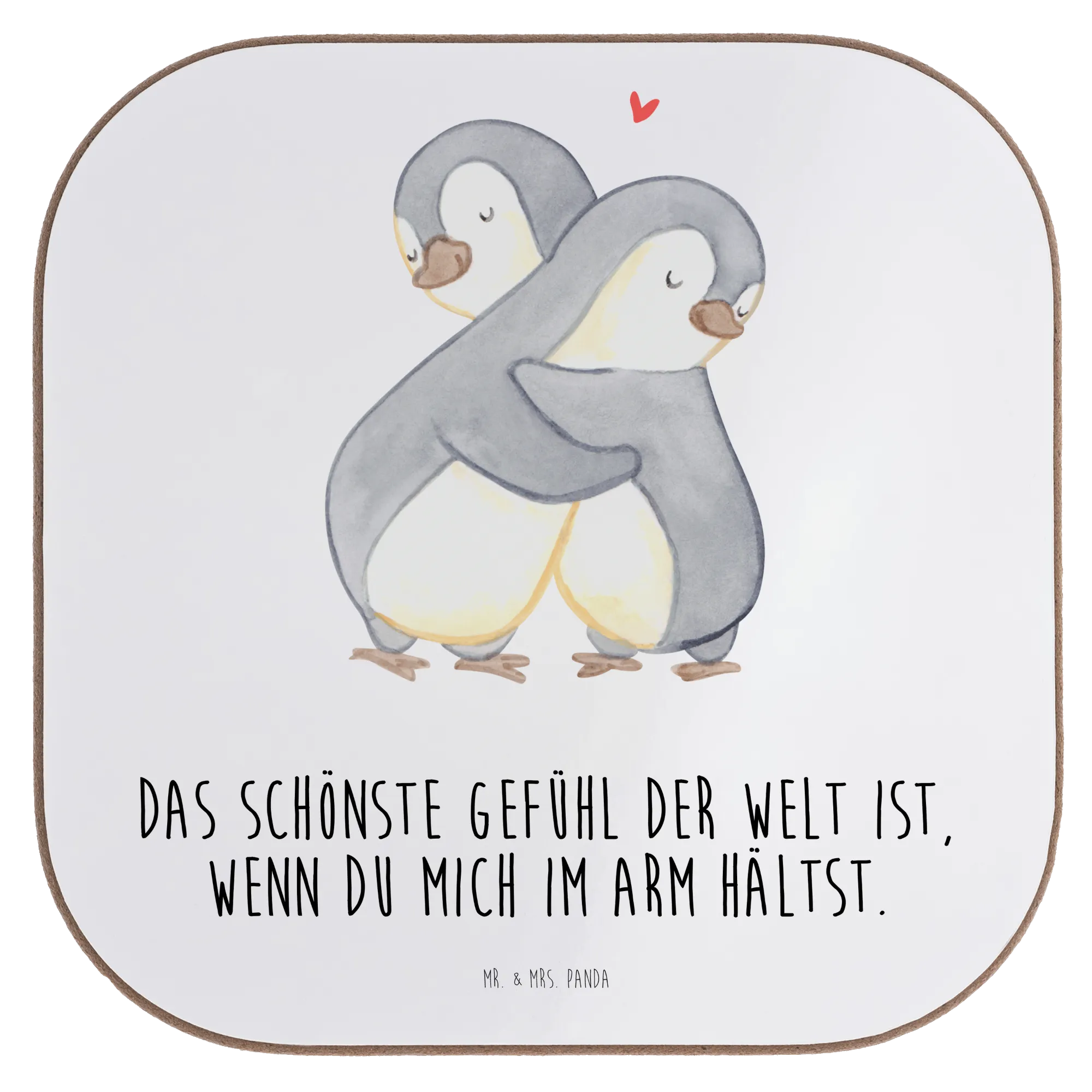 Ein liebevoller Blickfang für deinen Tisch 💕 Unser quadratischer Untersetzer „Pinguine Kuscheln“ aus der Liebe-Kollektion von Mr. & Mrs. Panda zeigt zwei innig umarmende Pinguine in sanften Grau- und Beigetönen mit einem kleinen roten Herz. Der zärtliche Spruch „Das schönste Gefühl der Welt ist, wenn du mich im Arm hältst.“ macht ihn zum perfekten Liebesgeschenk für Freundin, Freund, Partner oder Ehepartner.