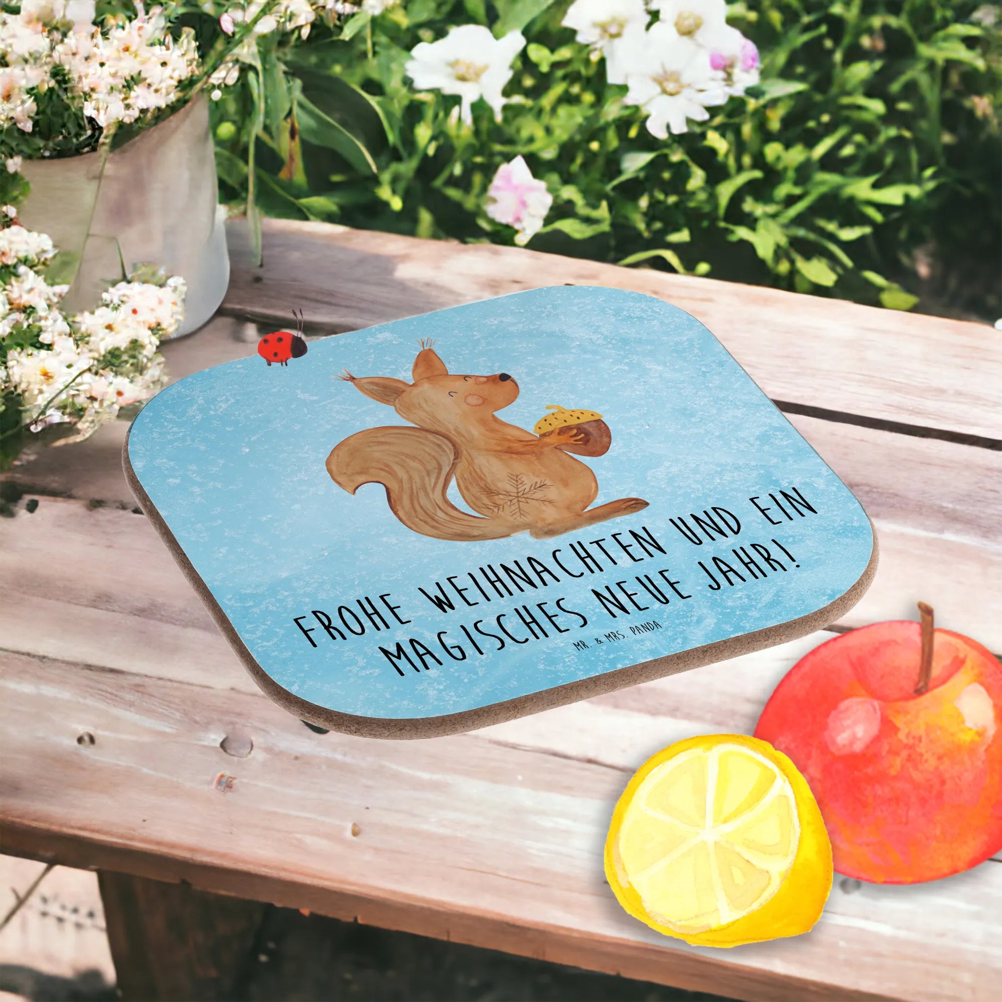 Das liebevoll gestaltete Motiv zeigt ein kleines, zufriedenes Eichhörnchen aus unserer Winter Kollektion, das behutsam eine Eichel hält und die Augen schließt, um den Moment zu genießen. Begleitet von dem herzlichen Spruch "Frohe Weihnachten und ein magisches neues Jahr!", ist dieser Untersetzer weit mehr als nur ein praktischer Alltagshelfer. Er ist ein Stück Lebensfreude, das dich durch die kalte Jahreszeit begleitet. ✨