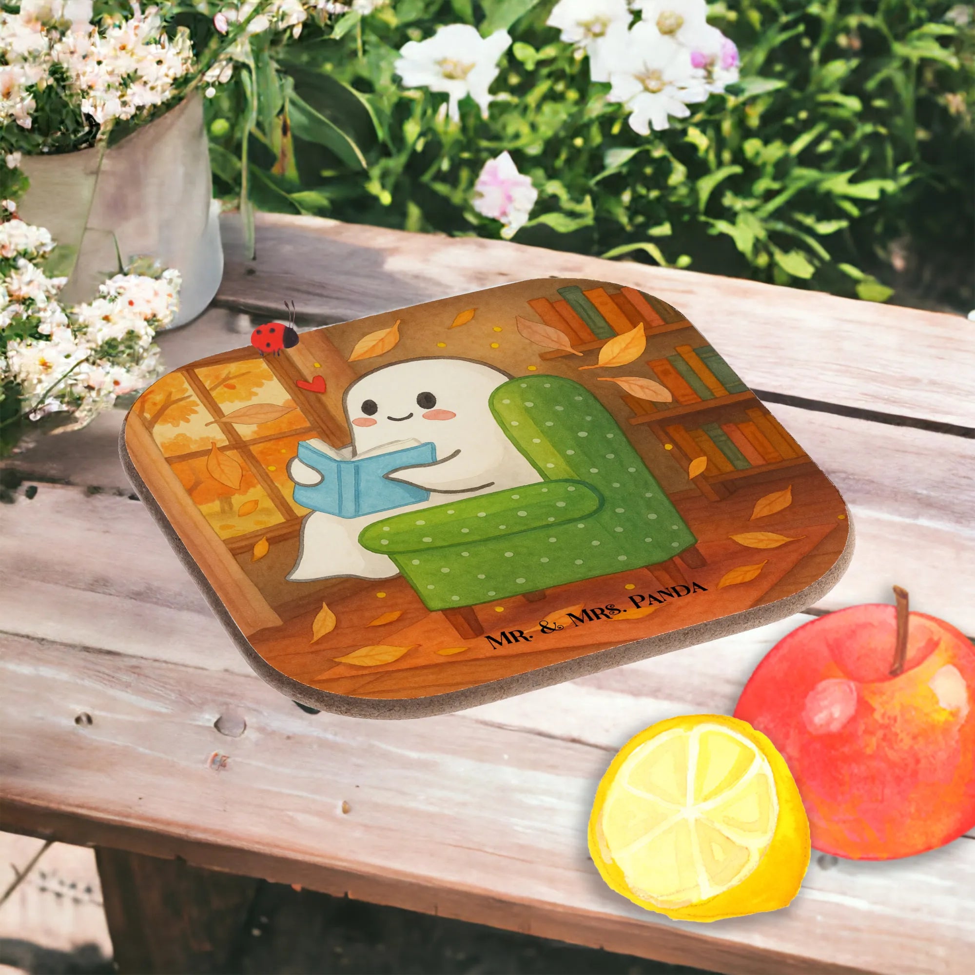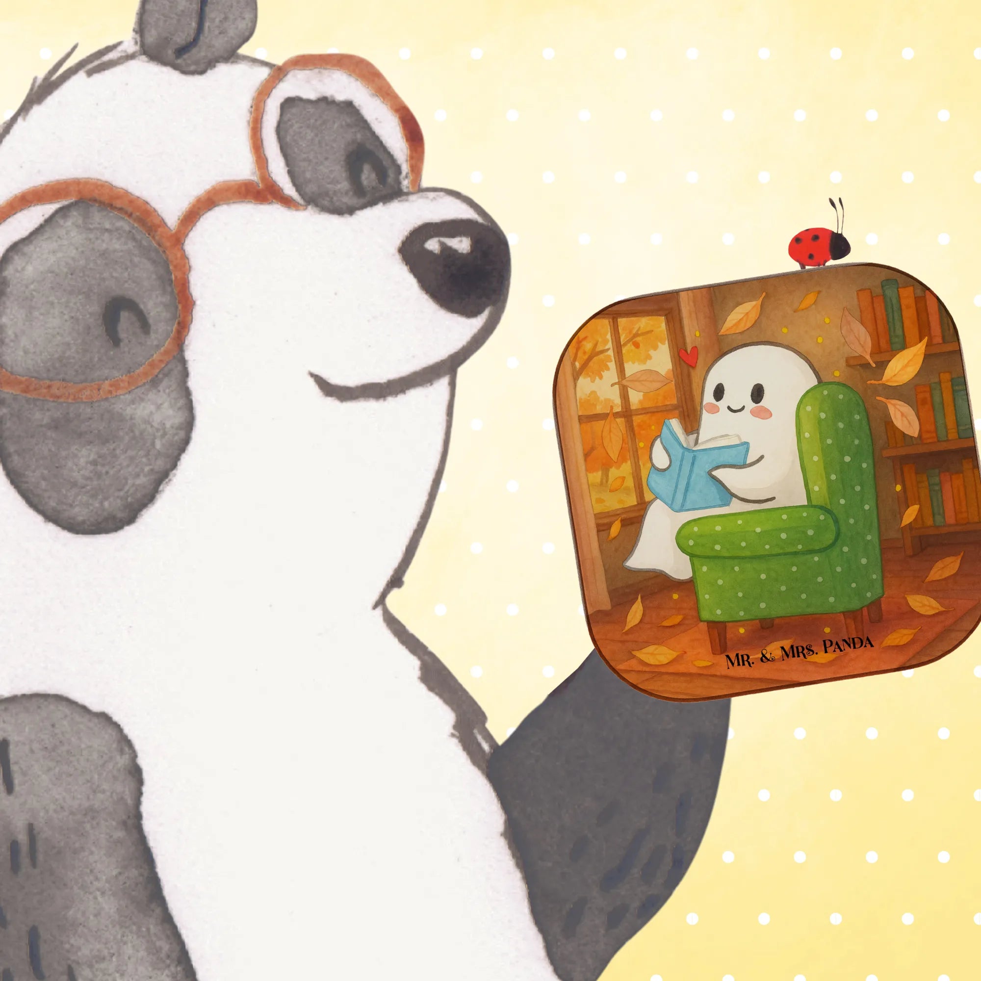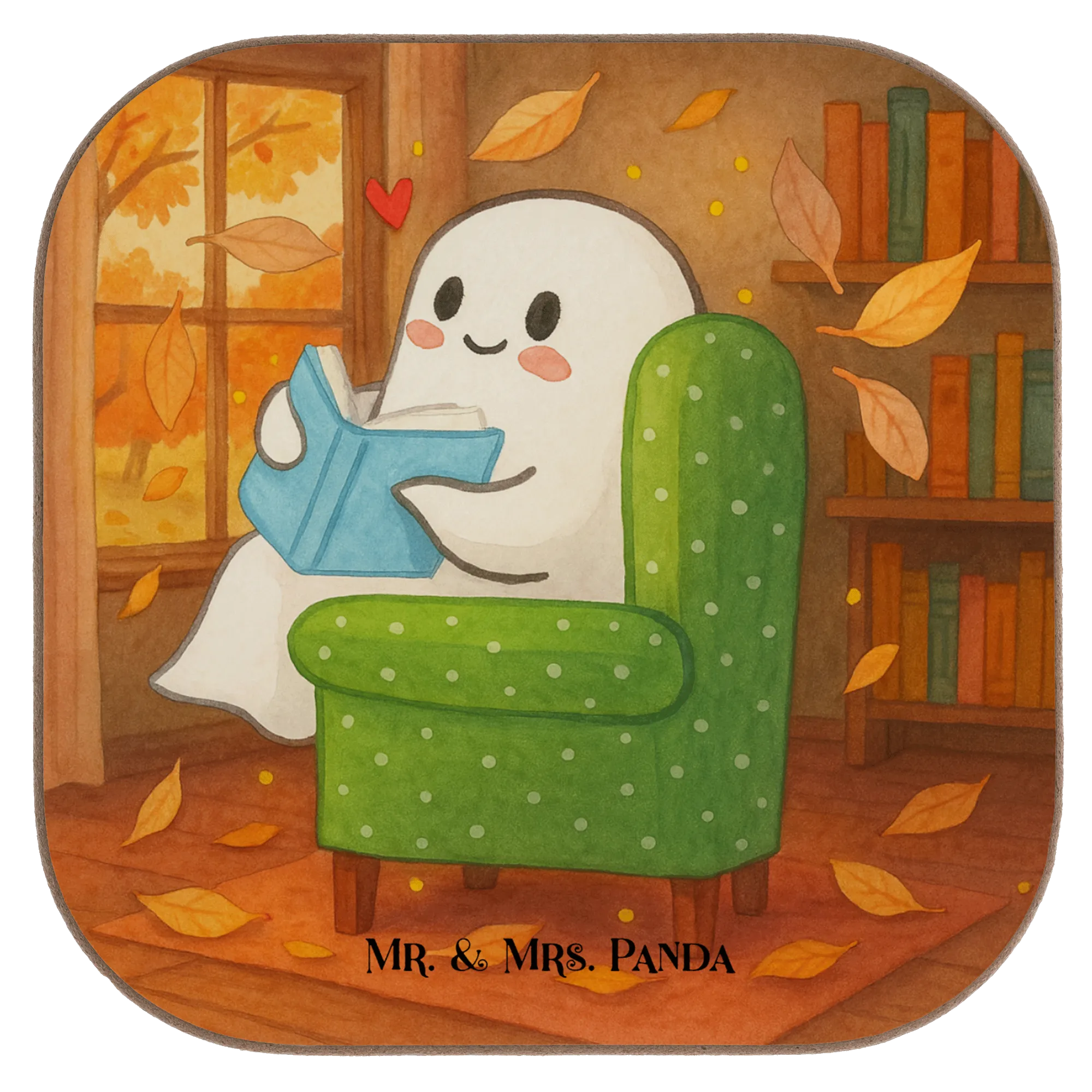 Mr. & Mrs. Panda Untersetzer „Gespenst Buch“ – perfekt für gemütliche Herbstabende, Lese-Sessions und niedliche Halloween-Deko. Das liebevoll illustrierte Gespenst sitzt in einem grünen Sessel und liest ein blaues Buch, umgeben von fallenden Herbstblättern und einem kleinen roten Herz. Dieses Motiv zaubert sofort Wohlfühlstimmung in Dein Zuhause. 🍂📚👻