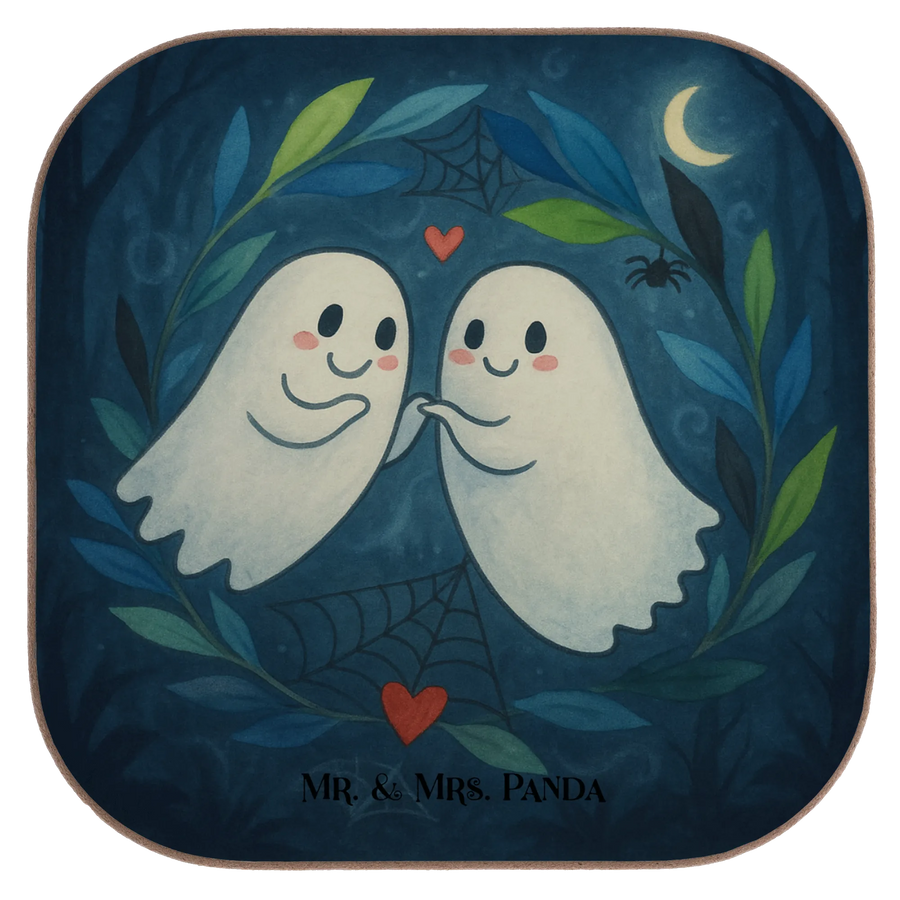 Ein Pärchen aus freundlich gezeichneten Gespenstern, das sich liebevoll aneinander anschmiegt — so einfach lässt sich dieses Motiv beschreiben. Die beiden Figuren bilden ein kleines, vertrautes Paar, das Wärme und Zusammenhalt ausstrahlt. Zwischen ihnen schwebt ein zartes Herz, das ihre Verbindung sichtbar macht, während die weichen Linien und abgerundeten Konturen das Motiv gemütlich und herzlich wirken lassen. Im Hintergrund säumen filigrane Blattmotive in kühlen Blau- und Grüntönen das Bild und schaffen eine ruhige, fast märchenhafte Atmosphäre. In einer Ecke sorgt ein fein gezeichnetes Spinnennetz mit einer winzigen Spinne für einen dezenten Halloween-Hauch, der das Ganze originell und verspielt ergänzt. Dieses Design ist ideal für dich, wenn du etwas suchst, das die Nähe eines Paares feiert — ohne Kitsch, aber mit viel Gefühl. Ob als Geschenk für deinen Lieblingsmenschen, als liebevolle Karte oder als hübsche Wanddekoration: Dieses Motiv erzählt von Zweisamkeit, Geborgenheit und einem kleinen, schelmischen Gruselmoment. Es ist eine Liebeserklärung in sanften Farben und mit einem Augenzwinkern.