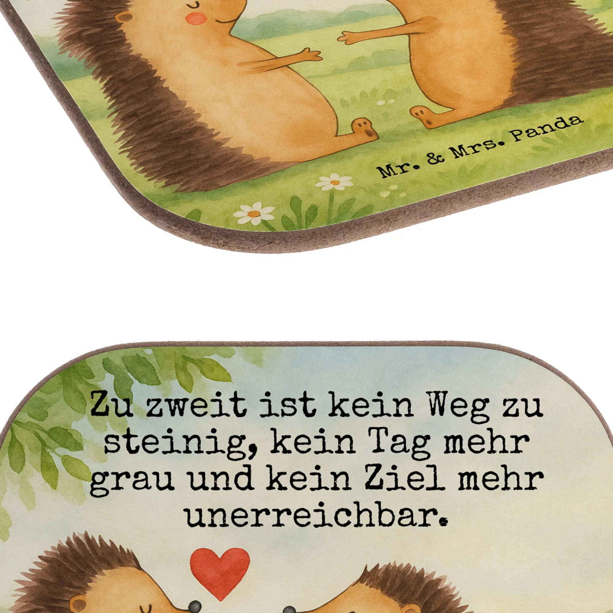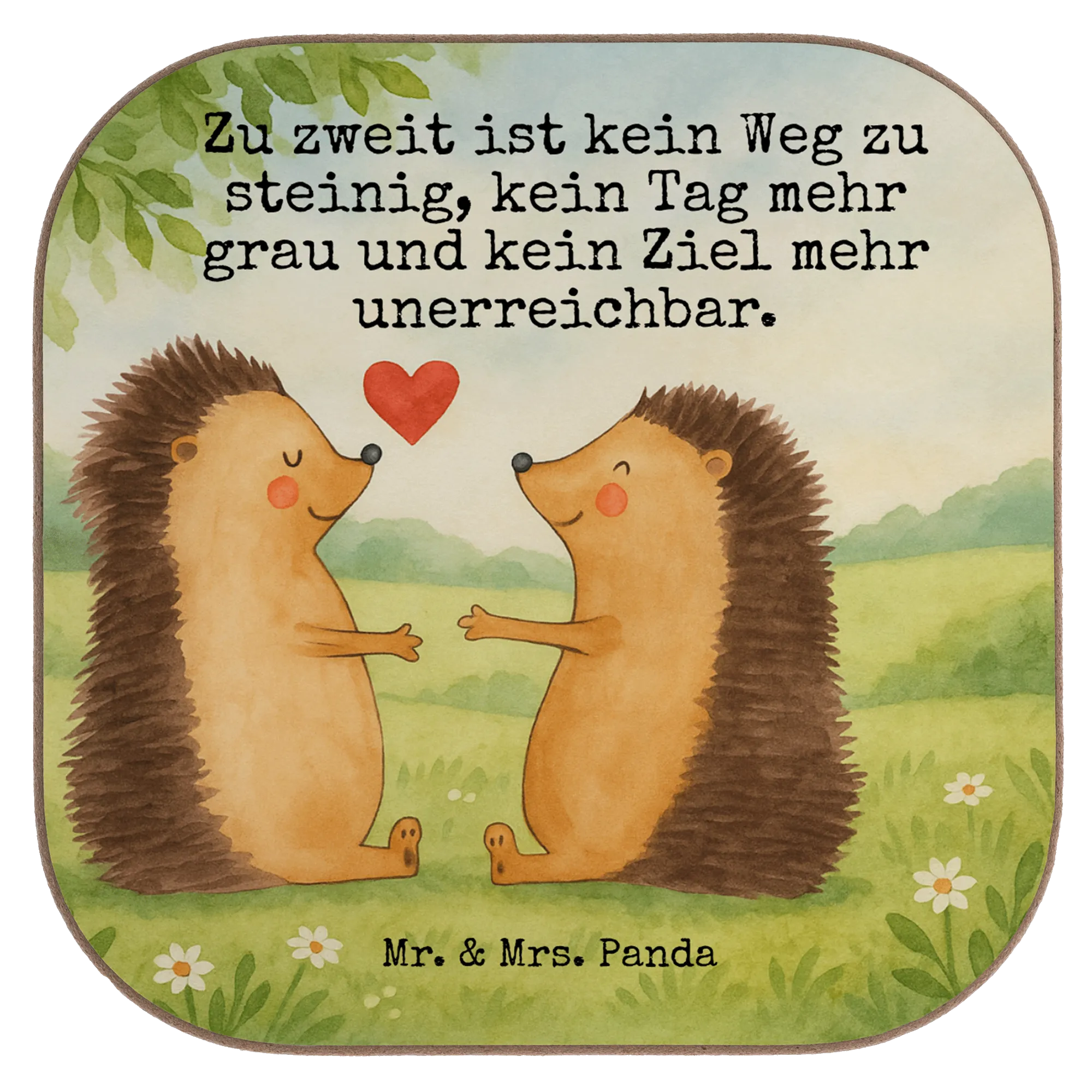 Wunderschön und berührend – so präsentiert sich die Liebe zwischen zwei Igeln bei Mr. & Mrs. Panda. Die beiden Igel reichen sich vertrauensvoll ihre Pfoten, ein Sinnbild für Halt und Geborgenheit. Jedes Detail dieses Aquarellmotivs ist mit Großzügigkeit und Wärme gefüllt, genau wie die Liebe, die es darstellt. Der bezaubernde Slogan 'Zu zweit ist kein Weg zu steinig, kein Tag mehr grau und kein Ziel mehr unerreichbar' bringt es auf den Punkt: Zusammen in Liebe vereint, kann das Paar jedes Hindernis überwinden. Eine inspirierende Darstellung der Liebe, ideal als Hochzeitsgeschenk oder als Erinnerung, dass alle Wege zusammen leichter zu gehen sind.