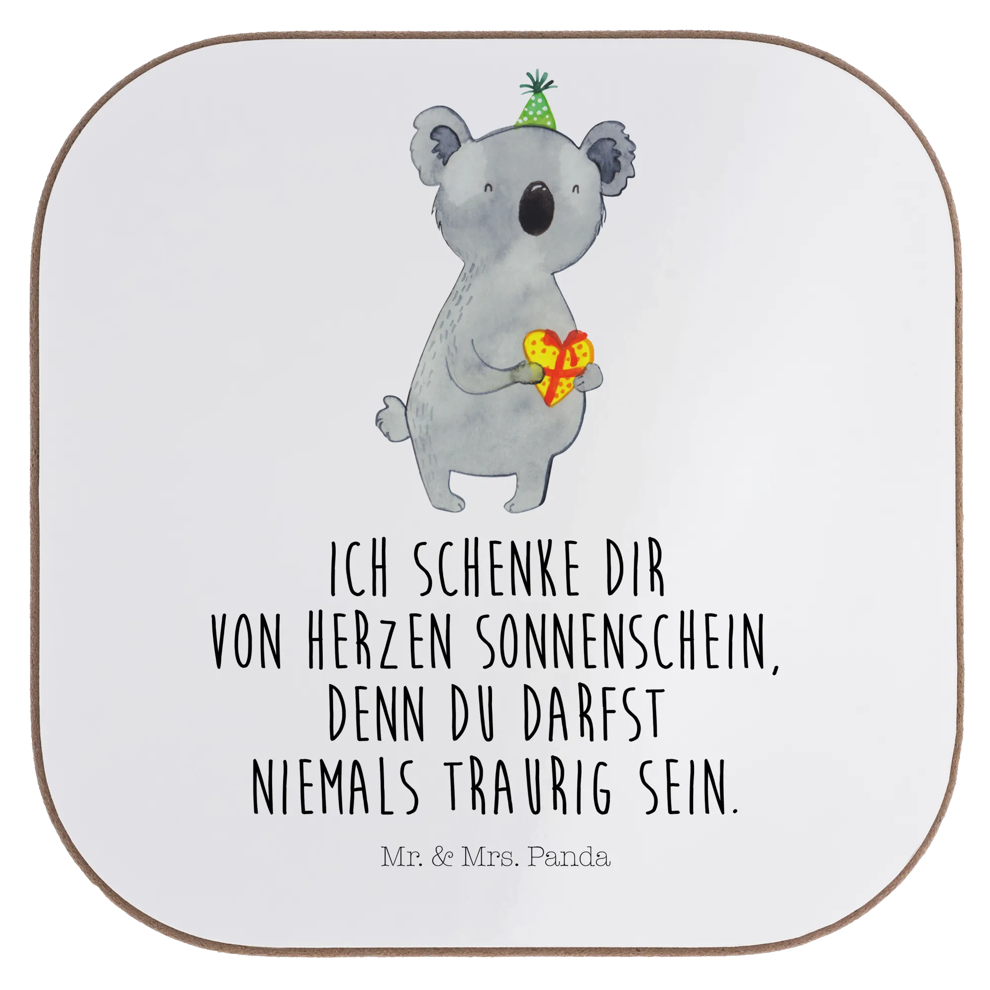 Mit unserem Koala Geschenk-Motiv laden wir dich zu fröhlichen Feiern ein! Der süße Koala, der ein Herzgeschenk hält, ist ein Symbol für Freundschaft und Herzlichkeit. Der Spruch ‘Ich schenke dir von Herzen Sonnenschein, denn du darfst niemals traurig sein’ bringt Freude und Wärme in jedes Miteinander und erinnert uns daran, die positiven Seiten des Lebens zu schätzen. Dieses Motiv bringt Spaß und Glück zu jedem Anlass und sorgt dafür, dass jeder Tag ein bisschen heller wird!