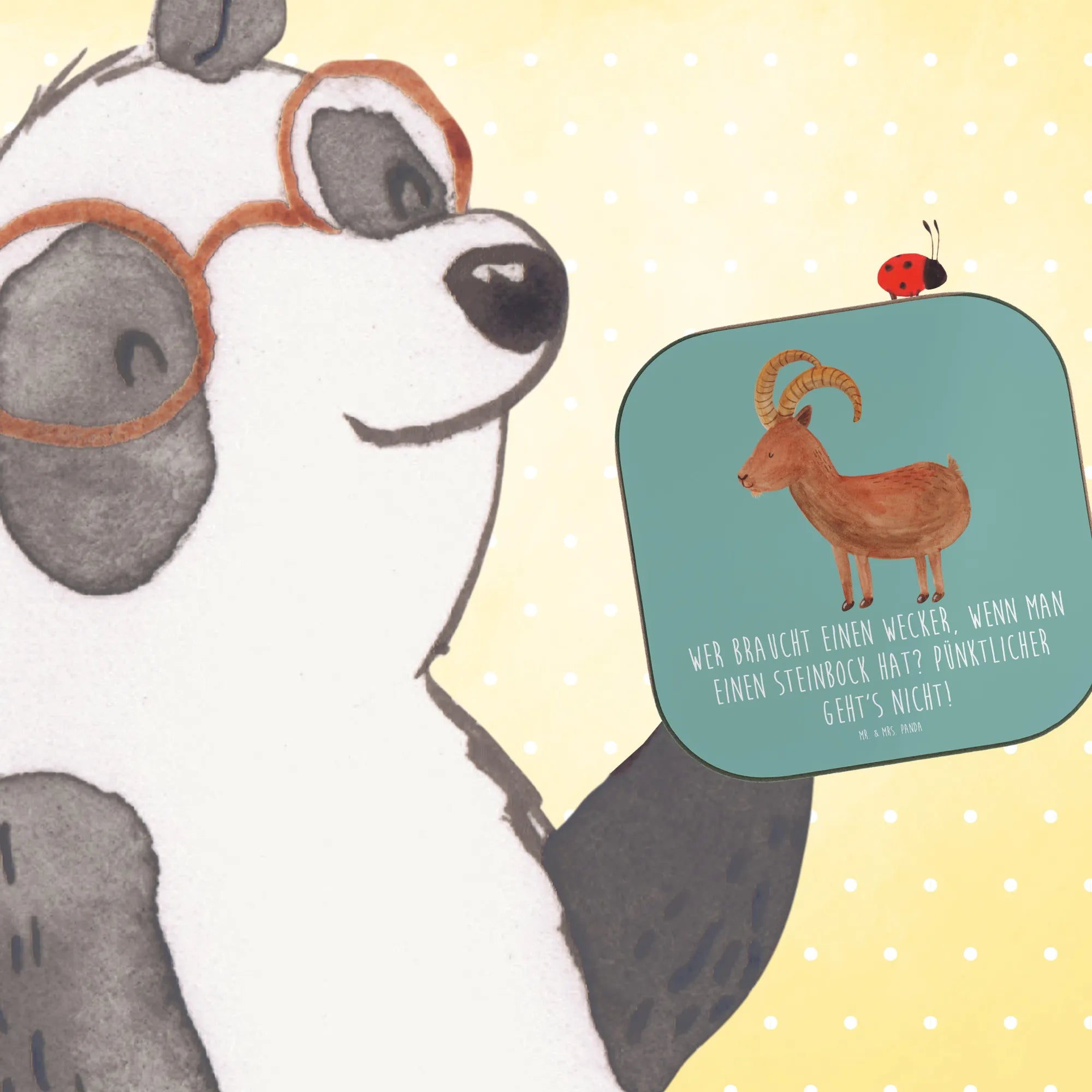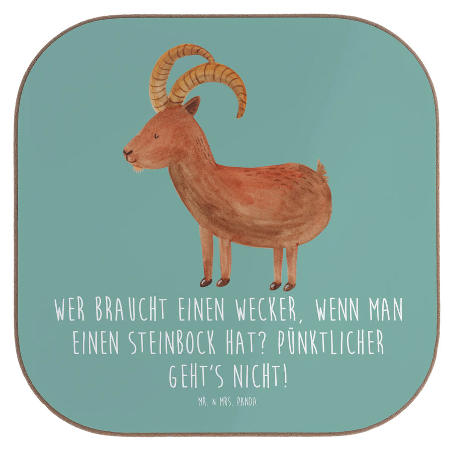 Mr. & Mrs. Panda Untersetzer Steinbock – niedlich, praktisch und voller Persönlichkeit. Unser quadratischer Glasuntersetzer aus der Sternzeichen-Kollektion vereint liebevoll gezeichnete Aquarell-Illustration und einen frechen Spruch: "Wer braucht einen Wecker, wenn man einen Steinbock hat? Pünktlicher geht's nicht!" 🐐💙 Dieser Untersetzer ist mehr als nur ein Bierdeckel – er ist ein Statement auf deinem Tisch.