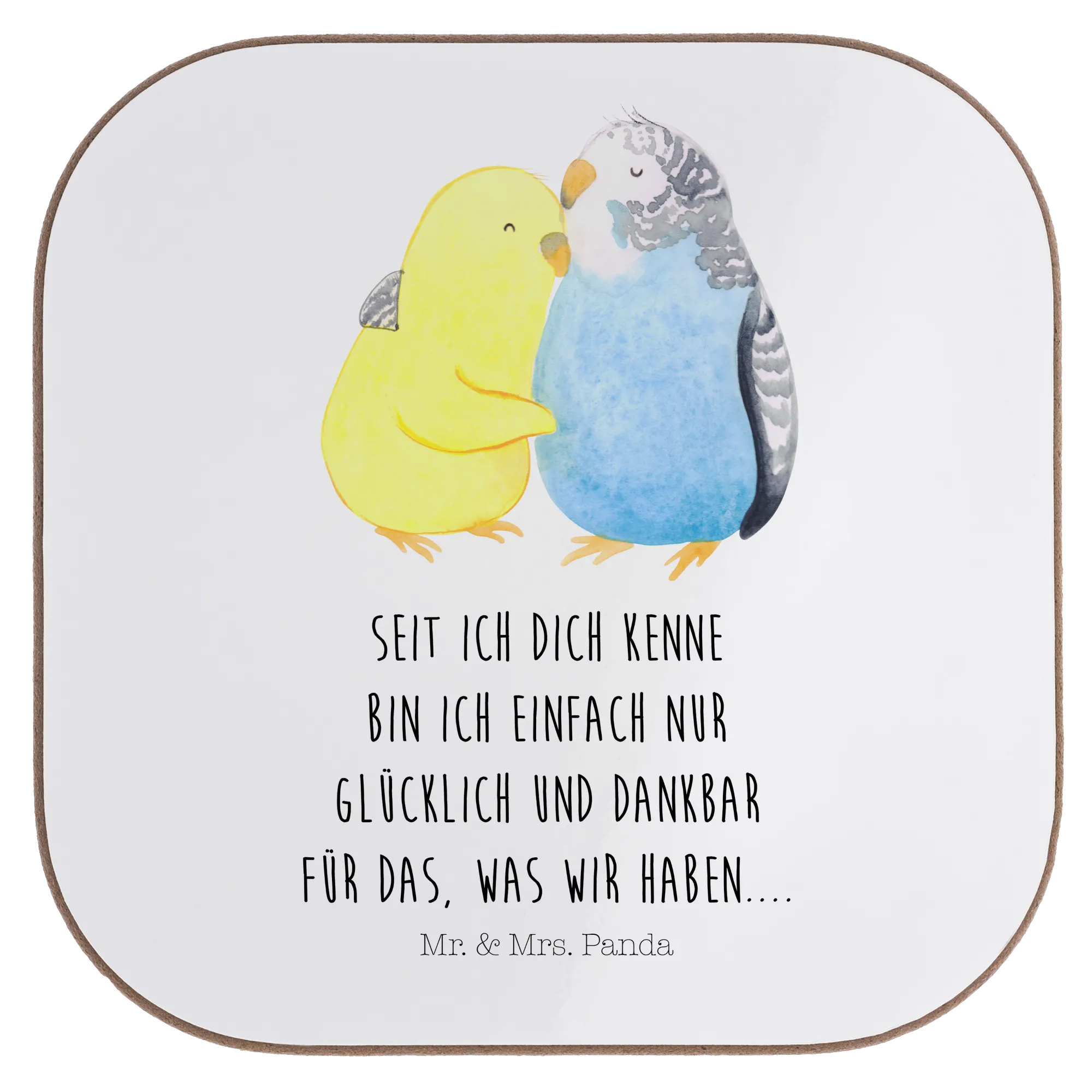 Du suchst nach dem perfekten Geschenk für deinen Liebling? Dann ist der wunderschöne Untersetzer "Wellensittich Liebe" aus der Kollektion Liebe von Mr. & Mrs. Panda genau das Richtige für dich! Dieser quadratische Untersetzer, bedruckt mit einem zuckersüßen Motiv, zeigt ein Paar Wellensittiche, die sich liebevoll aneinander kuscheln. Die sanften, pastellfarbenen Aquarelltöne in Gelb und Blau strahlen Wärme und Harmonie aus und machen ihn zu einem einzigartigen Accessoire für deinen Ess- und Couchtisch.