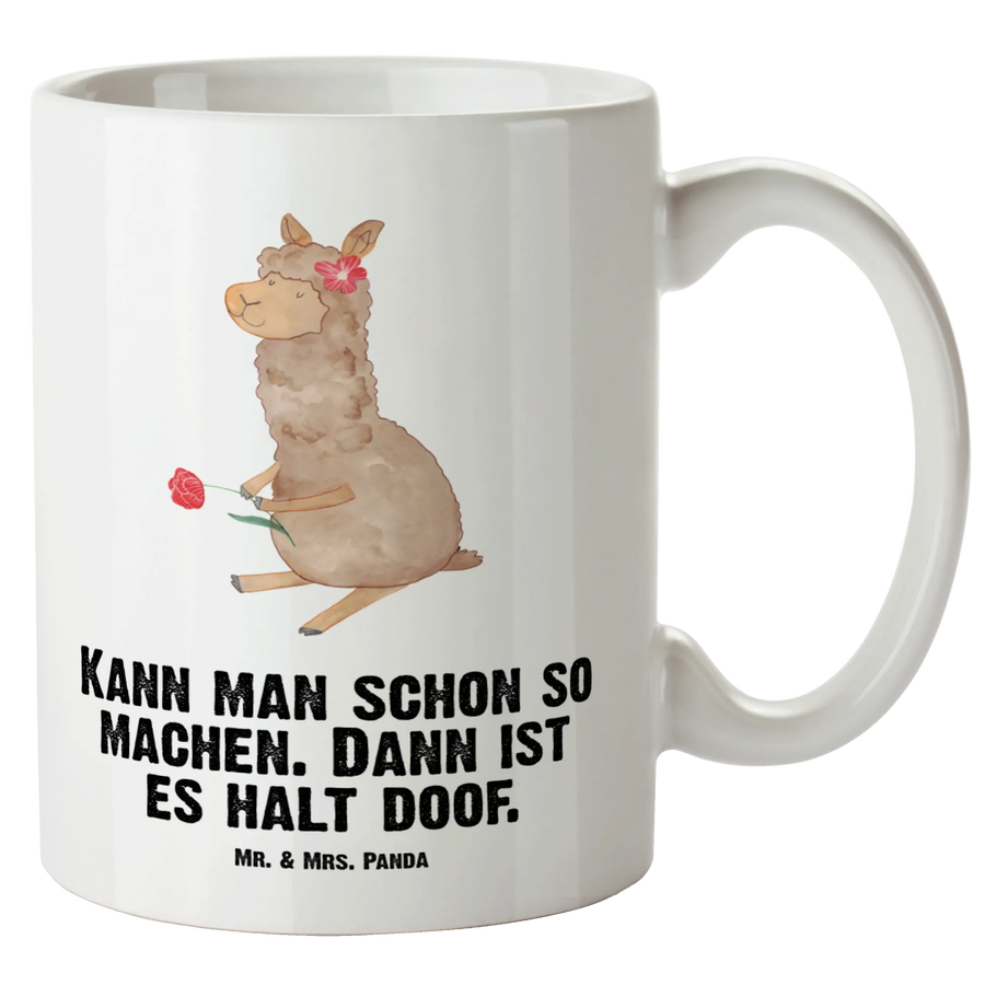 Dieses niedliche Alpaka, das mit einer Blume im Haar und einer weiteren in der Hand posiert, bringt uns dazu, das Leben mit einem Lächeln zu betrachten. Das Alpaka strahlt eine unbeschwerte Freude aus, die uns alle daran erinnert, dass die kleinen Dinge im Leben besondere Momente schaffen. Sein Motto 'Kann man schon so machen. Dann ist es halt doof.' ermutigt uns, das Leben mit Humor zu nehmen, auch wenn die Dinge nicht nach Plan laufen. Lass dich von diesem charmanten Motiv inspirieren, denn es zeigt, dass auch die fluffigsten Wesen uns lehren können, das Leben leicht zu nehmen und auf die schönen Dinge zu achten. Egal, ob als Alpaka Dekor oder als lustiges Geschenk für einen Freund, dieses Motiv wird jedem ein Lächeln ins Gesicht zaubern. Bringe ein Stück Lebensfreude in dein Zuhause oder verschenke es an jemanden, der ein bisschen mehr Freude gebrauchen kann.