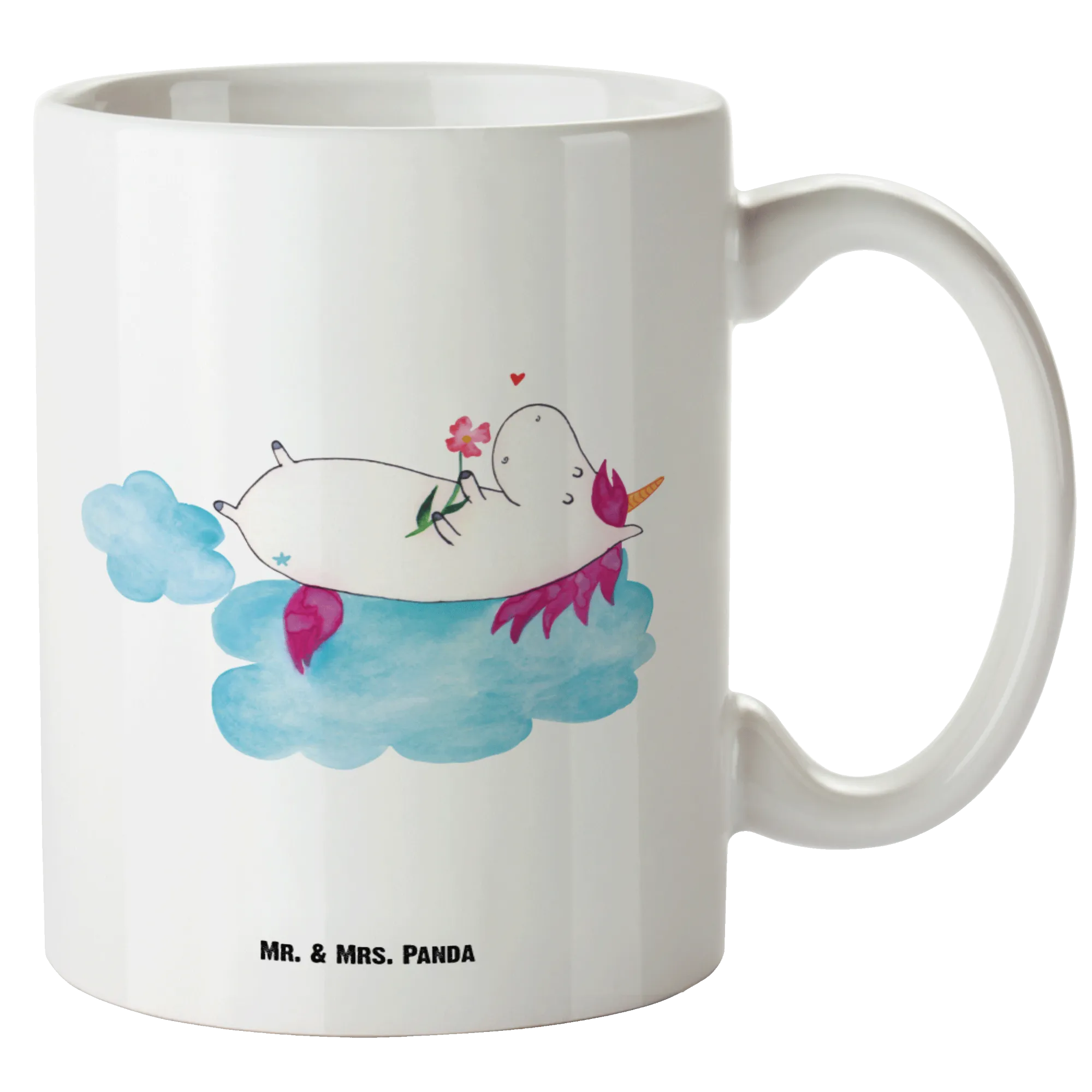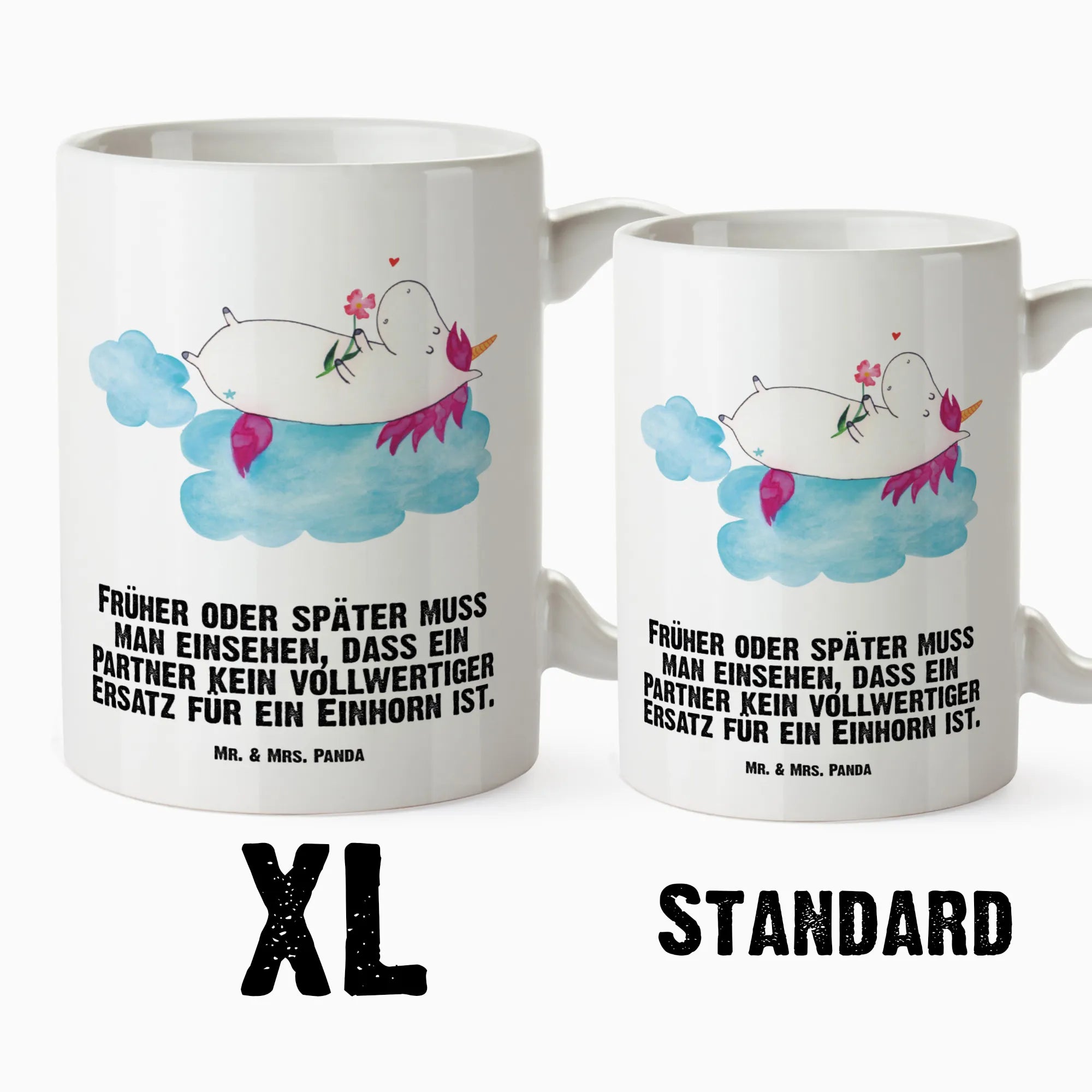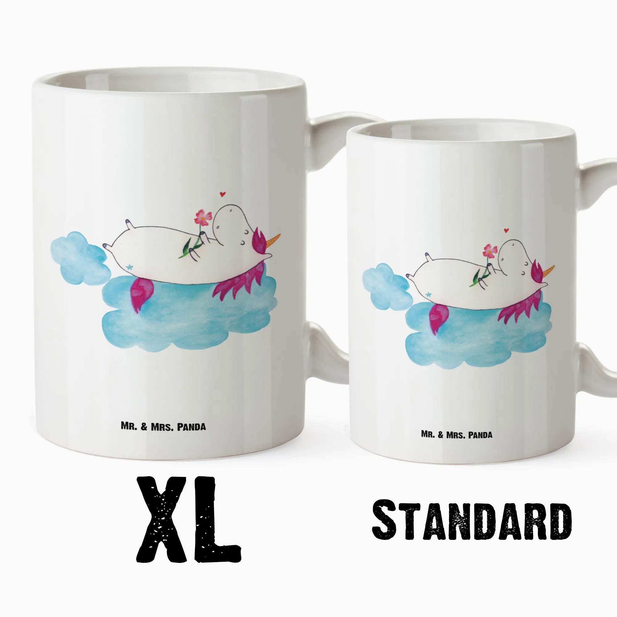 Herzlich willkommen in der magischen Welt von Mr. & Mrs. Panda mit unserer bezaubernden XL Tasse "Einhorn verliebt auf Wolke"! Diese besondere Kaffeetasse ist nicht nur ein wunderschönes Accessoire für Deine morgendliche Routine, sondern auch das perfekte Geschenk für all diejenigen, die Einhörner und kleine Liebesbeweise schätzen.