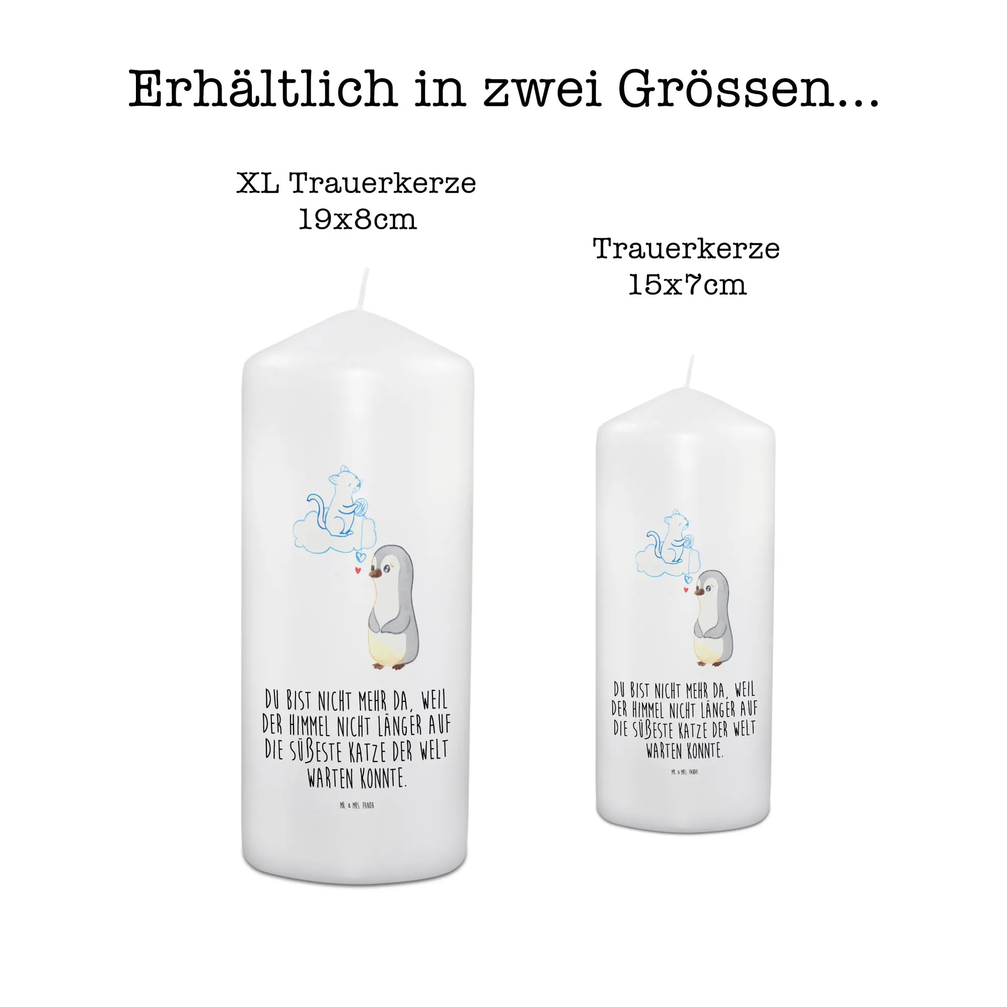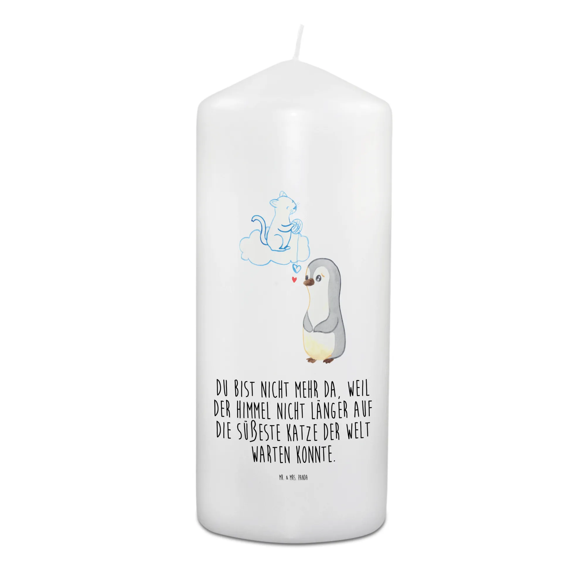 This poignant motif captures the essence of love and loss with a tender touch. A sad little penguin, tears rolling down its cheeks, gazes up at a cloud where its cherished cat rests peacefully. The saying, 'Du bist nicht mehr da, weil der Himmel nicht länger auf die süßeste Katze der Welt warten konnte,' beautifully encapsulates the idea that some souls are too sweet to remain on earth. In this creation, we are reminded that every beloved pet leaves a legacy of laughter, joy, and unforgettable memories. Grief may linger, but so does the happiness they gave us daily. This artwork serves as a comforting embrace during difficult times, inviting us to remember the joy they brought while allowing us to grieve.