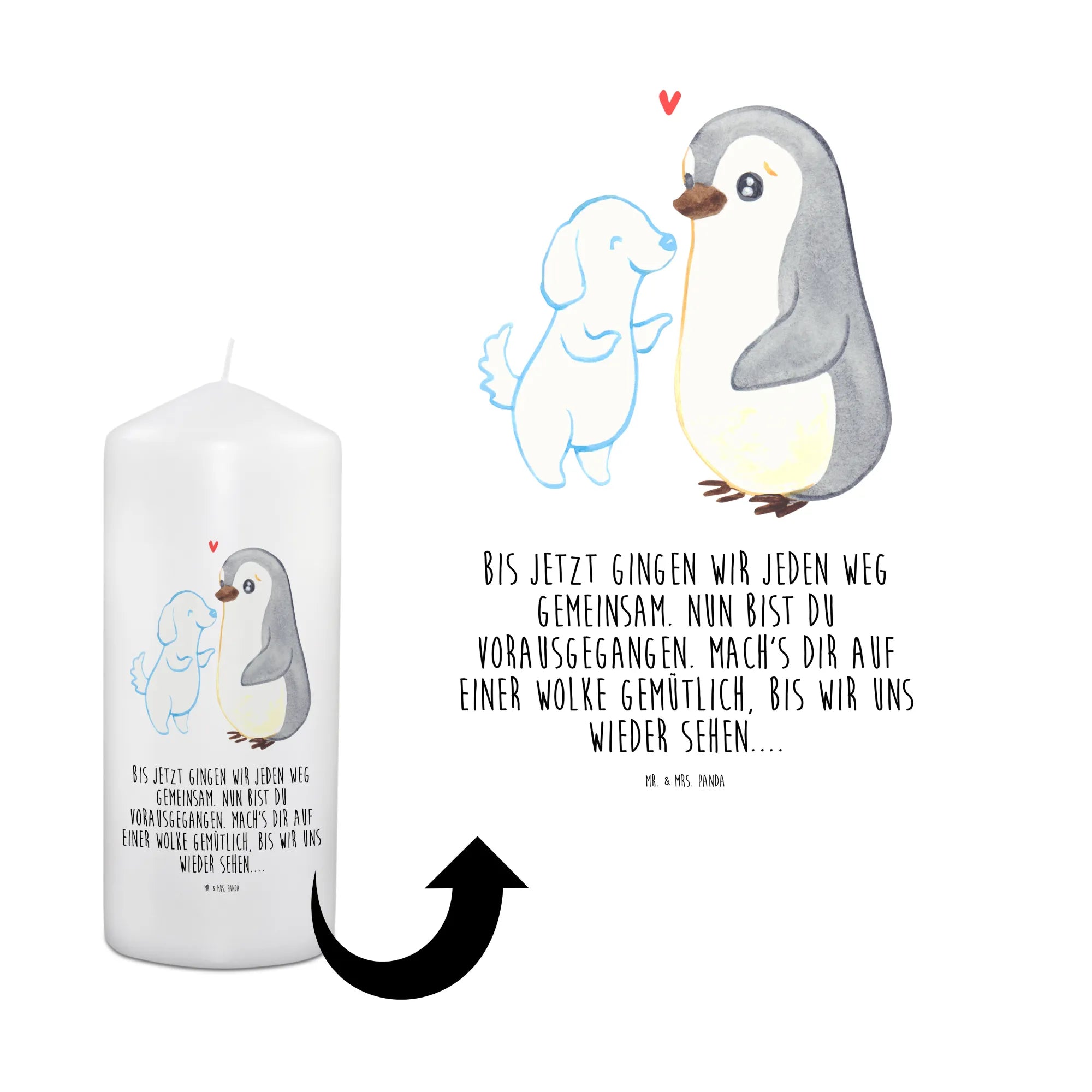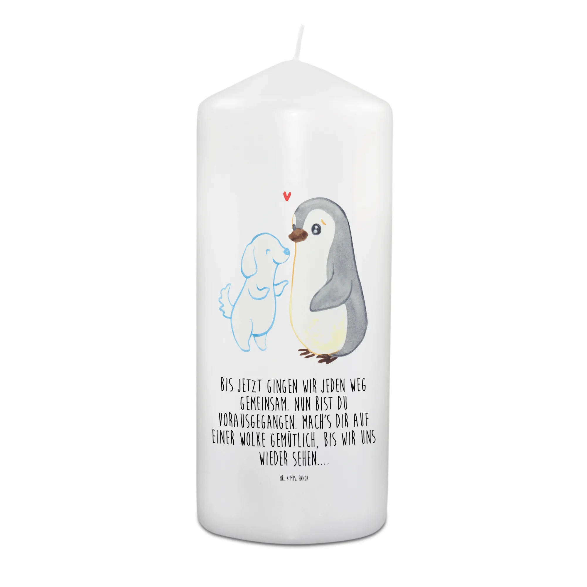 This heartwarming motif depicts a melancholic penguin who deeply misses his furry friend. In the sky above, we see the outline of a beloved dog transformed into a gentle cloud, reminding us of treasured moments. The heart floating softly between them illustrates the profound love that never fades, even in separation. The saying 'Until now, we walked every path together. Now you have gone ahead. Make yourself cozy on a cloud until we meet again...' speaks volumes about the unbreakable bond shared between a pet and its owner. Every brush of fur and tail wag is still felt, as the penguin hopes for the day they will reunite. This piece invites us to hold onto those sweet memories while embracing the journey of love and loss.