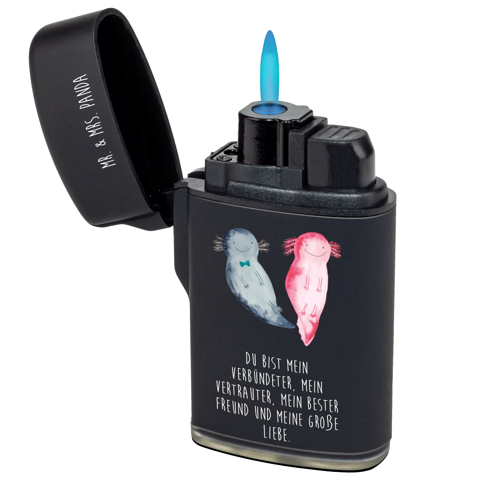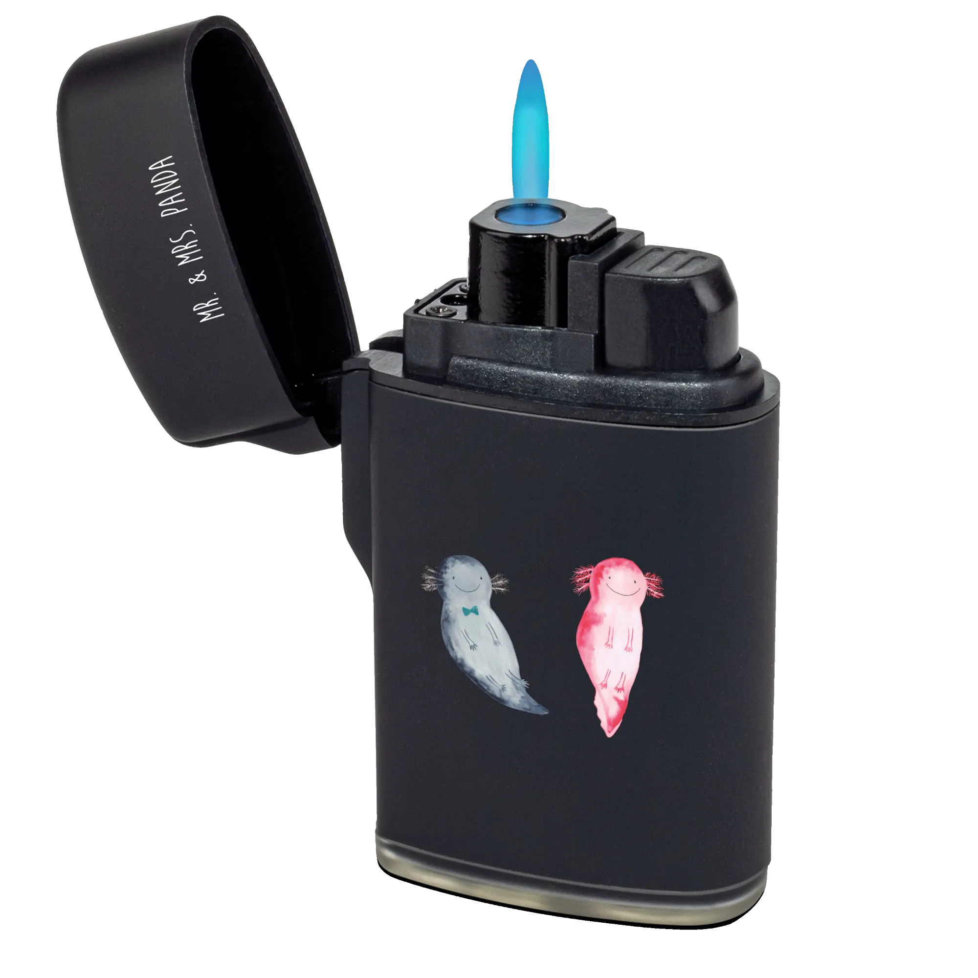 Das Feuerzeug Axolotl Axel+Lotte von Mr. & Mrs. Panda ist das ideale Geschenk für alle, die ein Herz für niedliche Motive und praktische Accessoires haben. Mit seinem entzückenden Design, das die beiden fröhlichen Axolotl zeigt, zaubert dieses Feuerzeug jedem ein Lächeln ins Gesicht. Ob für den eigenen Gebrauch oder als ausgefallenes Geschenk – dieses Feuerzeug ist perfekt für jeden Anlass.