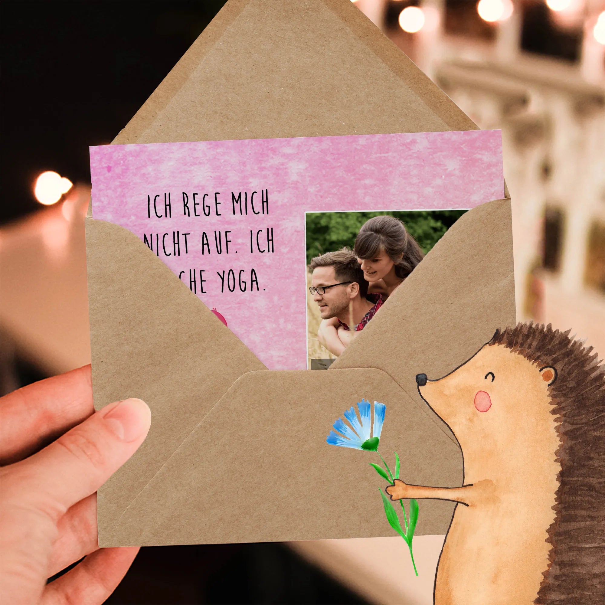Die personalisierte Foto Deluxe Karte mit dem bezaubernden Flamingo-Motiv aus der Flamingo-Kollektion von Mr. & Mrs. Panda ist der perfekte Begleiter für besondere Anlässe! Mit dem witzigen Slogan "Ich rege mich nicht auf. Ich mache Yoga." ist sie eine liebevolle Geschenkidee für Freunde, die Achtsamkeit und Entspannung in ihr Leben bringen möchten.