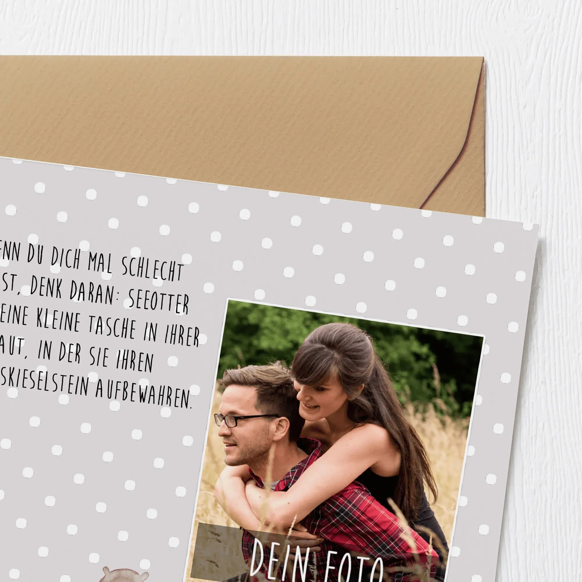 Egal ob für Geburtstage, Hochzeiten oder als kleine Aufmerksamkeit zwischendurch, diese personalisierte Karte ist immer die richtige Wahl. Bringe deine eigenen Fotos und Wünsche ein – die Innenseite bietet genügend Platz für persönliche Botschaften! Mit dem Slogan "Wenn du dich mal schlecht fühlst, denk daran: Seeotter haben eine kleine Tasche in ihrer Haut, in der sie ihren Lieblingskieselstein aufbewahren" wirst du das Herz des Empfängers sicherlich erobern.