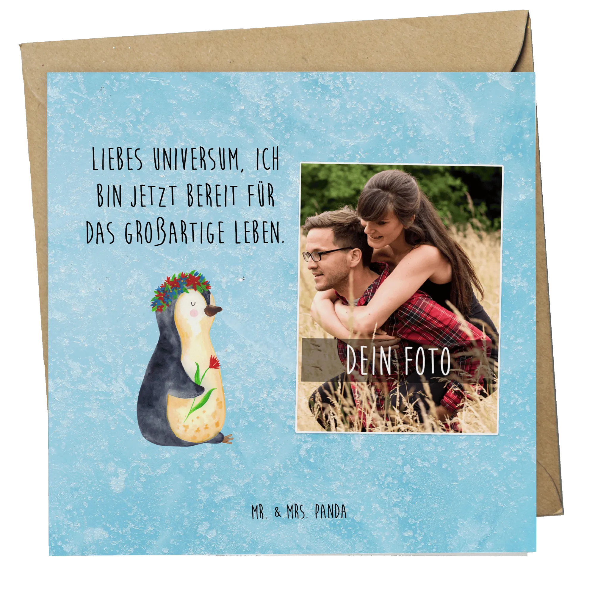 Personalisierte Foto Deluxe Karte Pinguin Blumen - Kreidetafel