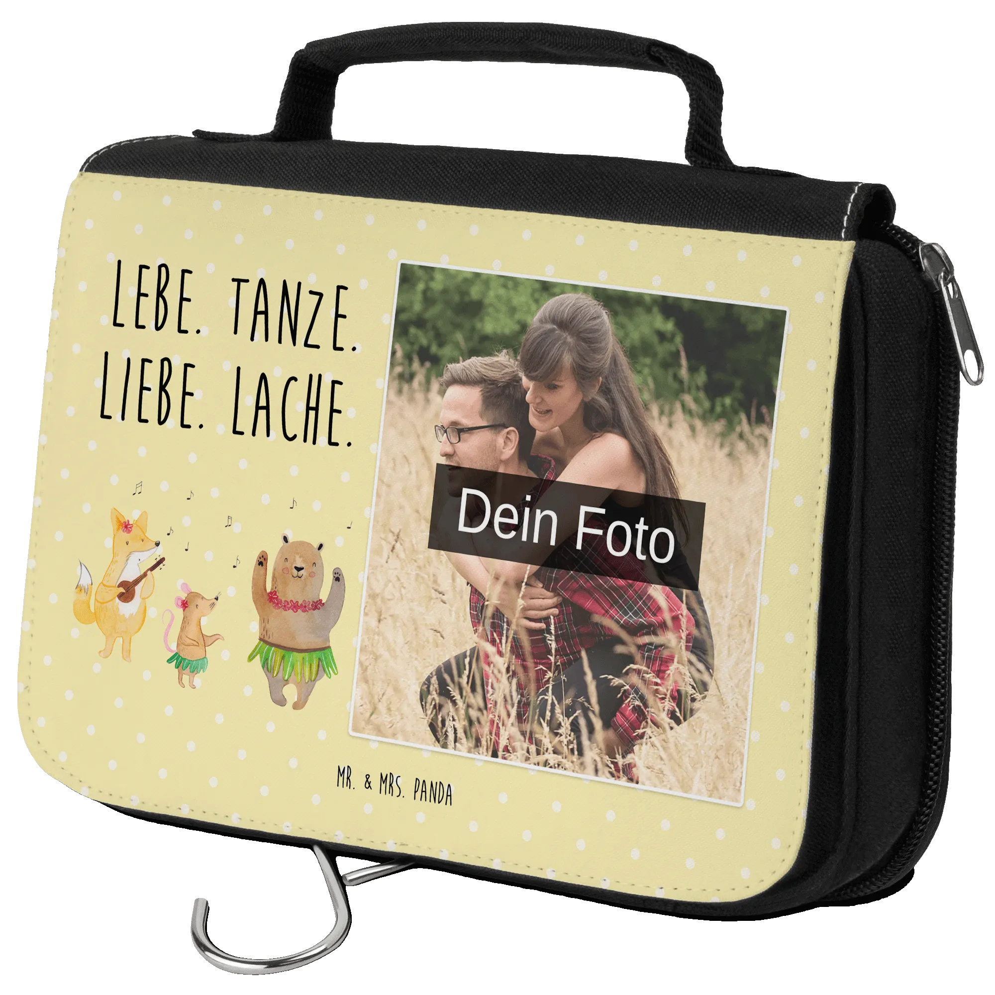 Dieser liebevoll gestaltete Kulturbeutel verbindet praktisch mit fröhlich: die Waldtiere in Hula-Röcken aus unserer Small World Kollektion zaubern dir sofort ein Lächeln ins Gesicht. Perfekt als Kulturbeutel mit Foto, Kosmetiktasche mit Foto oder Necessaire mit Bild – personalisierbar mit deinem Wunschfoto und dem guten Laune-Slogan "Lebe. Tanze. Liebe. Lache." 🌺